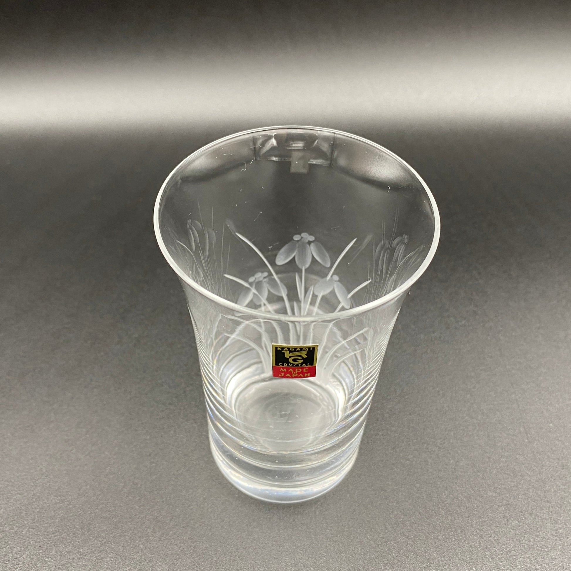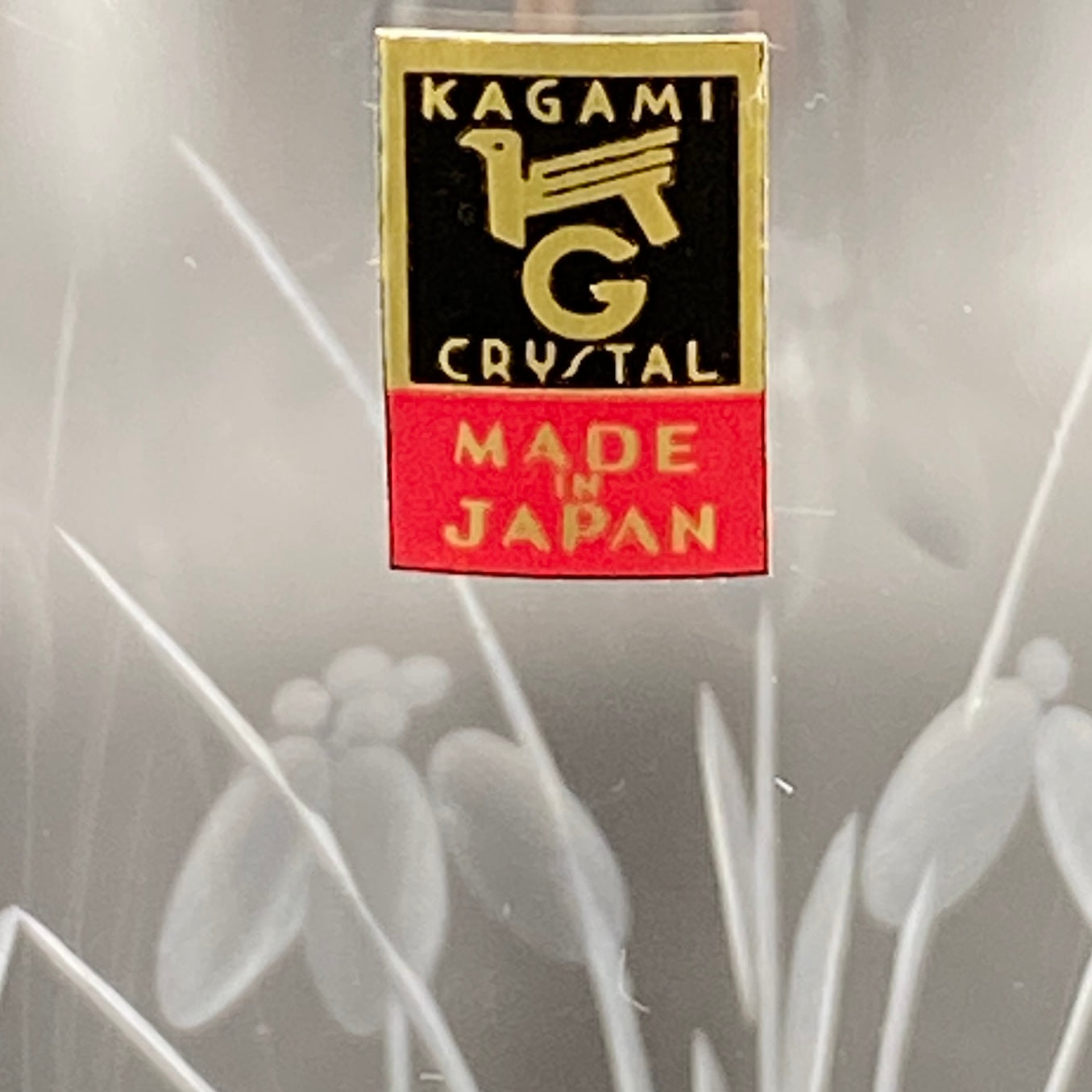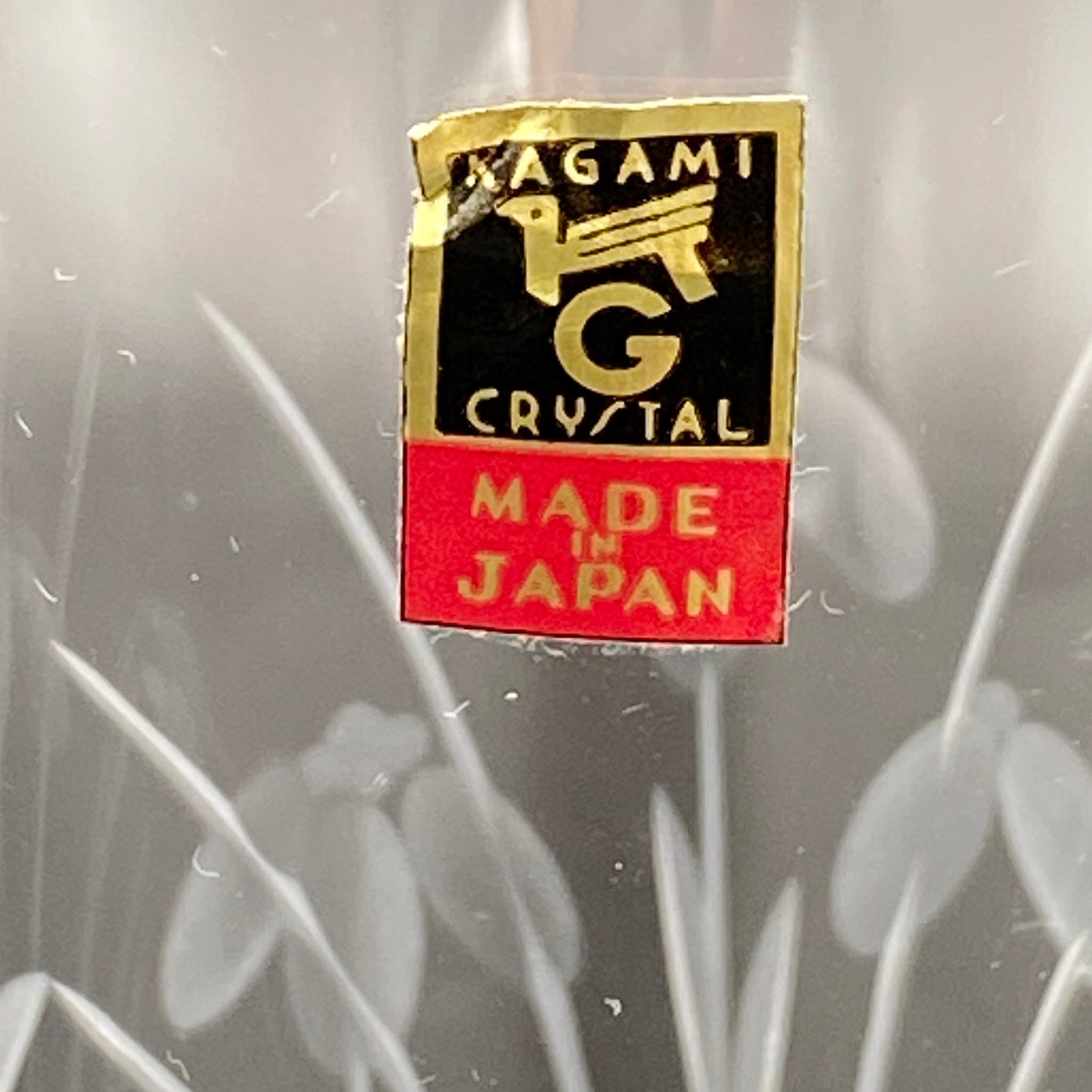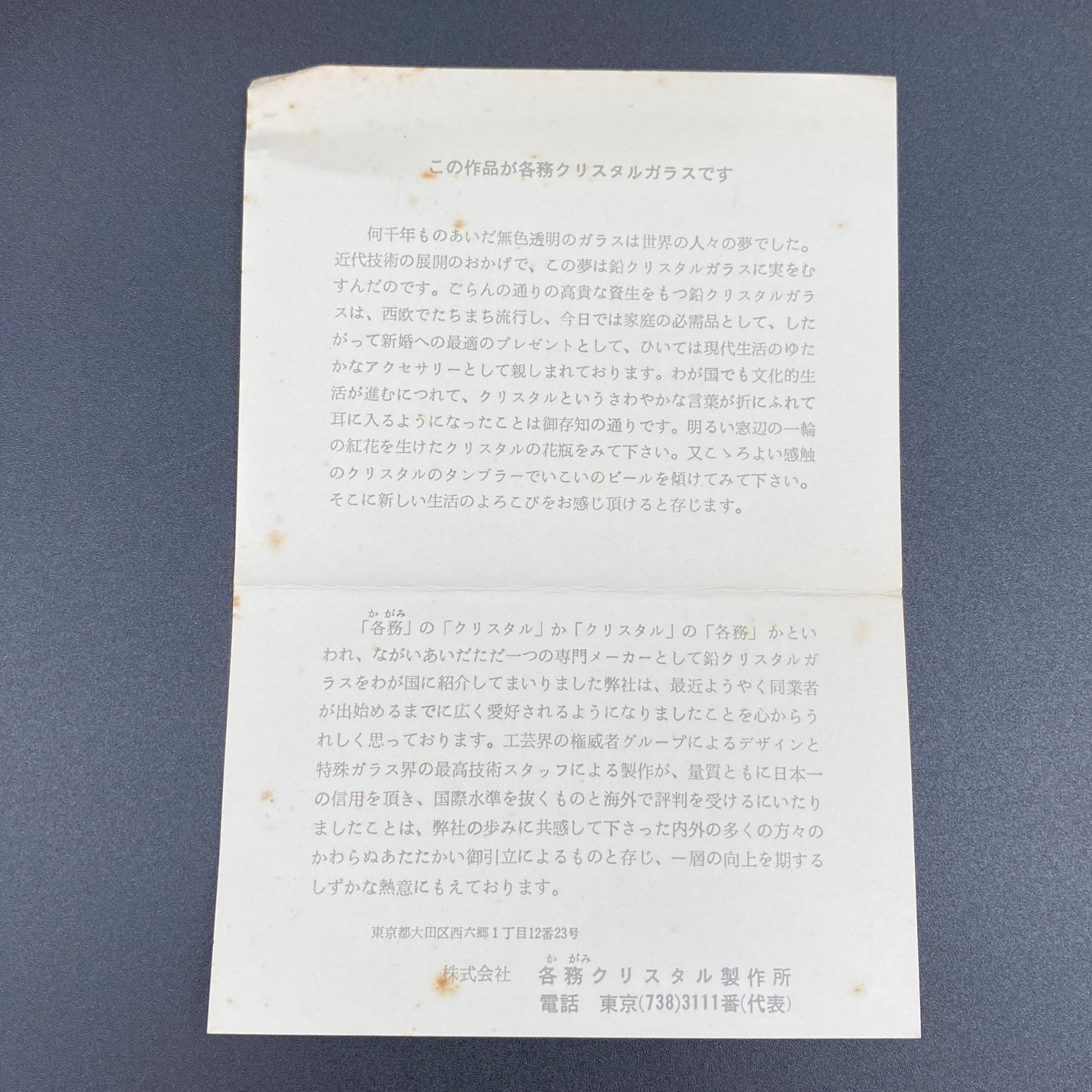 この商品は中古としての提供ではありますが状態は非常に良く、ロゴマークのシールが残されていることから未使用のものと思われます。また、ロゴマークのデザインや商品説明書に書かれている社名表記(各務クリスタル製作所)、本社住所(東京都大田区)から、1970年代にかけて制作されたものであると考えられます。