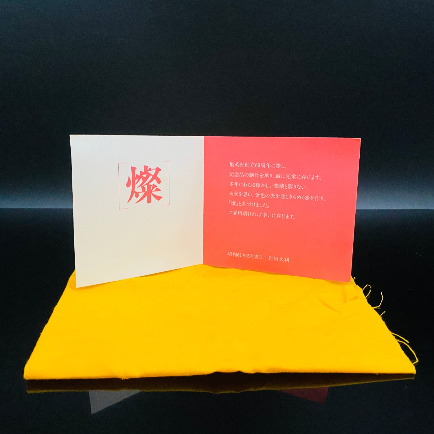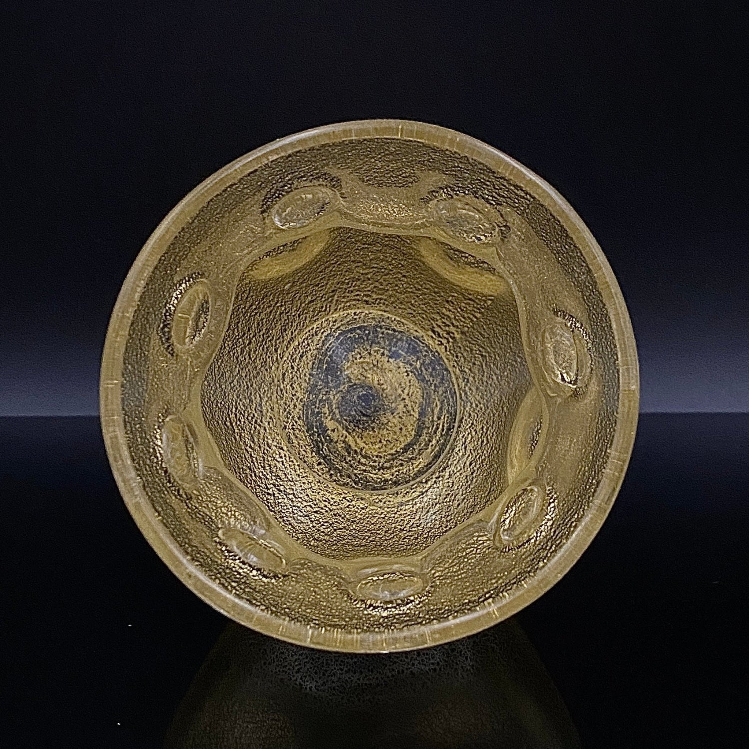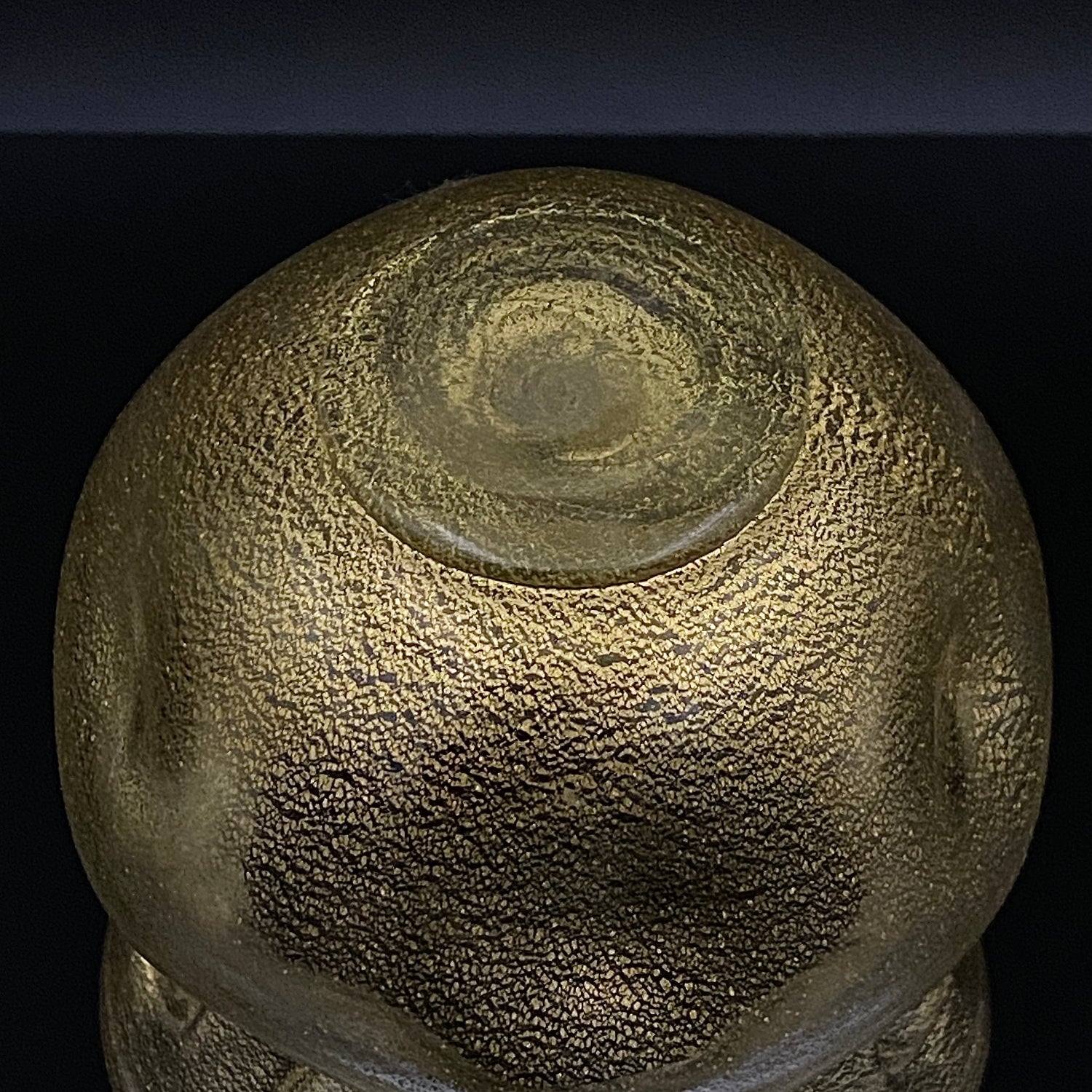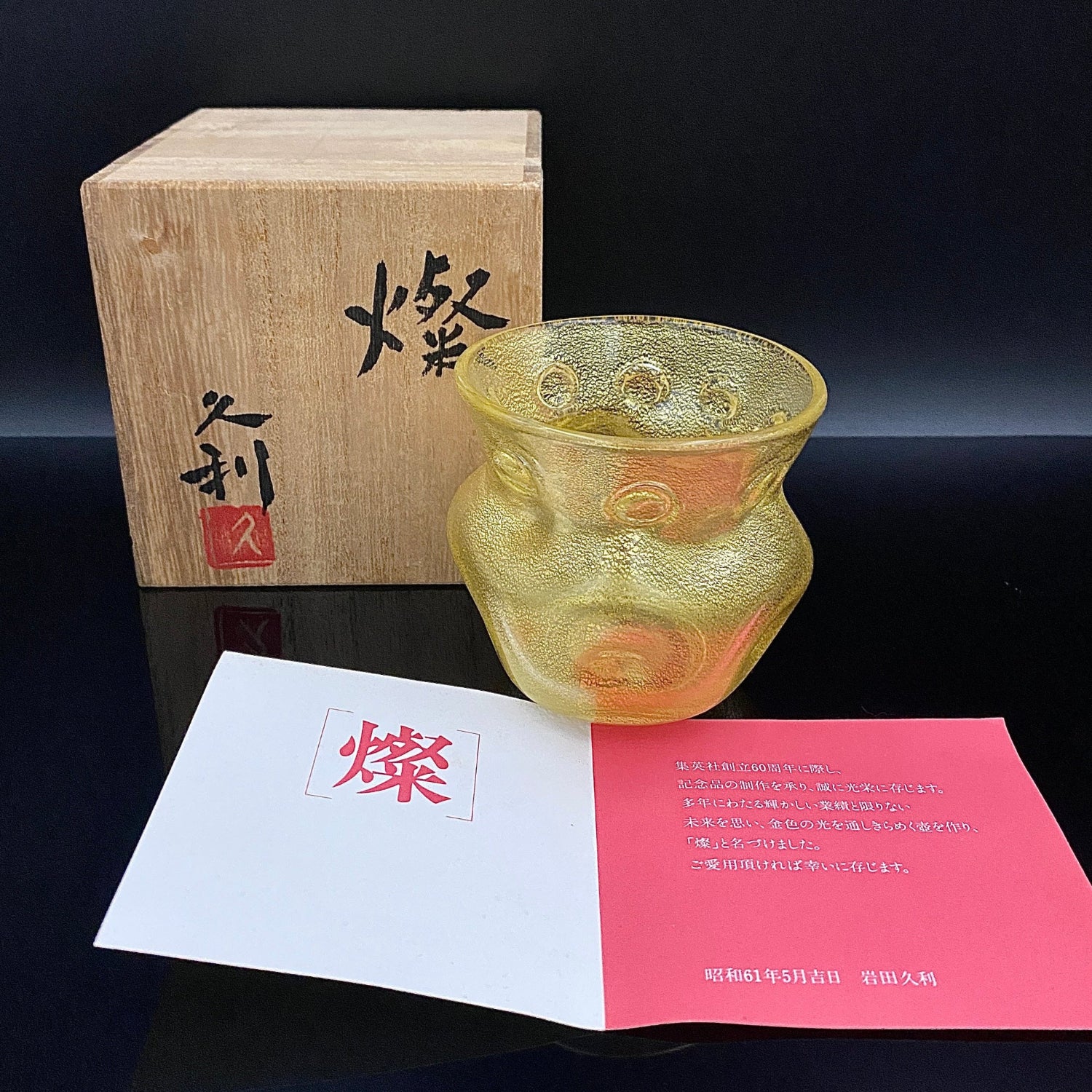 日本を代表するガラス工芸作家・岩田久利(1925–1994)の作品「燦(さん)」です。燦とは、『火の光が照りかがやいてあざやか、きらびやかで美しい』といった意味で、その名の通り、光り輝く存在感を放っています。全体にはきめ細やかな金箔が散りばめられ、手に取るとまるで光を抱いているかのような高級感があります。黄色味を帯びた外観は、実際には無数の微細な金箔によって構成されており、近くで見ると繊細な金細工の美しさが浮かび上がります。