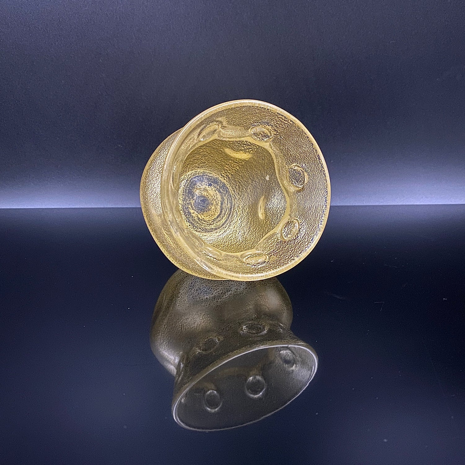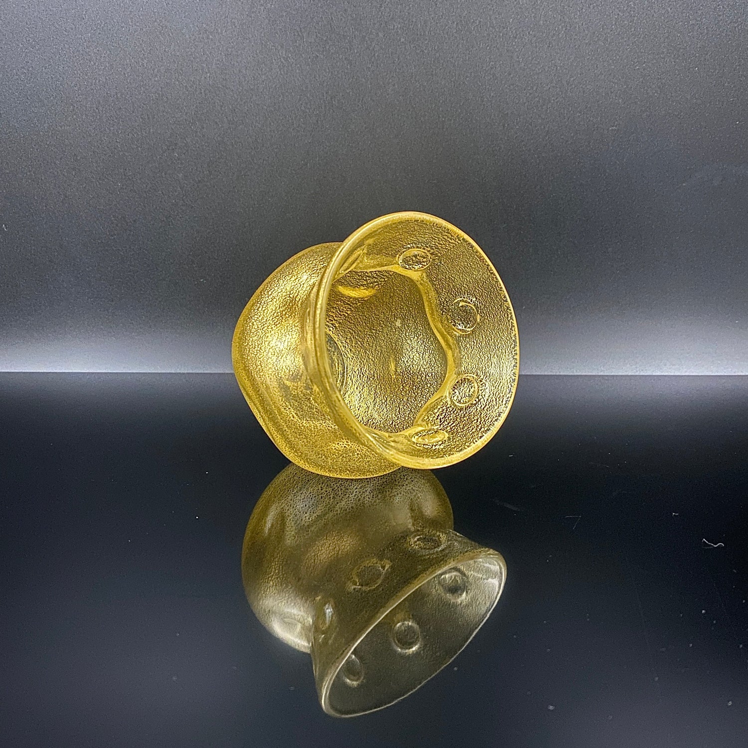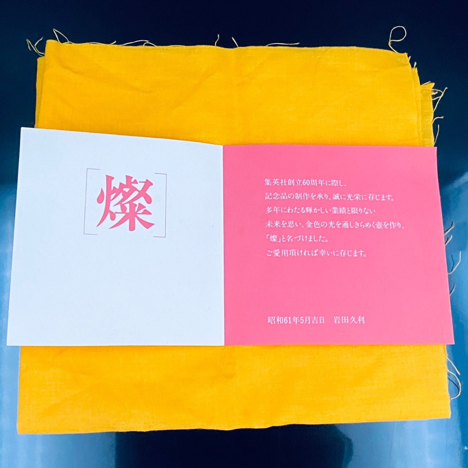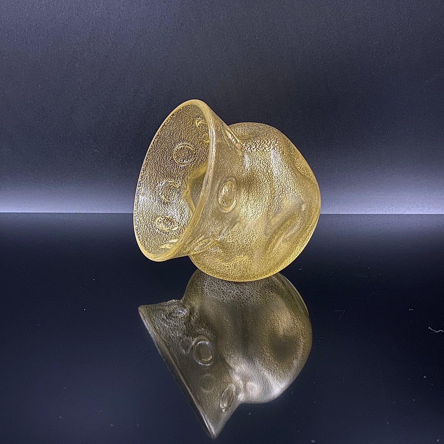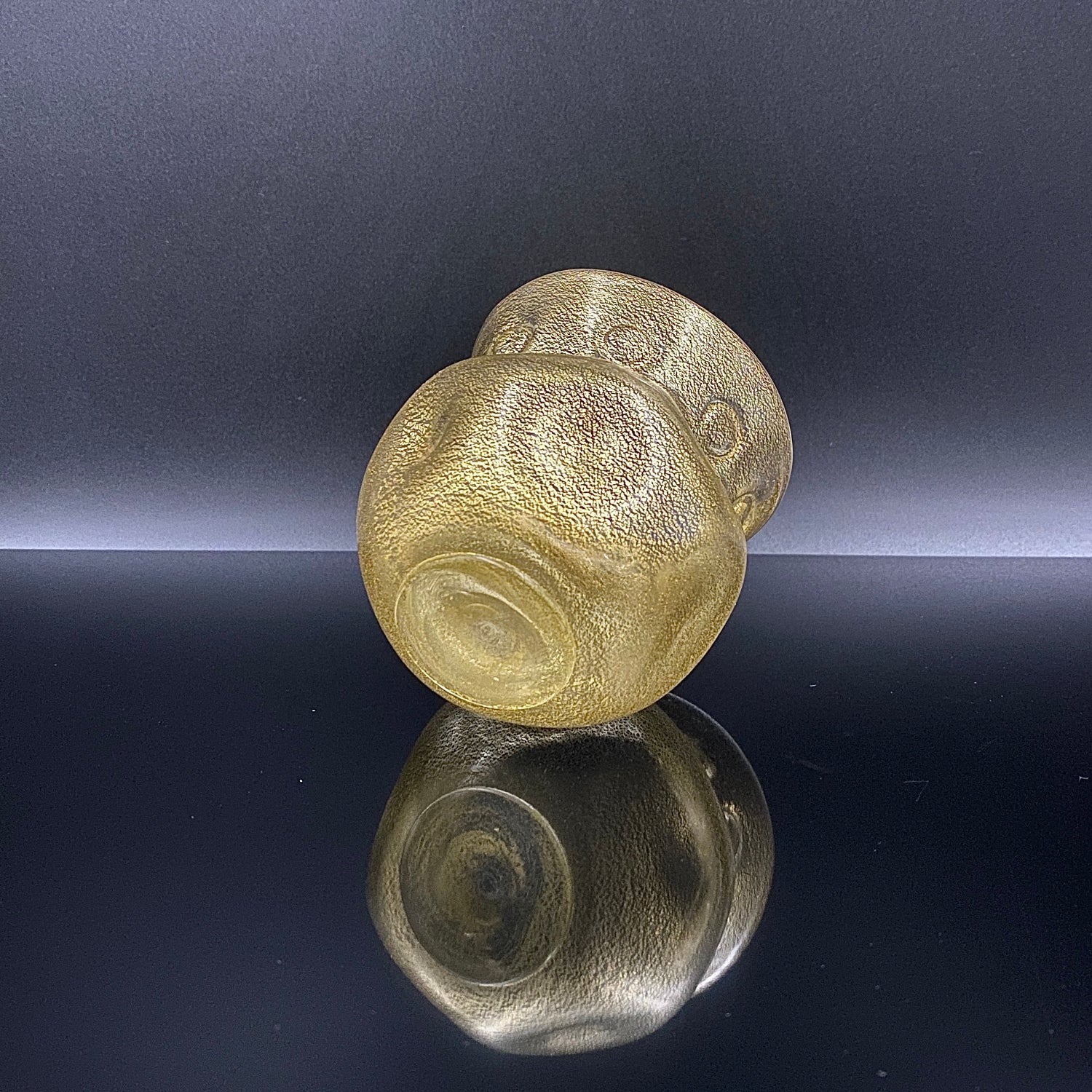 日本を代表するガラス工芸作家・岩田久利(1925–1994)の作品「燦(さん)」です。燦とは、『火の光が照りかがやいてあざやか、きらびやかで美しい』といった意味で、その名の通り、光り輝く存在感を放っています。全体にはきめ細やかな金箔が散りばめられ、手に取るとまるで光を抱いているかのような高級感があります。黄色味を帯びた外観は、実際には無数の微細な金箔によって構成されており、近くで見ると繊細な金細工の美しさが浮かび上がります。