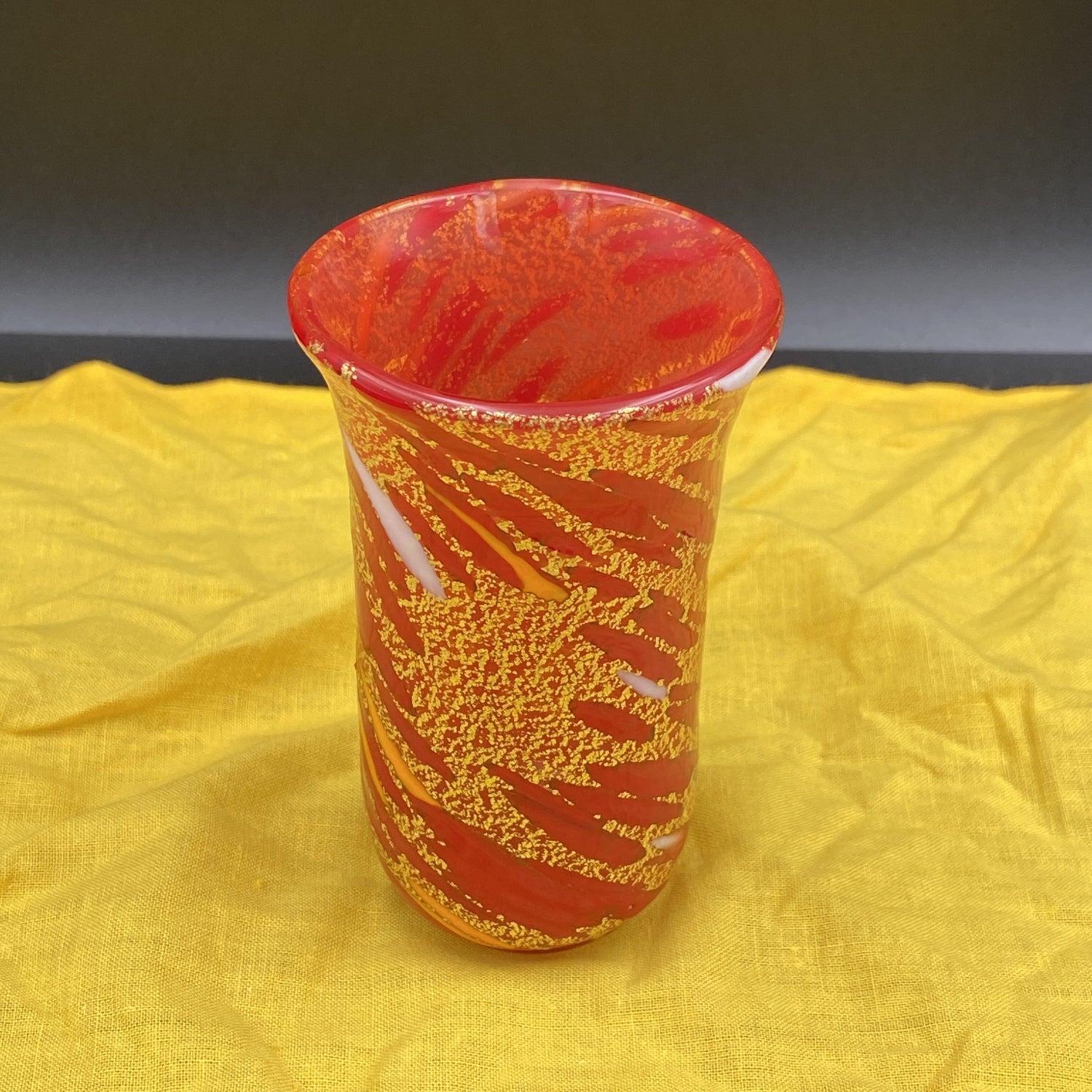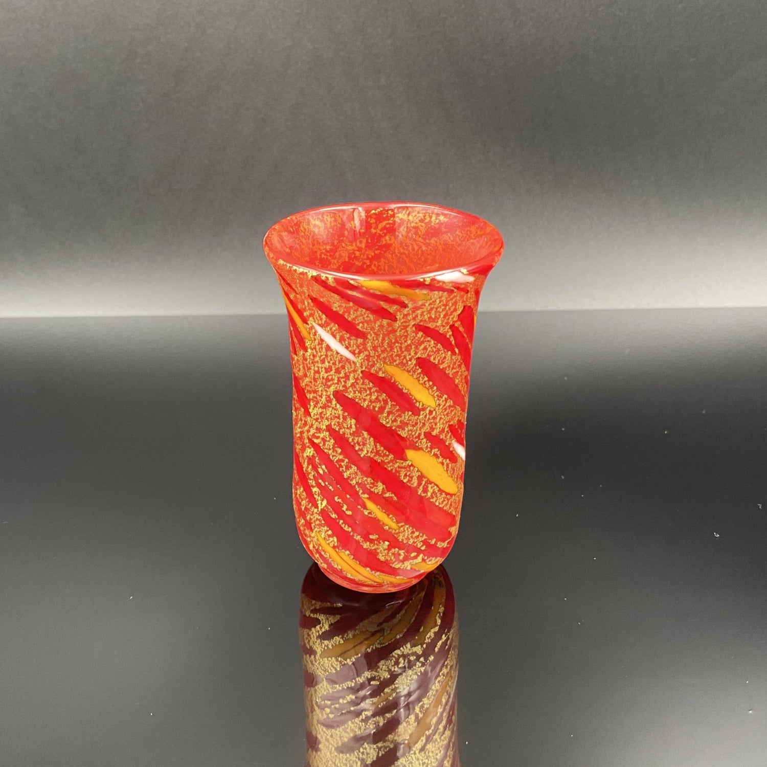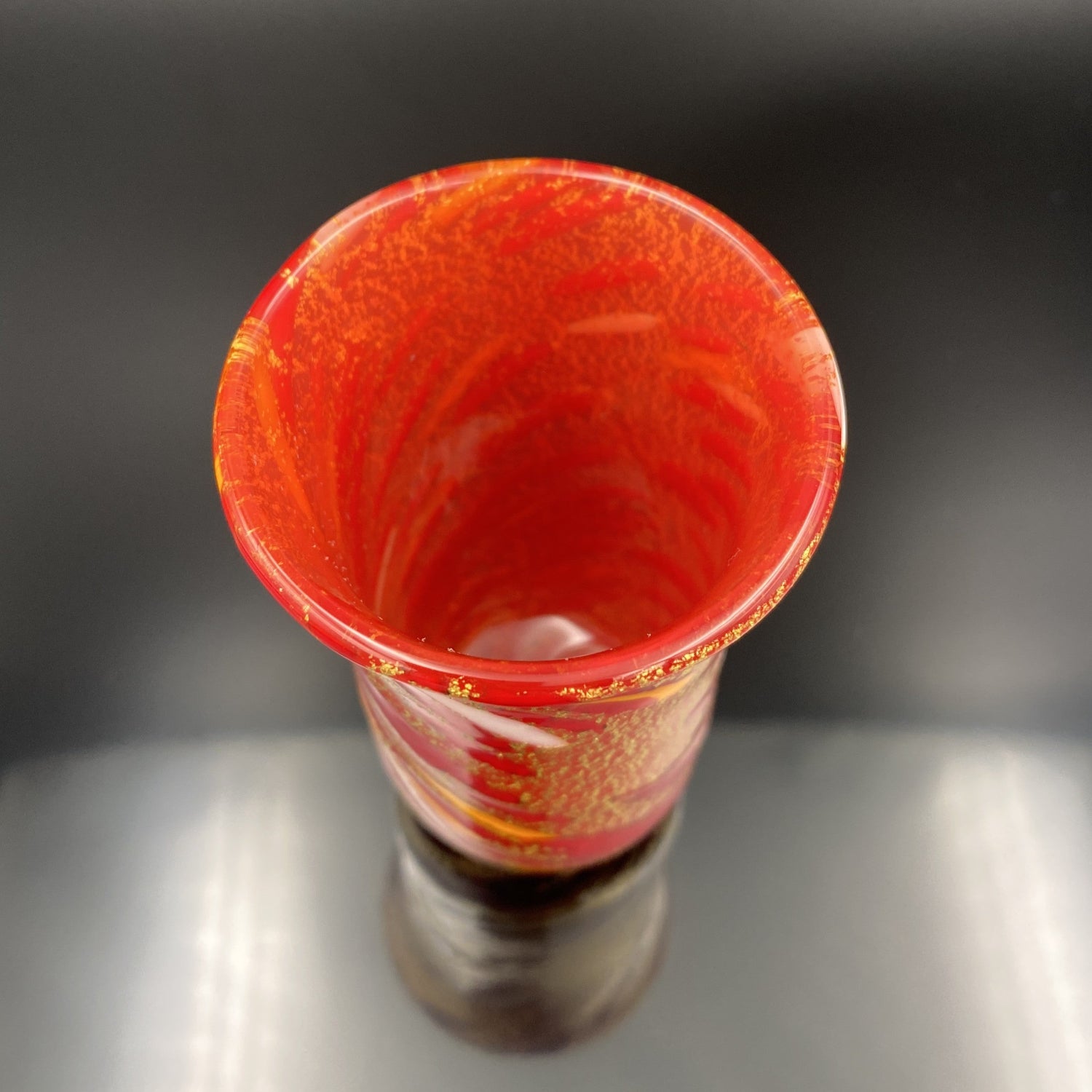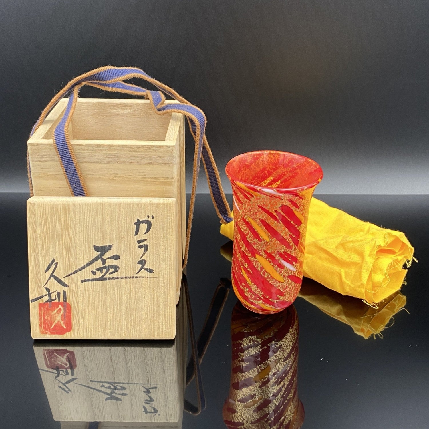 こちらは、日本の現代ガラス工芸を世界水準に高めた巨匠、岩田久利(1925–1994)による希少な手吹きガラス盃です。大胆な赤と金彩の組み合わせ、そして柔らかく揺らめくような手吹きのフォルムは、久利作品の中でも特に表情豊かで、卓越した色彩感覚と造形美を感じさせます。