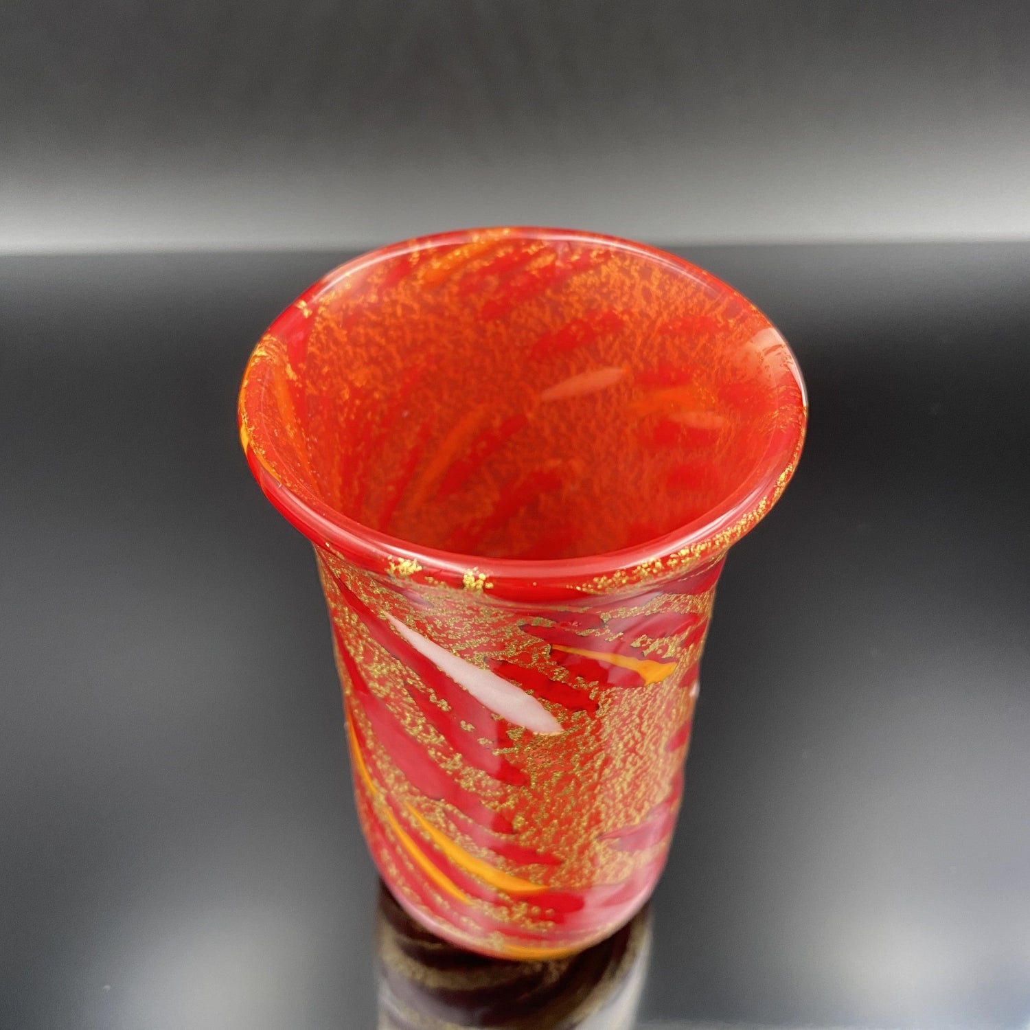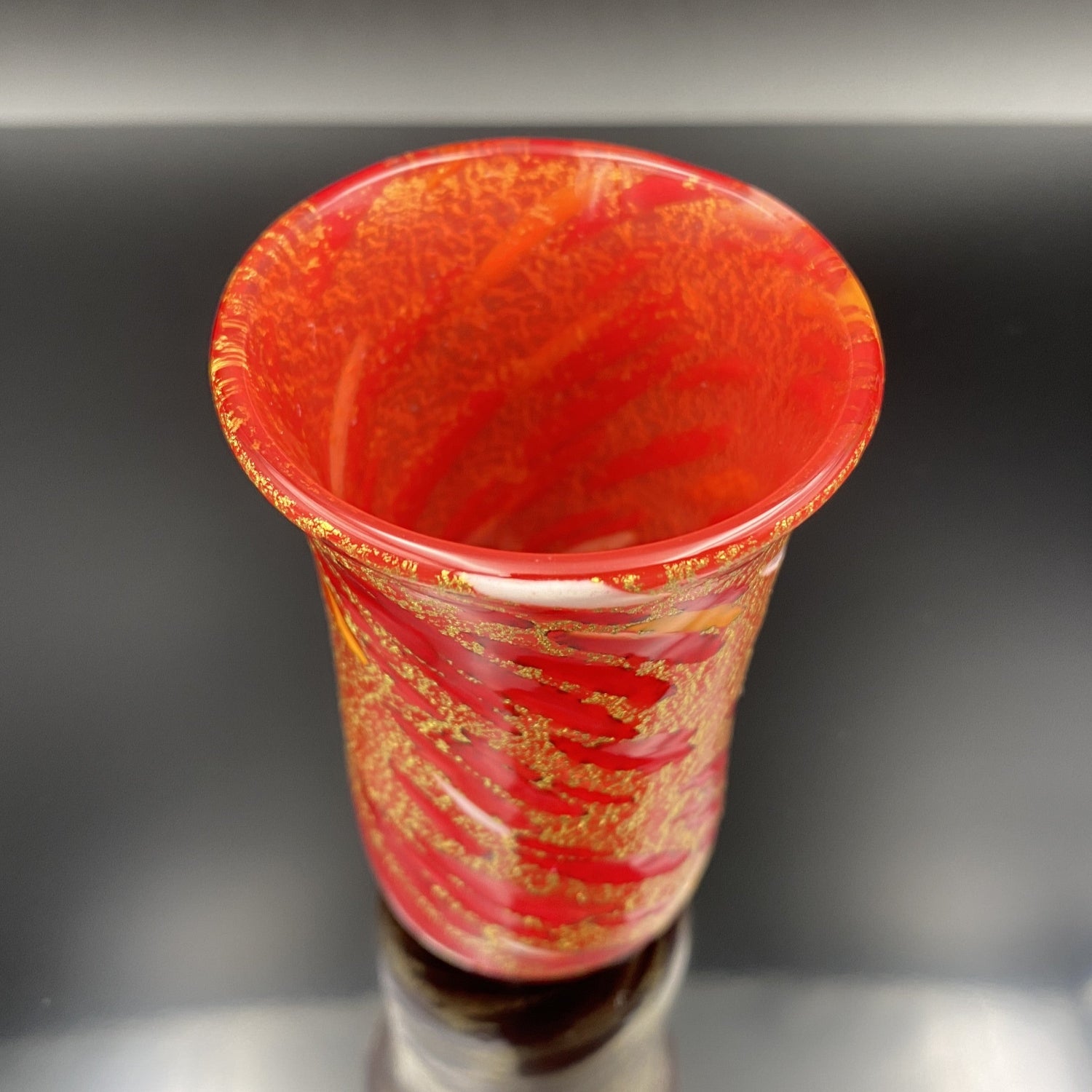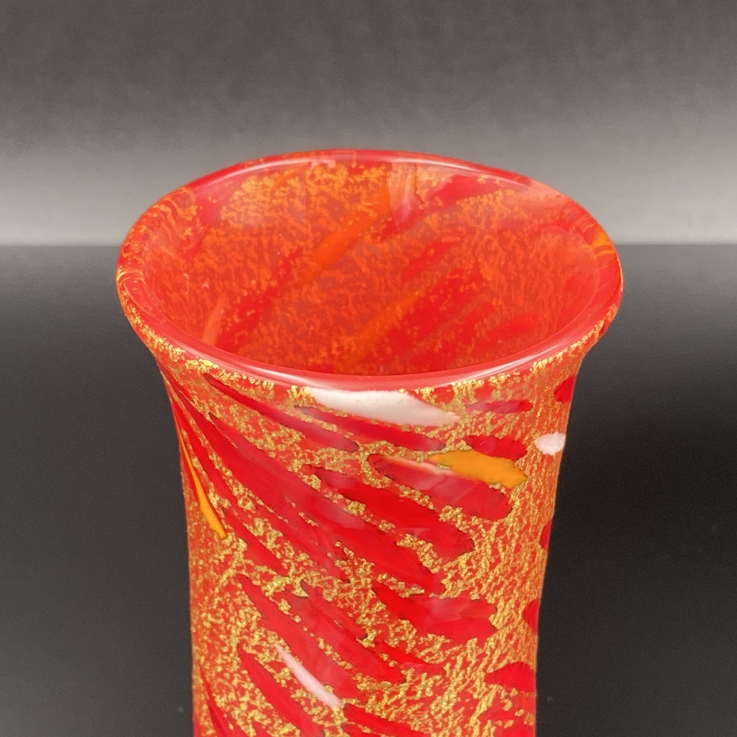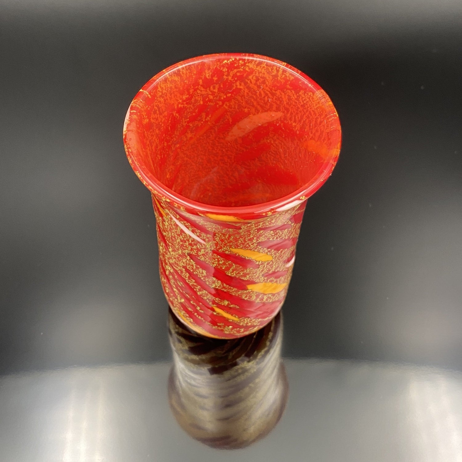 こちらは、日本の現代ガラス工芸を世界水準に高めた巨匠、岩田久利(1925–1994)による希少な手吹きガラス盃です。大胆な赤と金彩の組み合わせ、そして柔らかく揺らめくような手吹きのフォルムは、久利作品の中でも特に表情豊かで、卓越した色彩感覚と造形美を感じさせます。