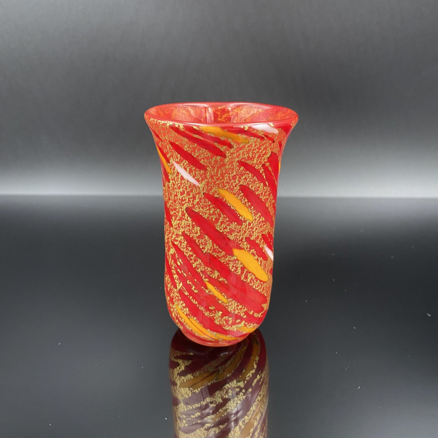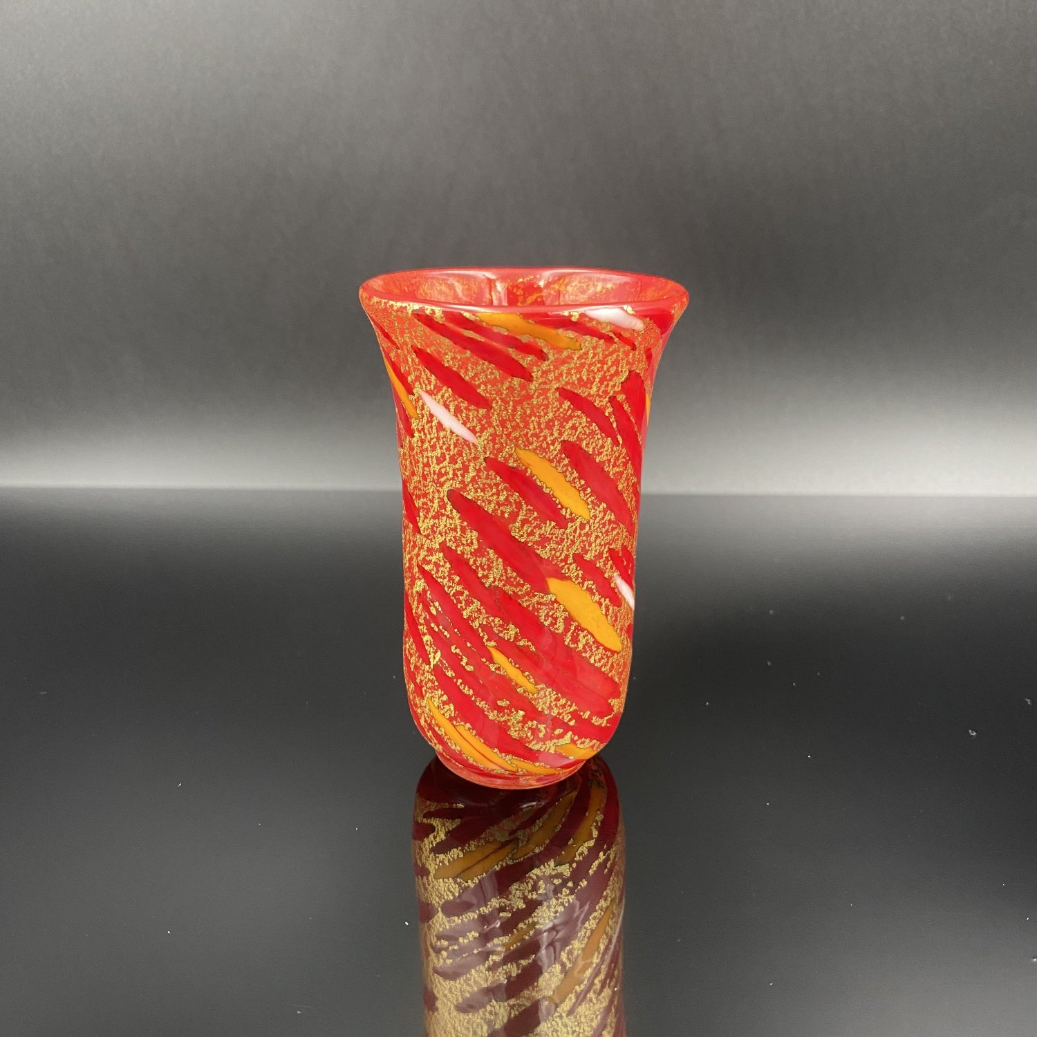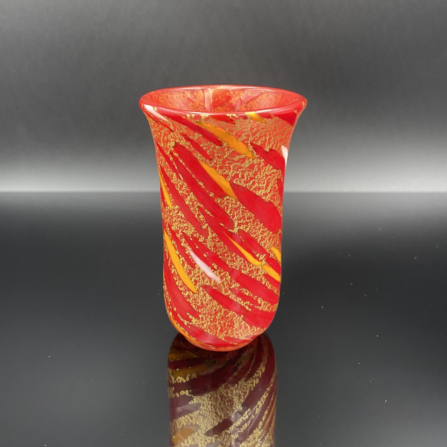 本作には、細かい金彩粒子と斜めに走る赤の流線模様が施されており、まるで火炎や情熱を閉じ込めたような迫力と美しさを持っています。底部に向かってすぼまる形状は手取り感もよく、鑑賞用としてだけでなく、特別な場面での酒器としても優れた存在感を放ちます。