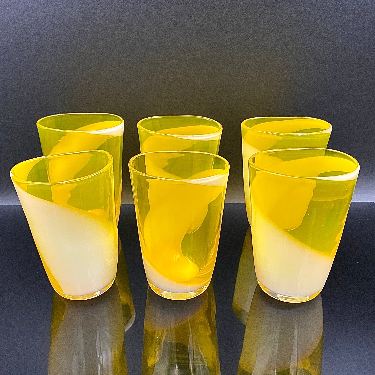 形状は、やや背の高いシンプルな円筒形のタンブラータイプで、手吹き硝子特有の柔らかな丸みを帯びています。底が肉厚に作られているため安定感があり、飲み物の冷たさを保ちやすい実用性も兼ね備えています。太陽のような明るいイエローとホワイトのコントラストは、食卓に活気とモダンな彩りをもたらします。6客揃った貴重なセットであり、日常使いから特別な席まで、幅広く活躍するグラスです。