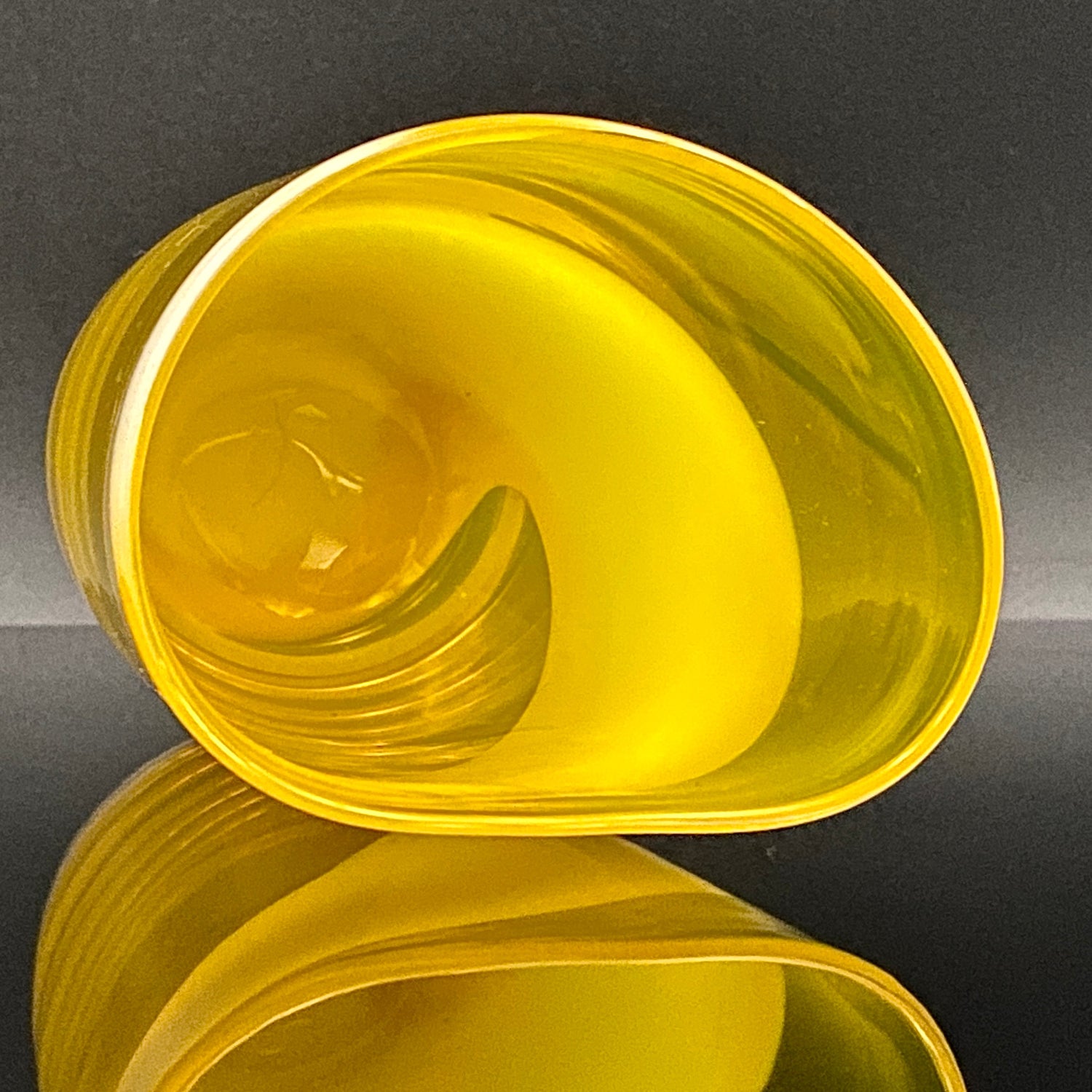 ボウル全体には、鮮やかなイエローと、不透明なミルキーホワイトのガラスが、底から飲み口へと力強く螺旋を描きながら融合しています。このマーブルの帯はグラスの側面に勢いのある斜めのラインを作り出し、見る角度によってデザインの表情が変わるのが大きな魅力です。特に上からグラスを覗き込むと(画像中央)、底に向かって渦を巻くような模様が見え、色彩の深みが感じられます。