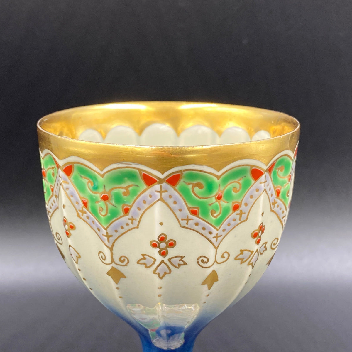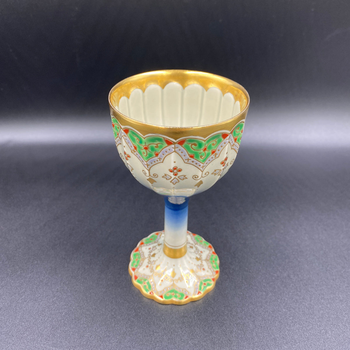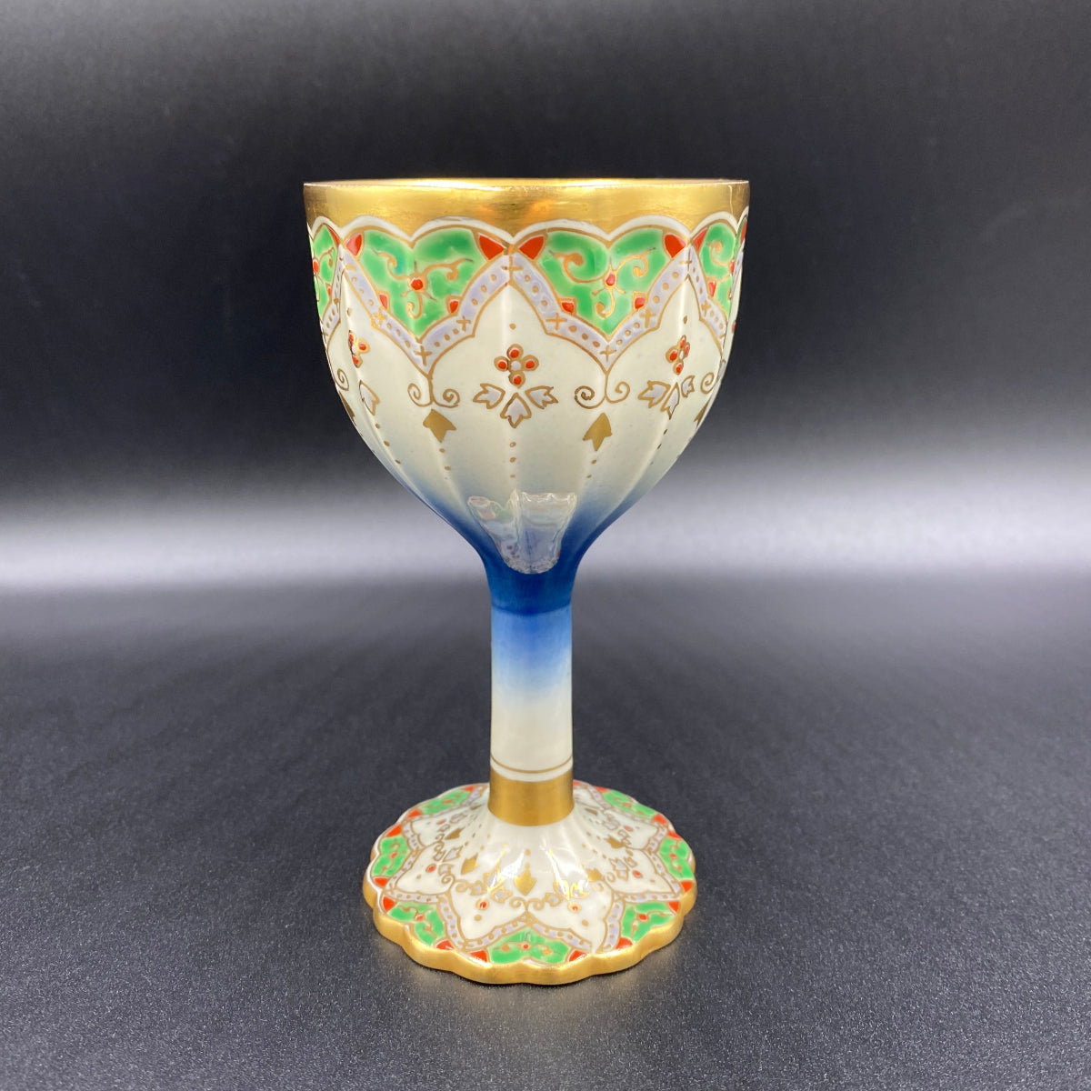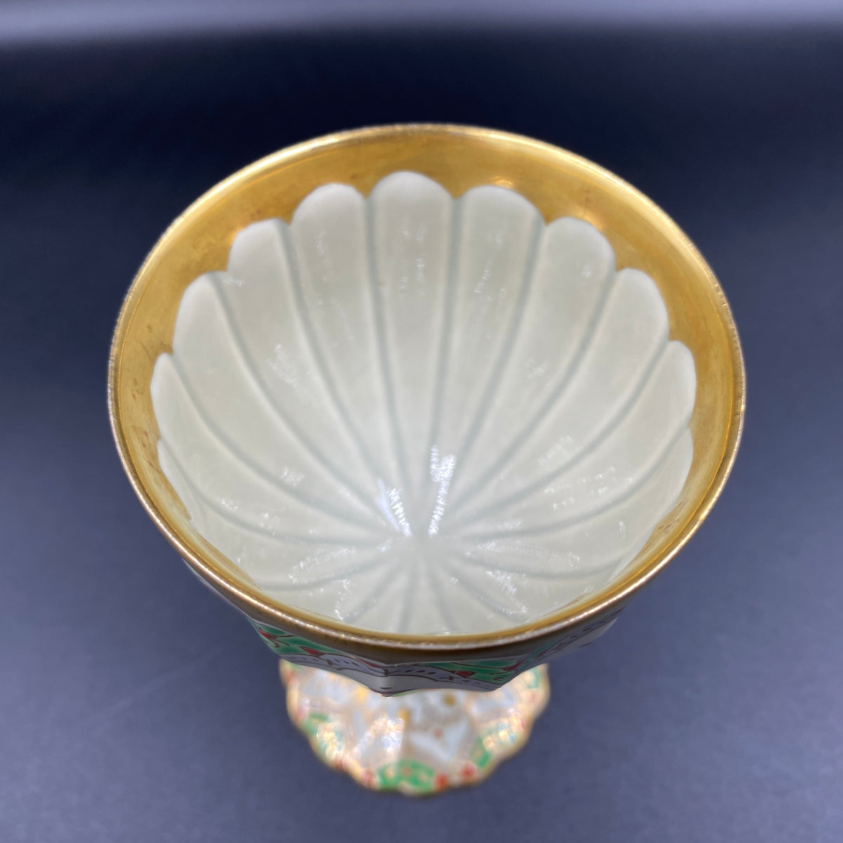 豊かで鮮やかな色付けがきれいな陶器グラスです。グラス内部には日本国の天皇や皇室を表す十六葉八重表菊を連想させる美しい文様があり、青磁の淡い緑色と金彩の調和が素晴らしい逸品です。ジャパニーズウイスキーは日本のグラスで楽しんでみてはいかがでしょうか。