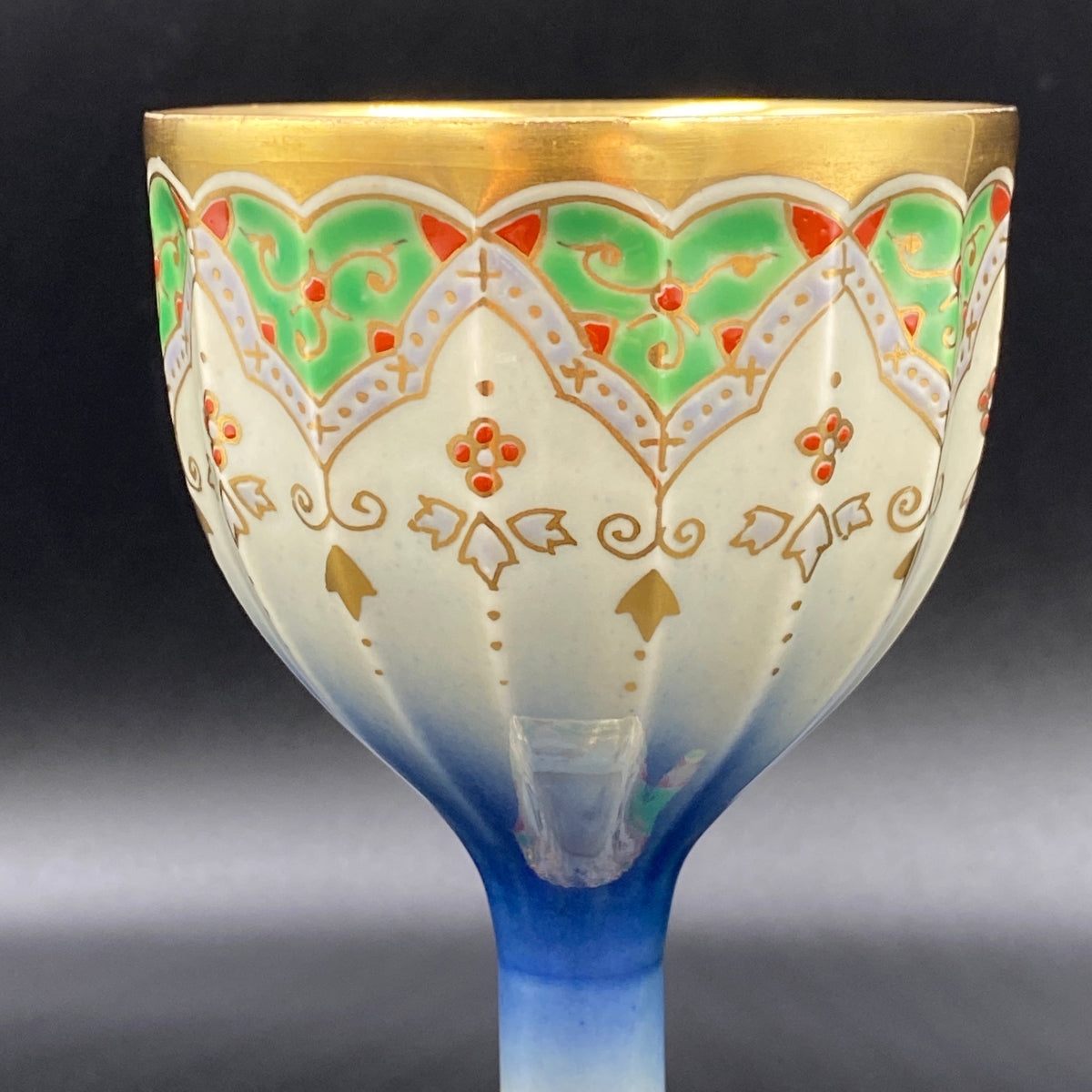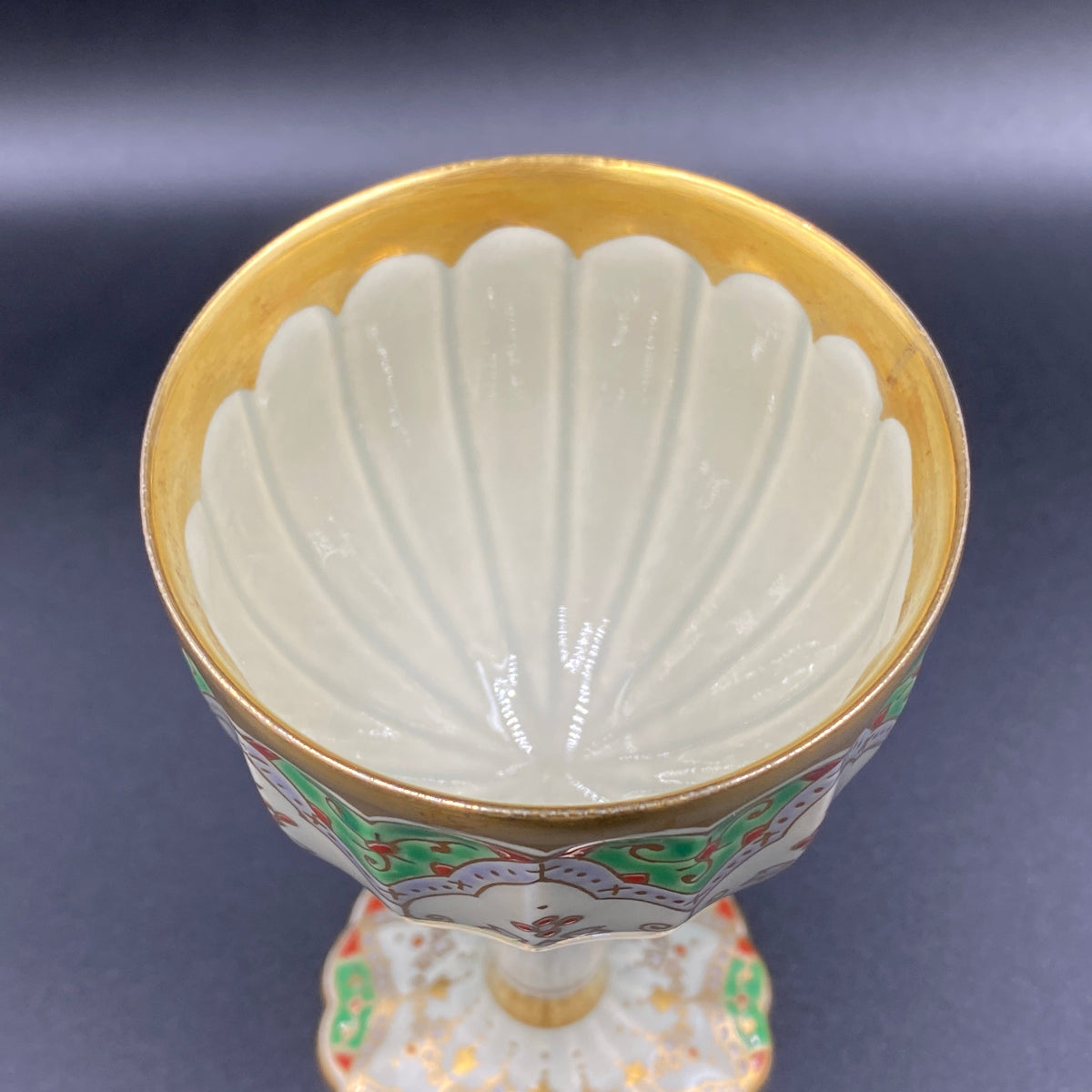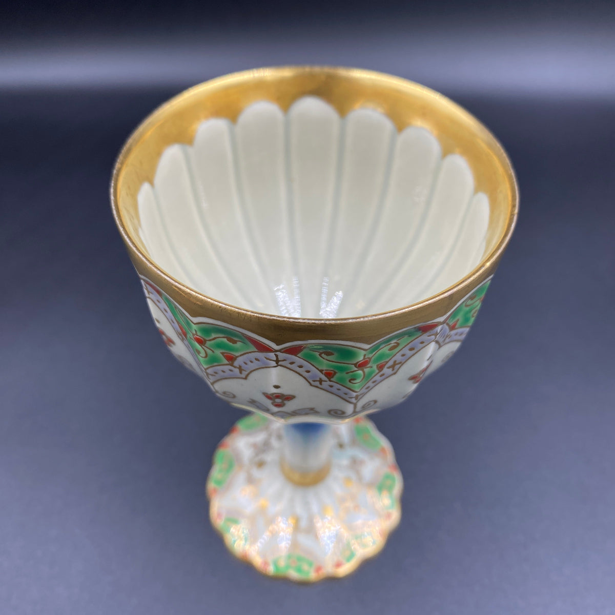 豊かで鮮やかな色付けがきれいな陶器グラスです。グラス内部には日本国の天皇や皇室を表す十六葉八重表菊を連想させる美しい文様があり、青磁の淡い緑色と金彩の調和が素晴らしい逸品です。ジャパニーズウイスキーは日本のグラスで楽しんでみてはいかがでしょうか。