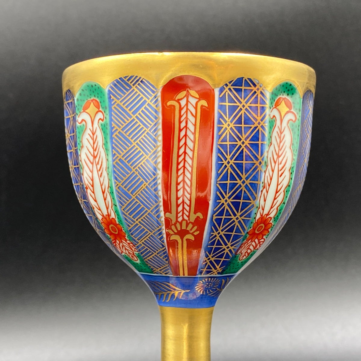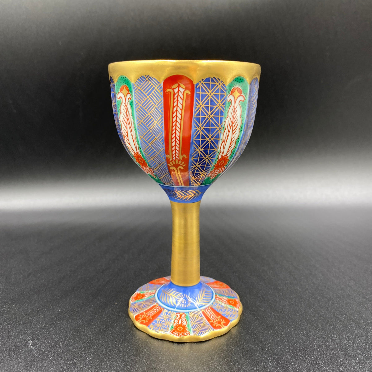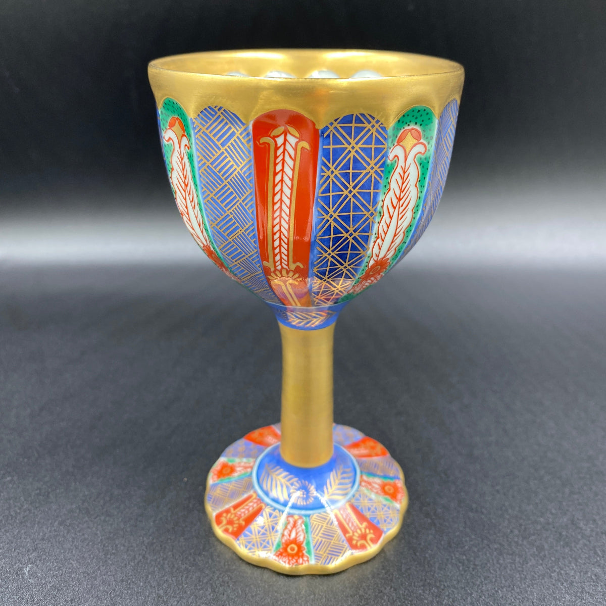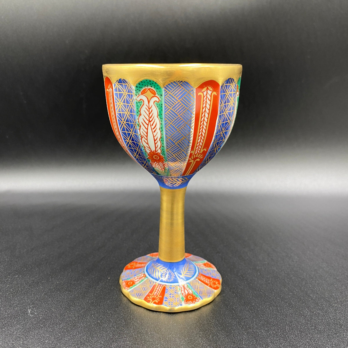 豊かで鮮やかな色付けがきれいな陶器グラスです。グラス内部には日本国の天皇や皇室を表す十六葉八重表菊を連想させる美しい文様があり、青磁の淡い緑色と金彩の調和が素晴らしい逸品です。ジャパニーズウイスキーは日本のグラスで楽しんでみてはいかがでしょうか。