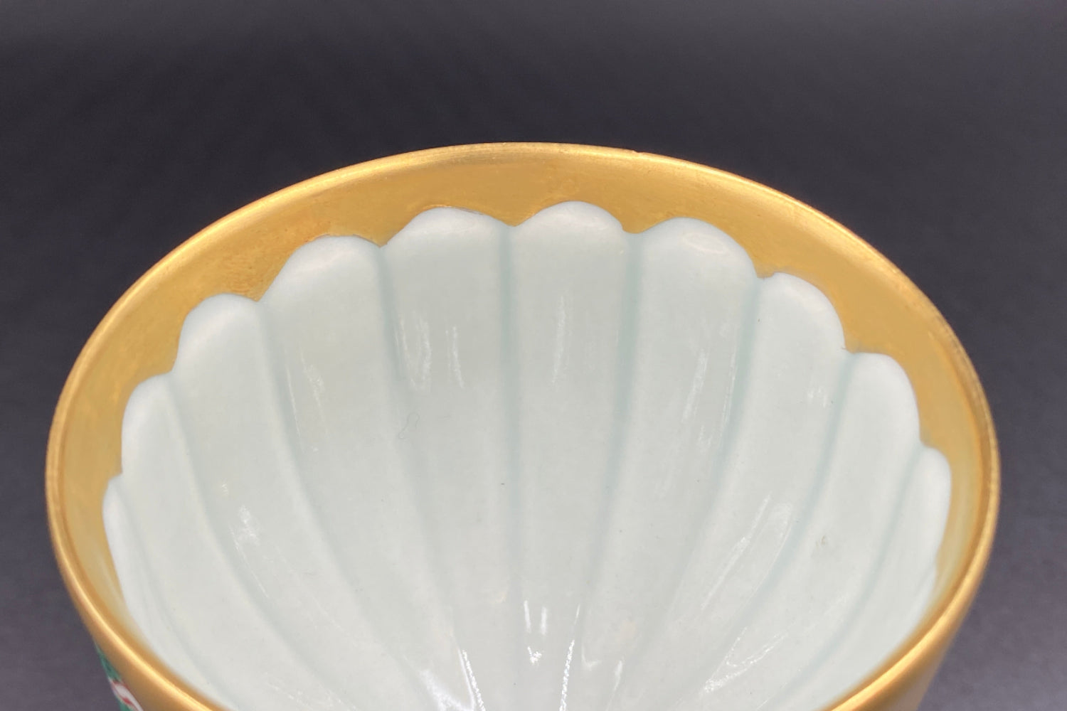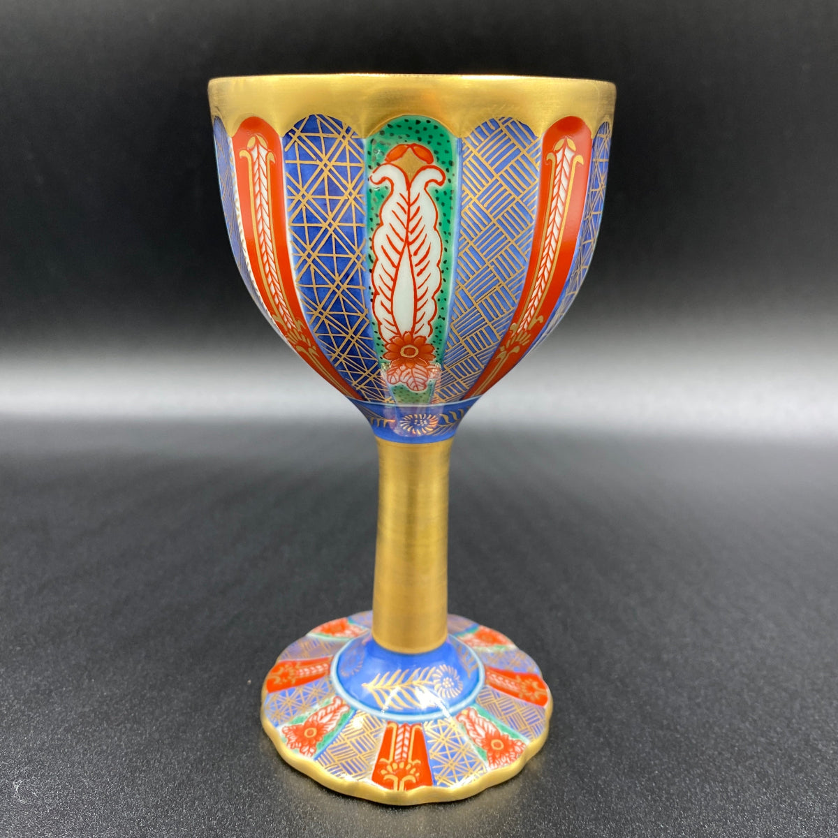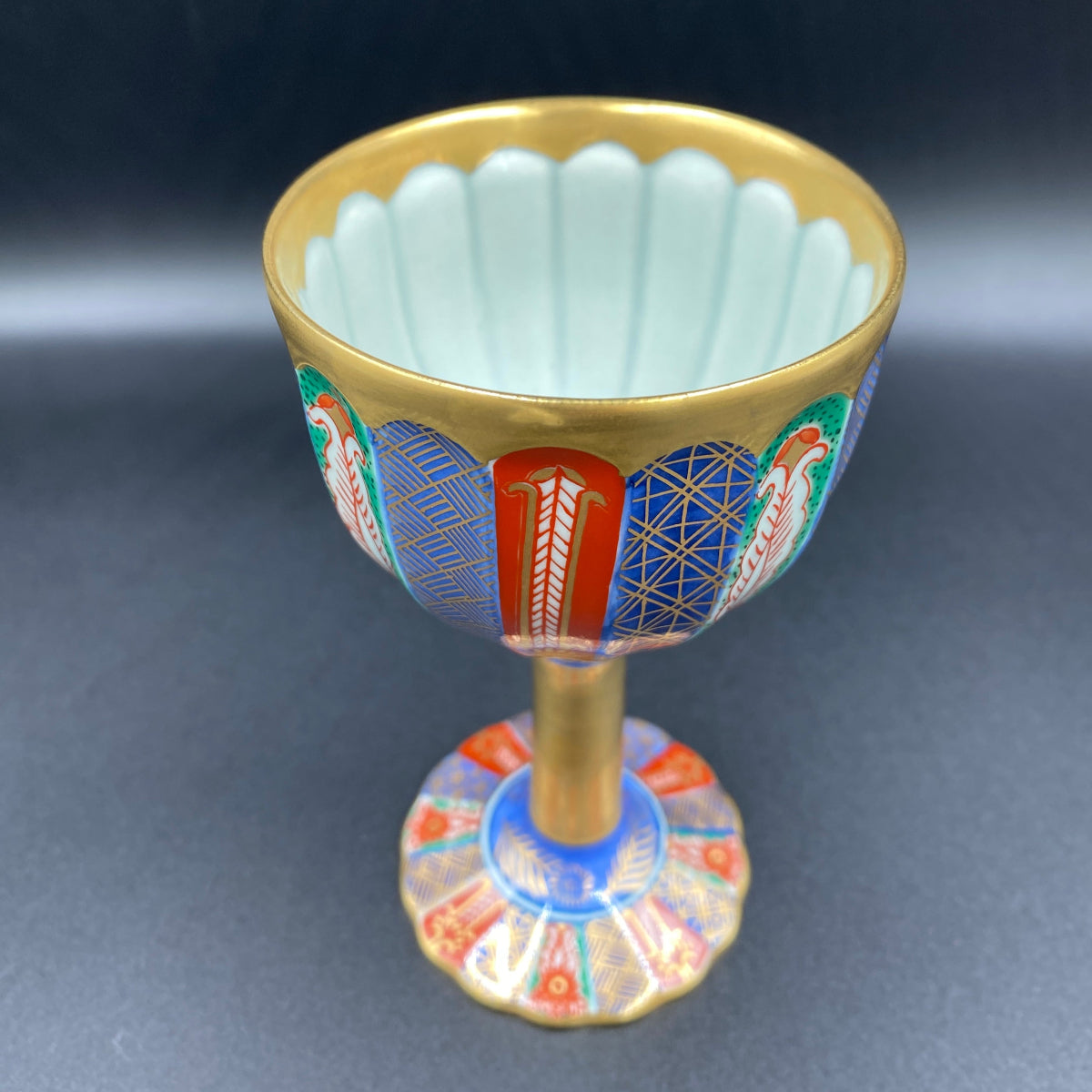 豊かで鮮やかな色付けがきれいな陶器グラスです。グラス内部には日本国の天皇や皇室を表す十六葉八重表菊を連想させる美しい文様があり、青磁の淡い緑色と金彩の調和が素晴らしい逸品です。ジャパニーズウイスキーは日本のグラスで楽しんでみてはいかがでしょうか。