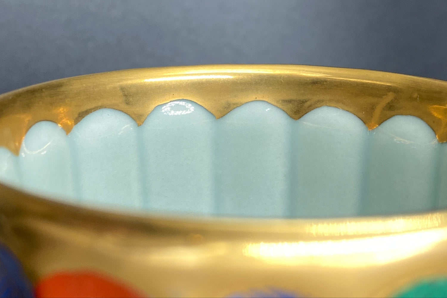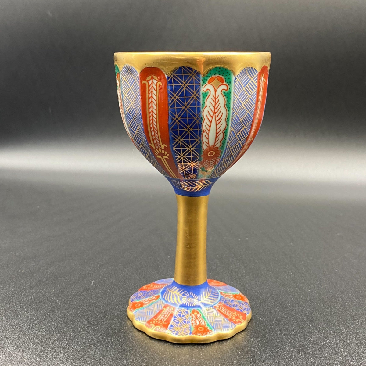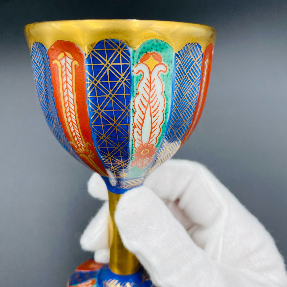 豊かで鮮やかな色付けがきれいな陶器グラスです。グラス内部には日本国の天皇や皇室を表す十六葉八重表菊を連想させる美しい文様があり、青磁の淡い緑色と金彩の調和が素晴らしい逸品です。ジャパニーズウイスキーは日本のグラスで楽しんでみてはいかがでしょうか。