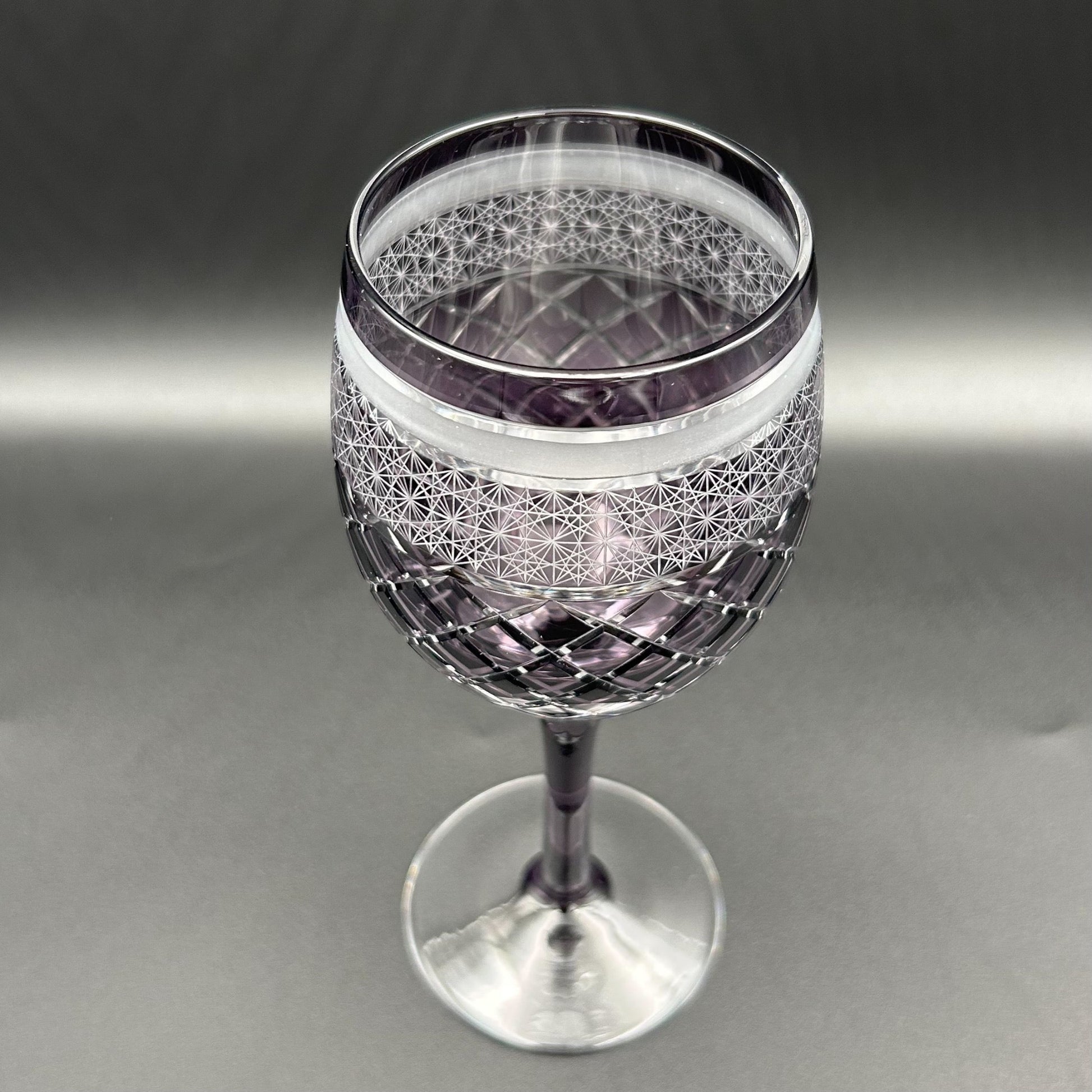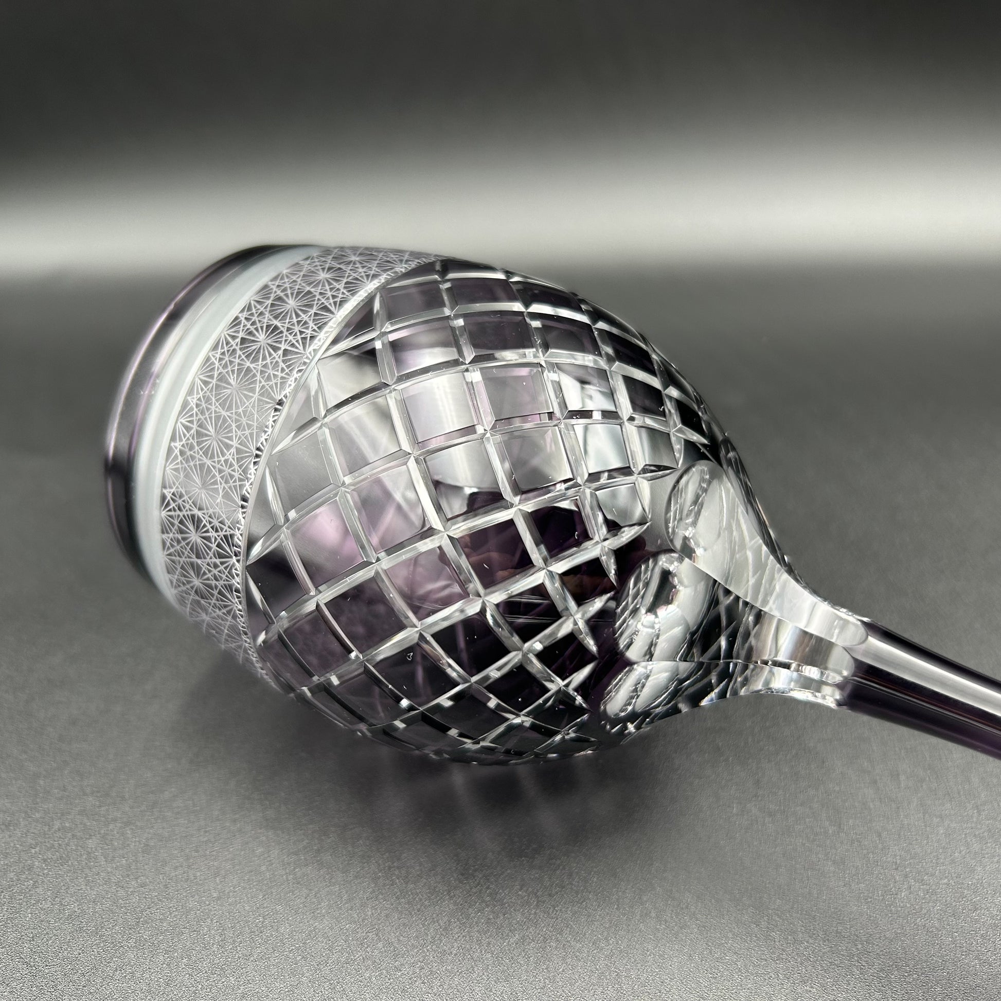 その代表的なシリーズ‘華硝流 酒器‘は、伝統文様を基にしつつも現代の美意識に寄り添うデザインで構成され、ワイングラスやぐい呑みなどが展開されています。とりわけ紫や瑠璃の“被せガラス”を用いたワイングラスは、光の反射で紋様が浮かび上がる美しさが際立ち、国内外のコレクターからも大変人気です。