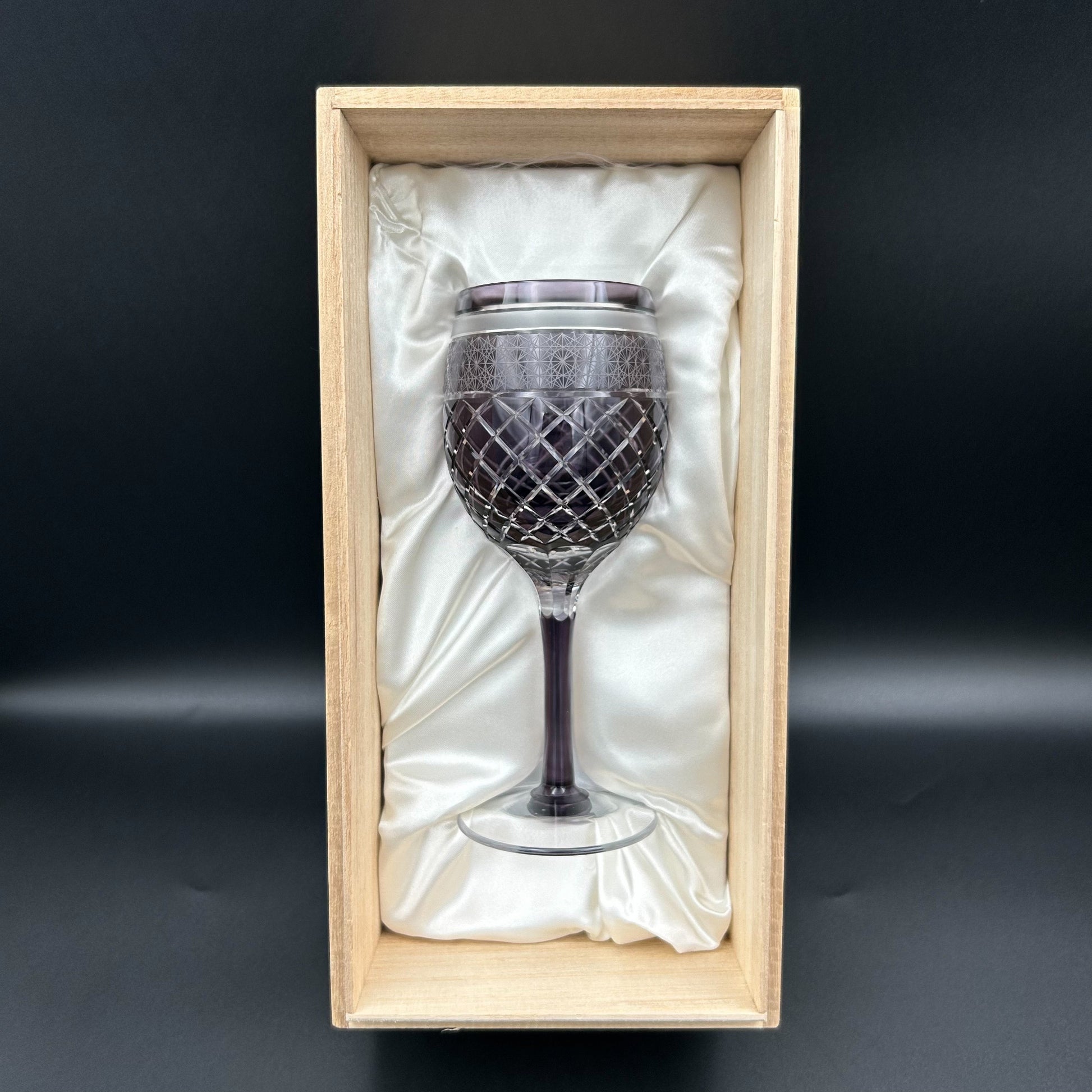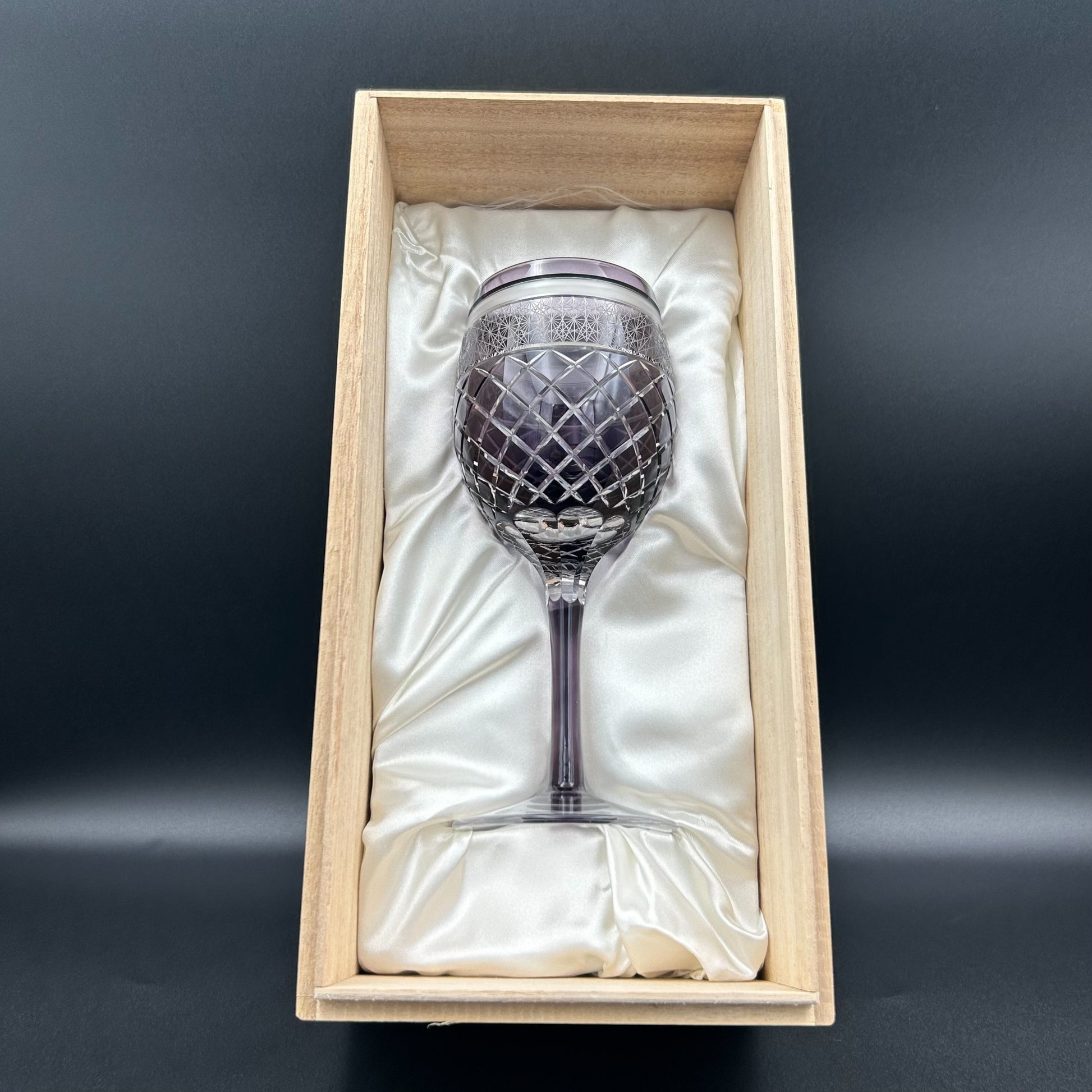 今回紹介したグラスは、紫被せガラスに華硝流ならではの精緻な文様が彫り込まれた逸品で、専用の桐箱が付属します。高い芸術性と贈答品としての格式を兼ね備えた作品です。熊倉氏の熟練した技術と美意識を体現する一点といえるでしょう。