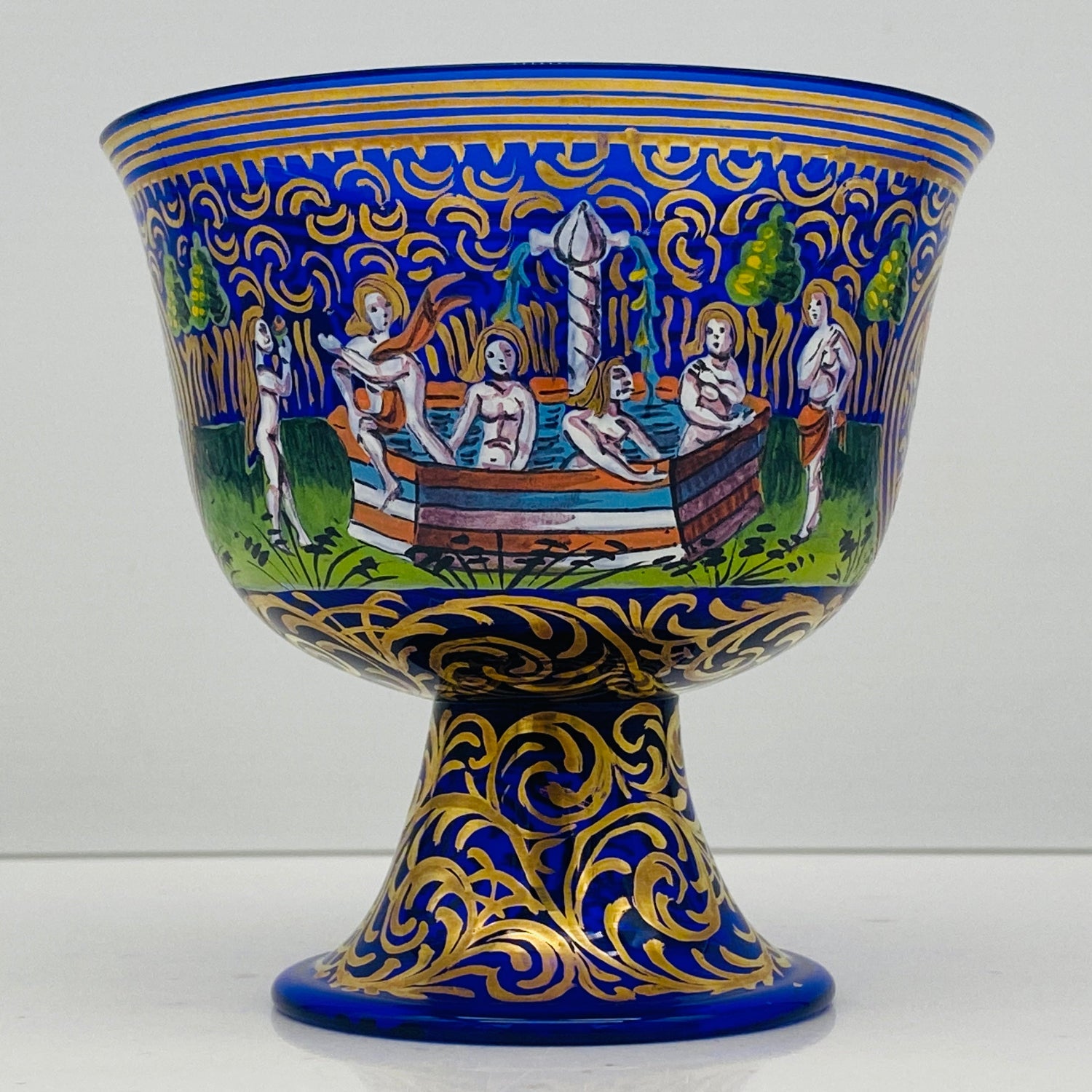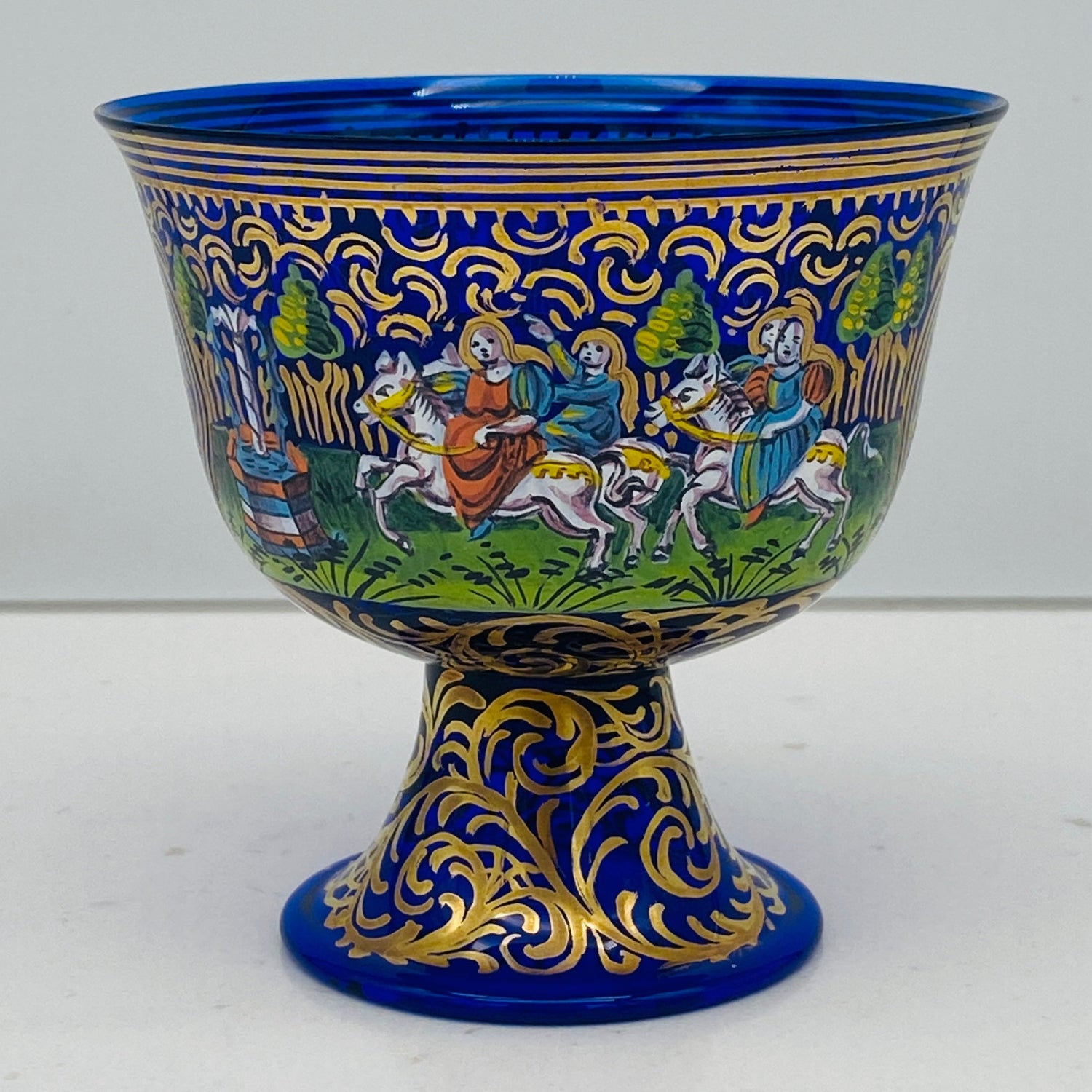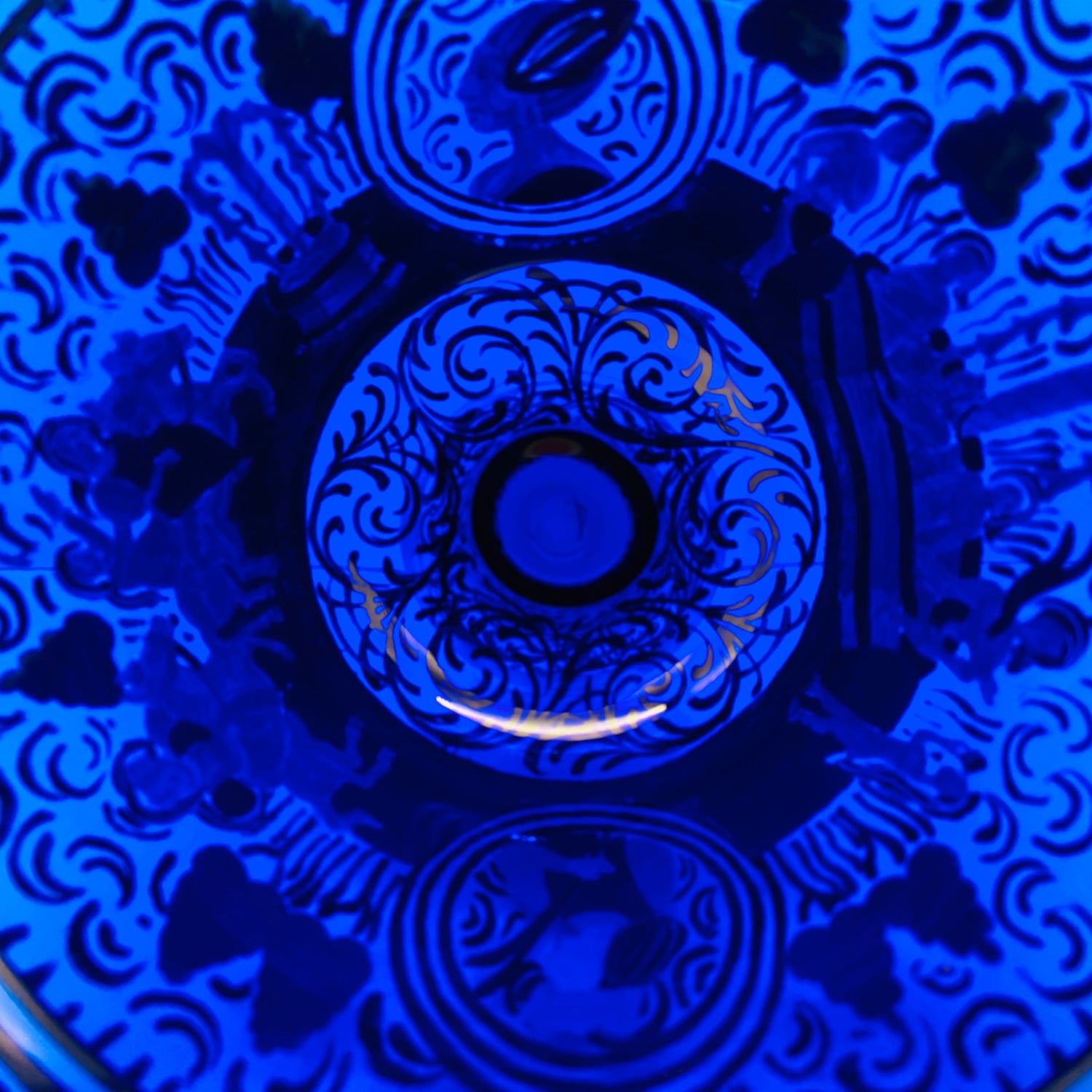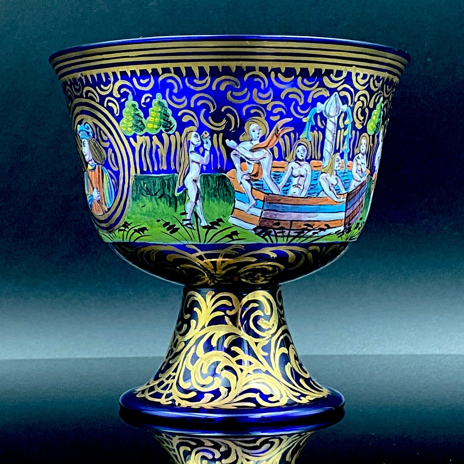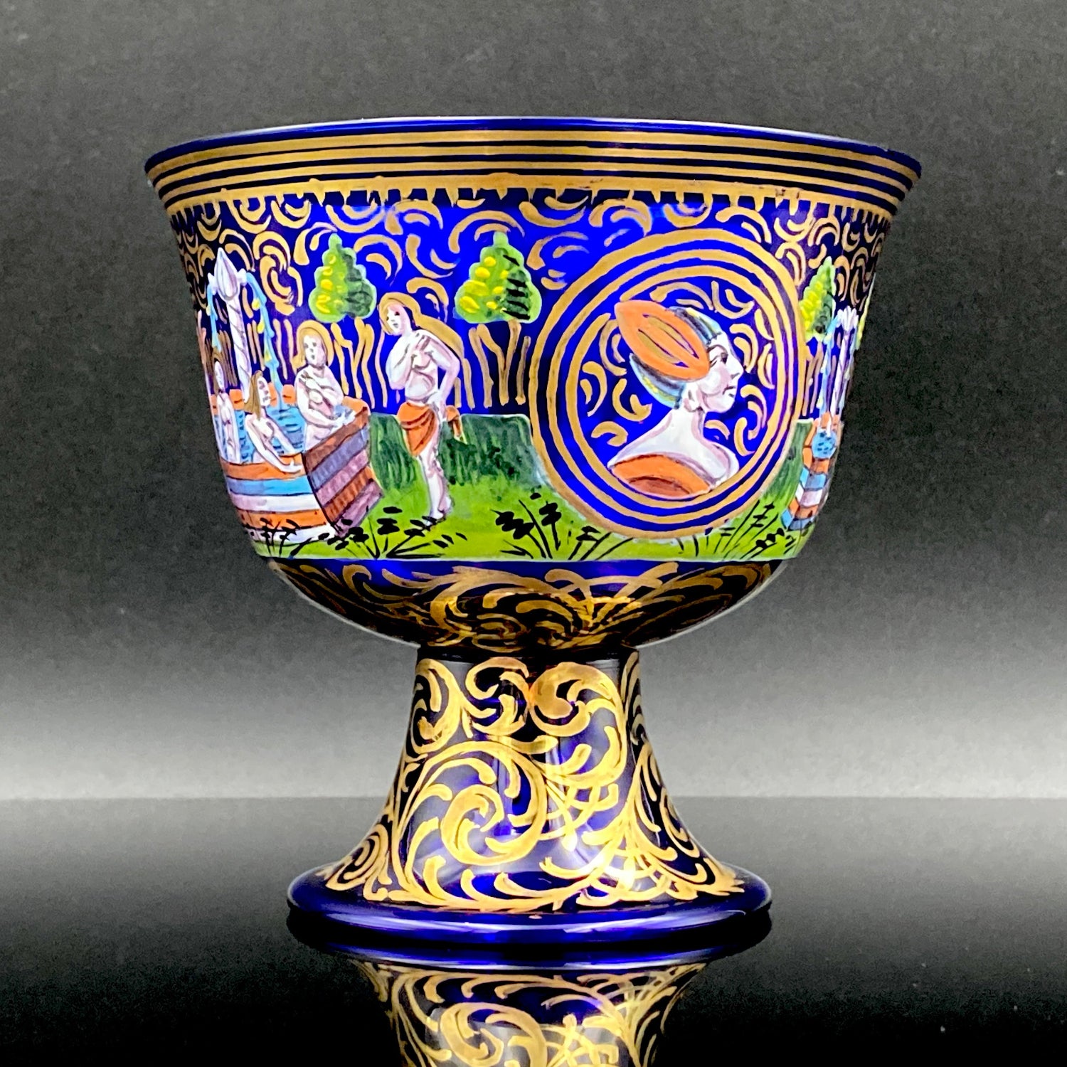 意匠の源泉となった原作は、1470年頃に硝子工芸の天才アンジェロ・バロヴィエによって、フェラーラ公とエステ家の令嬢との成婚を祝して制作されたと伝えられています。現在はムラーノ硝子美術館に収蔵されているこの至宝を再現するにあたり、本品では深みのあるコバルトブルーを基調に、純金彩と多色エナメルを幾層も重ねて焼成する伝統技法が用いられています。