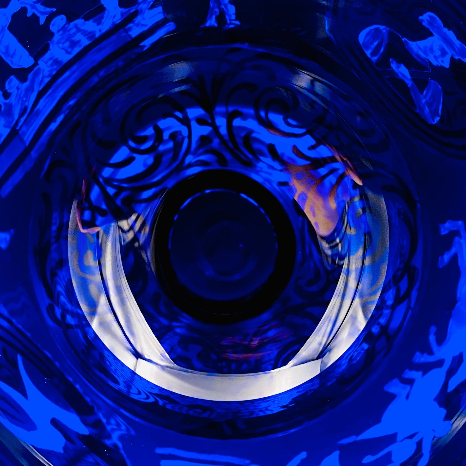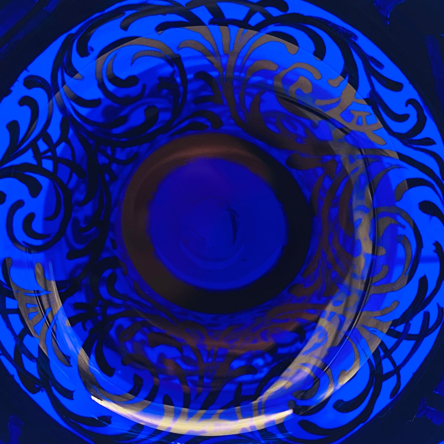 - 制作技法:手吹き硝子により成形されたコバルト硝子に、熟練職人が多色エナメル(ポリクローム)と純金を用いて一点ずつ手描きで装飾を施し、焼成しています。