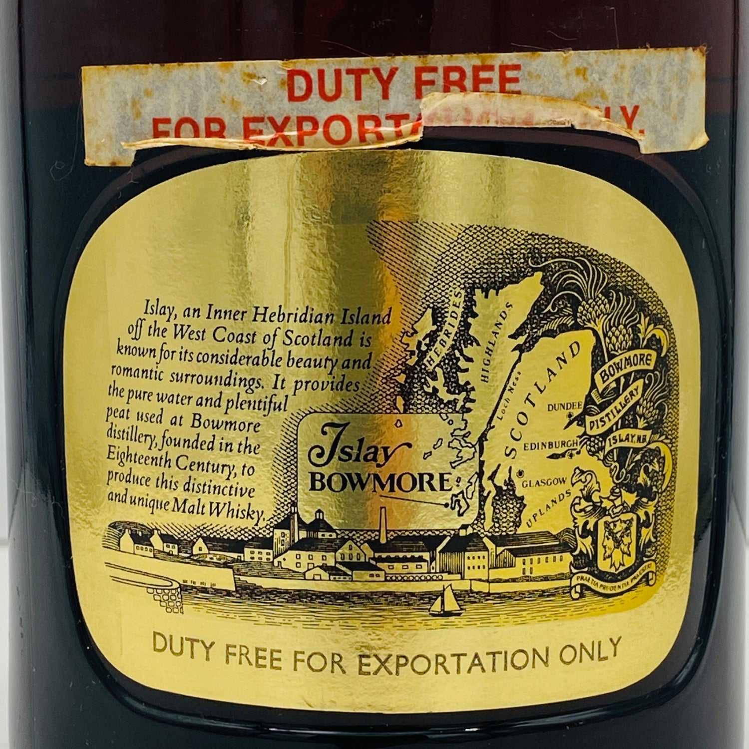 ボトルは重厚感のある濃い茶色のガラス瓶を採用しており、内容液の品質を守る当時の配慮がうかがえます。ラベルは光沢のあるゴールドを基調とし、黒の縁取りが威厳を与えています。中央にはボウモアの伝統的な紋章がデザインされ、その下に「MORRISON'S BOWMORE DISTILLERY Ltd」の表記が、この時代の所有者とボトリングを示しています。容量は1,000ml(1リットル)、アルコール度数は43%であり、旧規格や当時の国際市場を意識した仕様です。