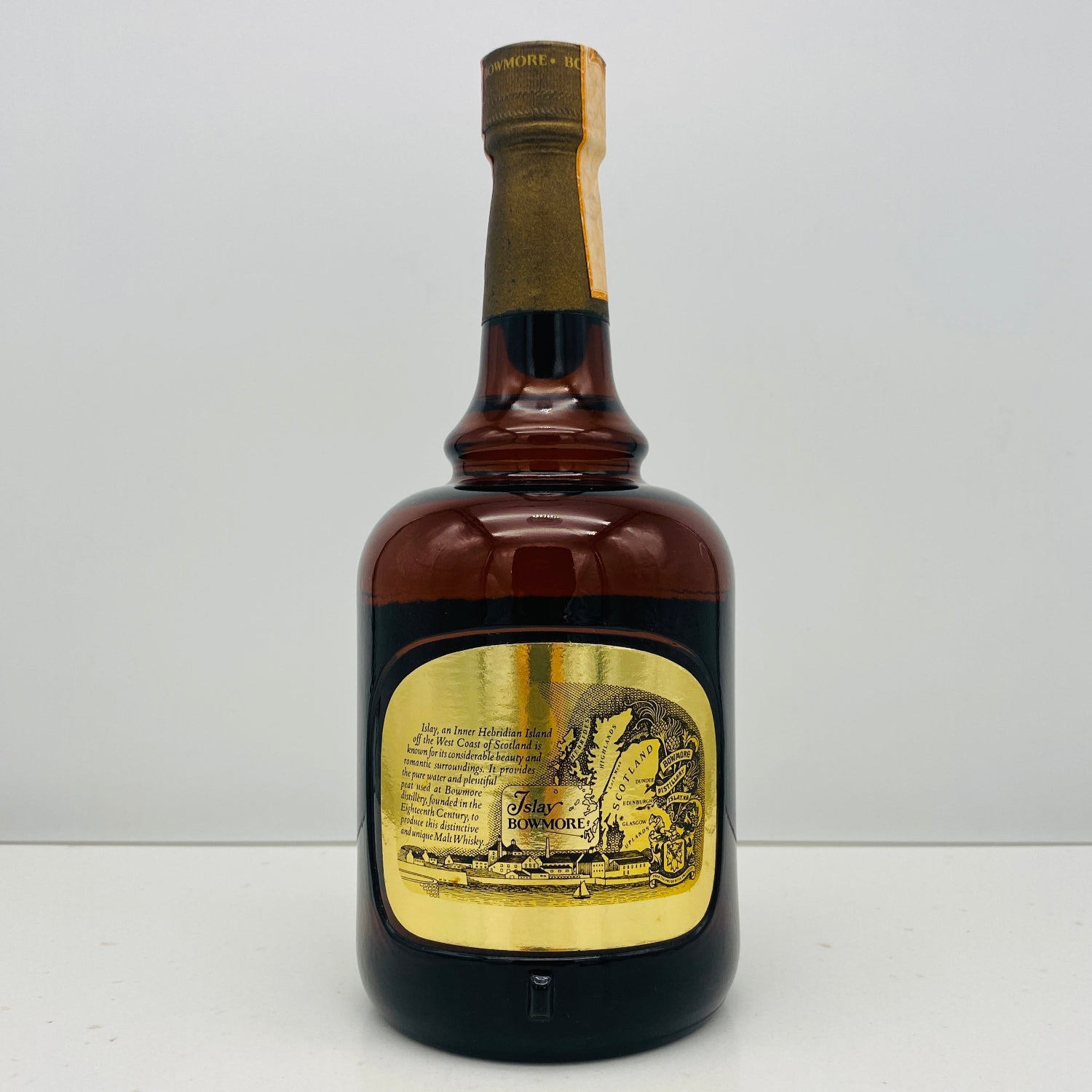 1779年創業、アイラ島最古の蒸留所として知られるボウモアの中でも、世界中の古酒愛好家から「黄金時代のボウモア」として特別な羨望を集めるのが、このモリソン・ボウモア社時代に生産された「ボウモア デラックス(BOWMORE De Luxe)」のイタリア市場向け輸出ボトルです。1970年代から1980年代にかけてイタリアの名門インポーター、フェッキオ・アンド・フラッサ(Fecchio & Frassa)社によって輸入されていた本品は、ボトルネックに残るイタリア独自のUTIF証紙(赤い徴税スタンプ)が物語る通り、欧州市場の中でも特に高品質な原酒が供給されていた時代の、極めて希少な歴史的遺産と言えます。