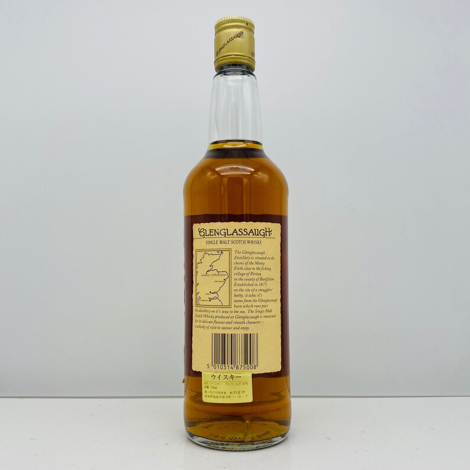 1875年の創業以来、スコットランドのハイランド地方マレー湾の美しい海岸線で歴史を刻んできたグレングラッサ蒸留所。本品は、蒸留所が一時閉鎖(休止)に追い込まれる以前の、1980年代後半から1990年代初頭にかけてボトリング・流通していた「グレングラッサ 12年」の極めて稀少なオールドボトルです。当時の輸入業務は、宮城県塩釜市に本拠を置く大手インポーター、株式会社やまやが手掛けており、ラベルに記された「容量750ml / アルコール分43%」というスペックは、世界的なシングルモルトブームが加速する以前の、まさに「古き良きハイランド・モルト」の風格を今に伝えています。