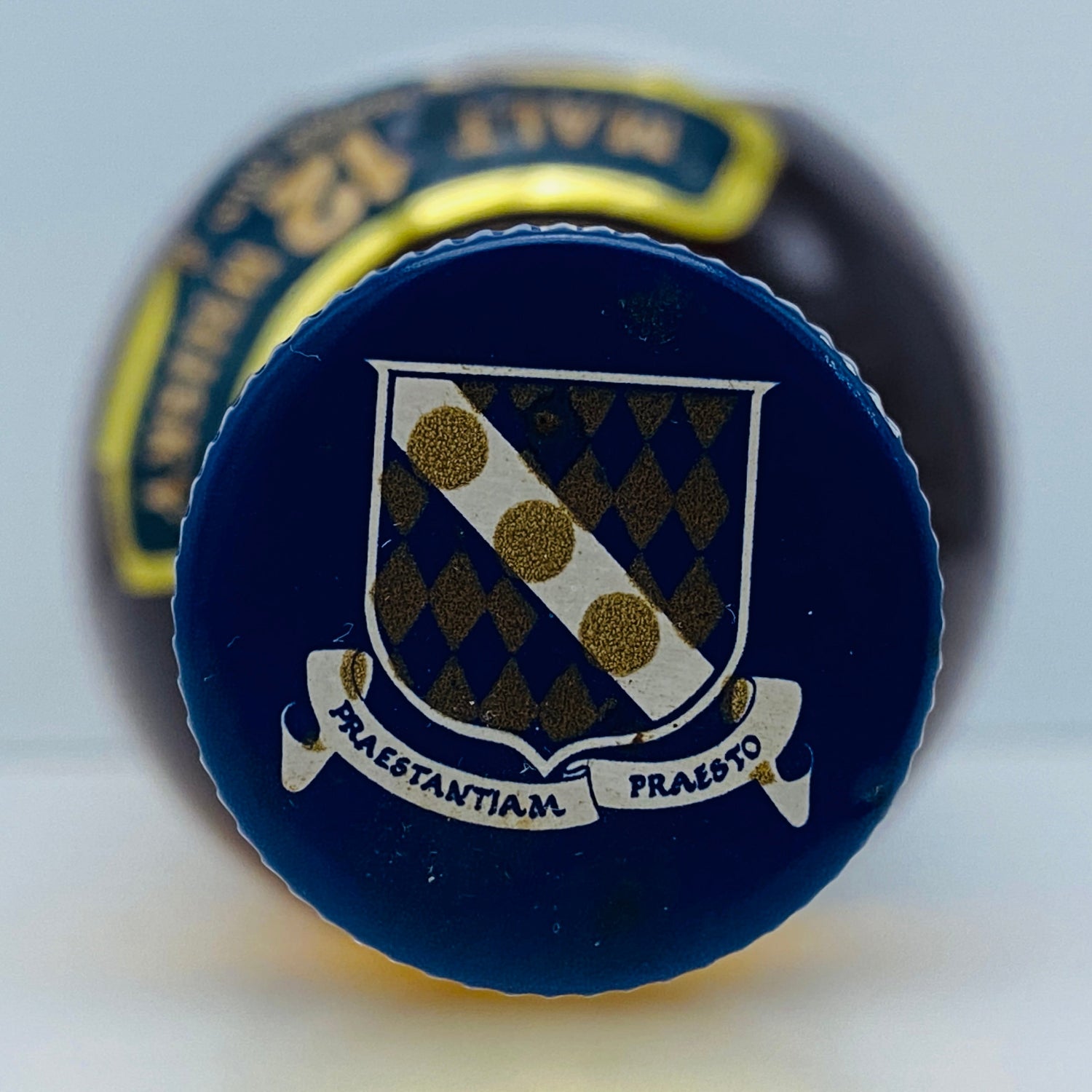 このボトルは、ハイランド地方に位置し、ヴィクトリア女王から「ロイヤル」の称号を授けられた由緒あるロイヤルロッホナガー蒸留所が製造した、12年熟成のシングルハイランドモルトです。画像から確認できる「ウイスキー特級」の表記は、このボトルが1980年代に日本へ輸入されたことを示しています。ボトルの下部には、ヴィクトリア女王およびエドワード7世からの王室御用達の認証が誇らしげに記されており、その格式の高さがうかがえます。キャップの天面には、紋章がデザインされた紺色の装飾が施されています。