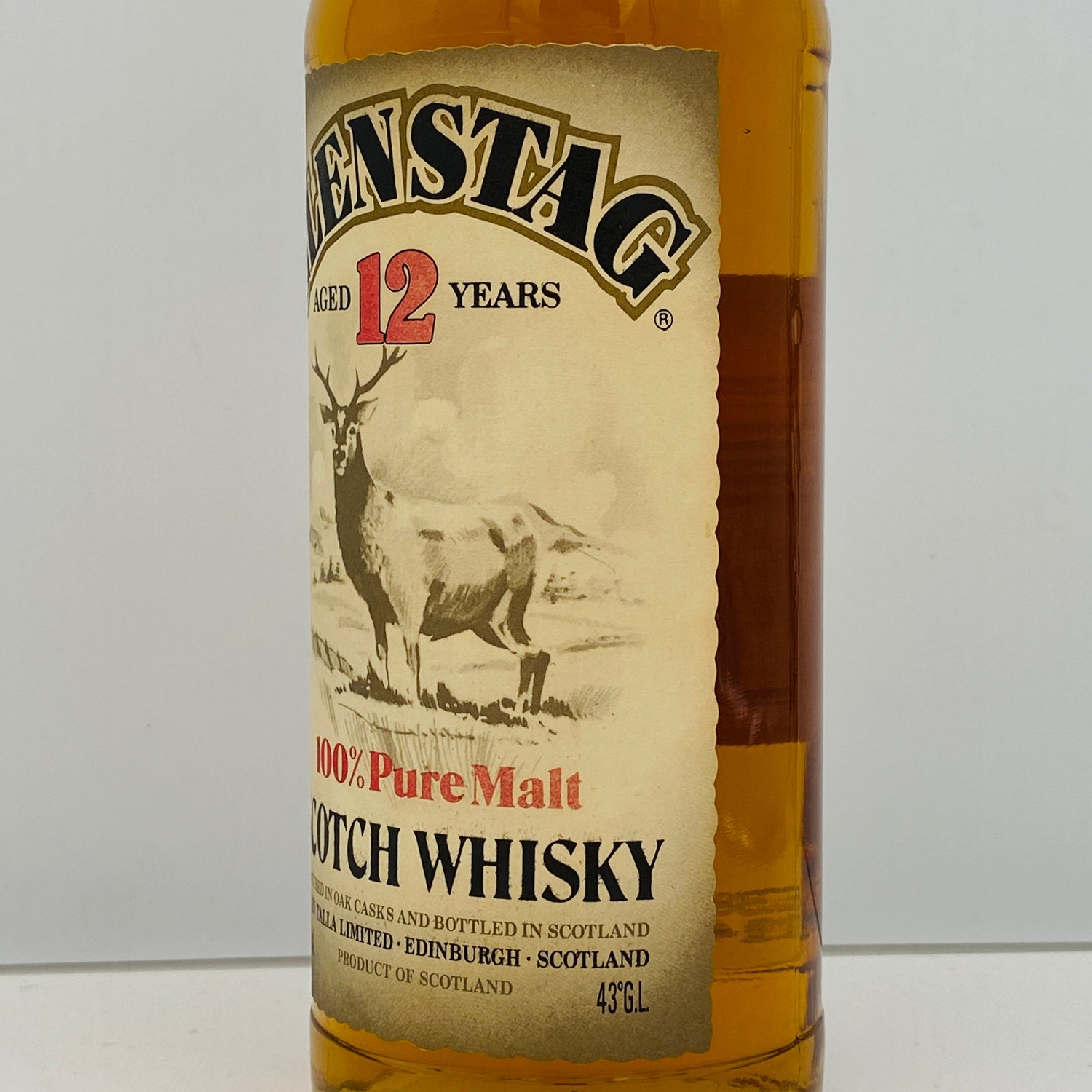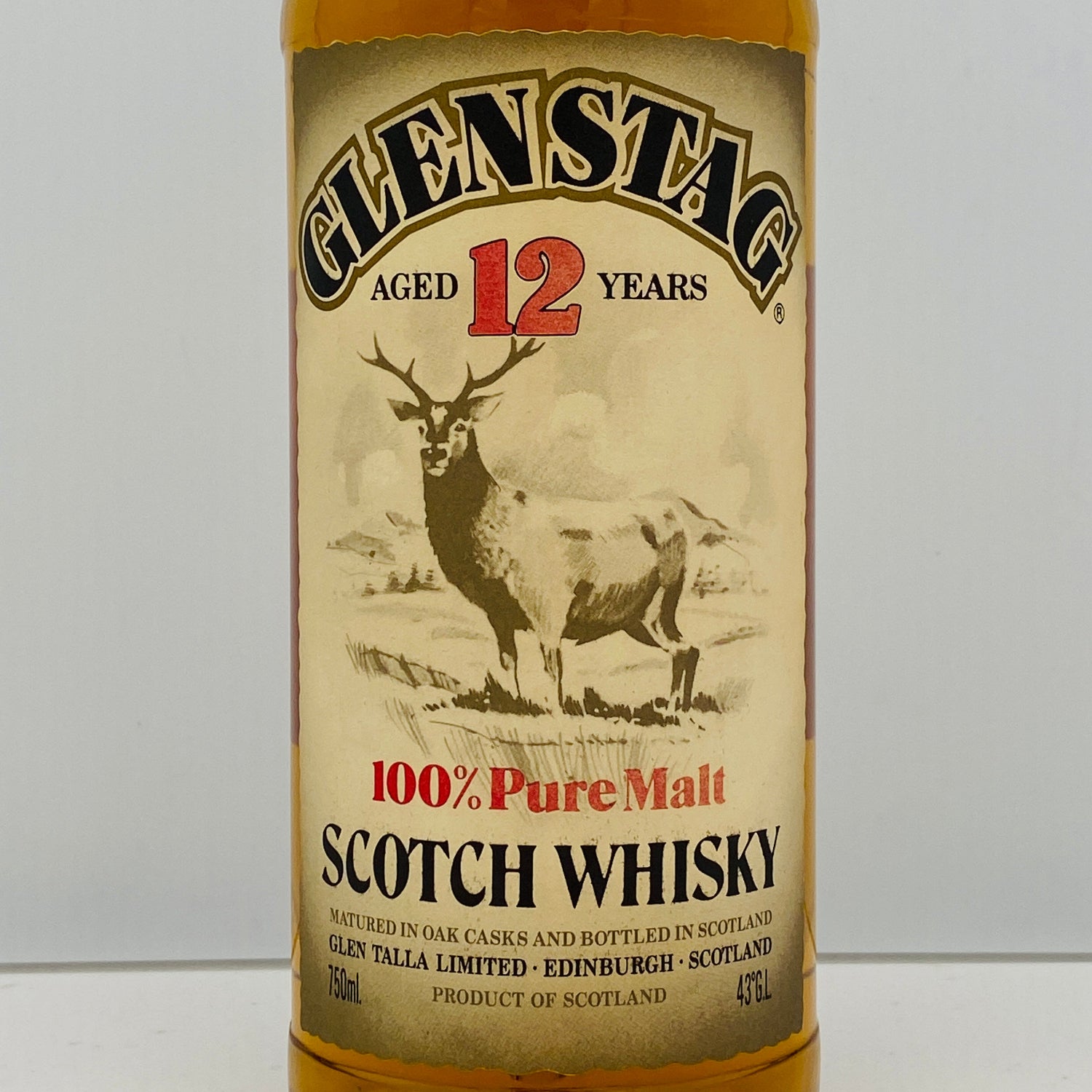 このお品物は、1990年代の日本で親しまれていた希少なオールドボトル、スコッチウイスキー**『グレンスタッグ 12年 ピュアモルト』です。100%モルト原酒のみを使用したピュアモルト(現在のブレンデッドモルト)であり、エディンバラの独立系ボトラーグレン・タラ社(Glen Talla Limited)**の手によって、ハイランドとアイラのシングルモルトが贅沢にブレンドされています。1980年代の「特級」時代から続く重厚な構成を色濃く残しており、現行のブレンデッド(モルト+グレーン)とは一線を画す、今では再現不可能な厚みを持ったウイスキーです。
