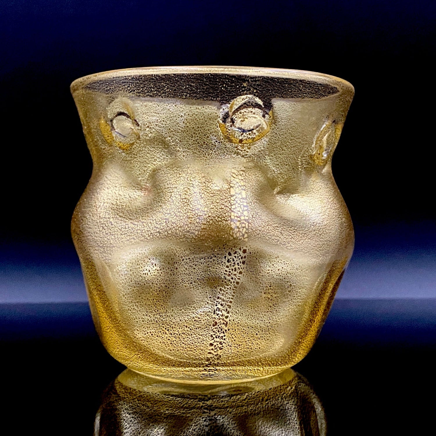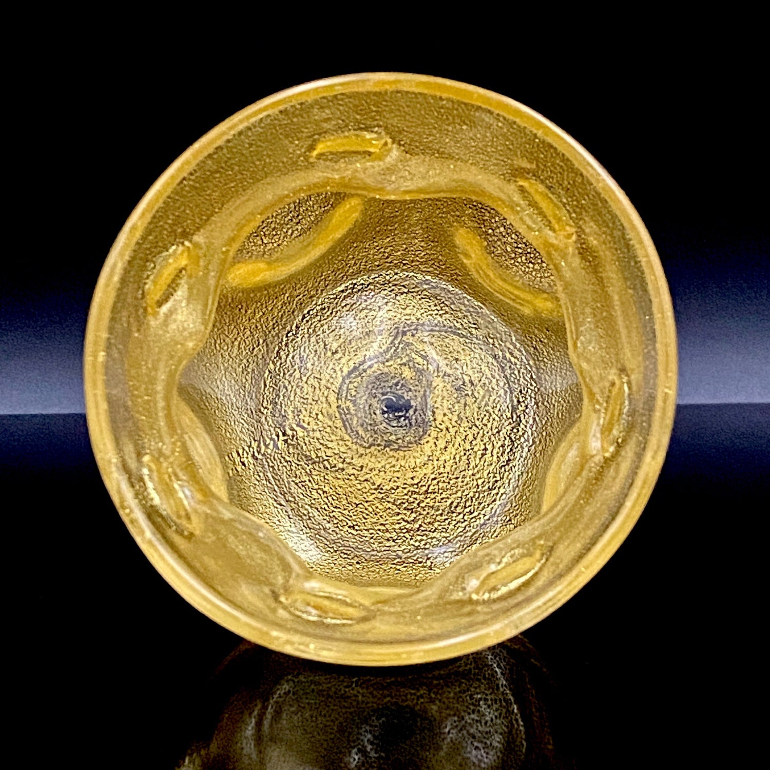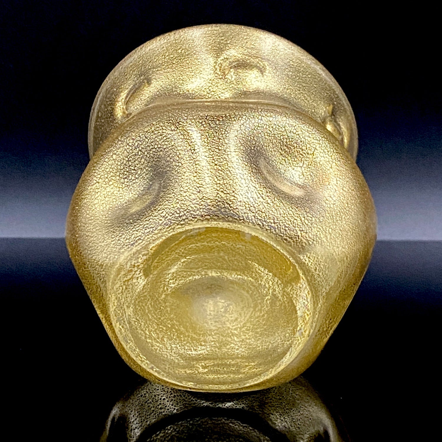 日本を代表するガラス工芸作家・岩田久利(1925–1994)の作品「燦(さん)」です。燦とは、『火の光が照りかがやいてあざやか、きらびやかで美しい』といった意味で、その名の通り、光り輝く存在感を放っています。全体にはきめ細やかな金箔が散りばめられ、手に取るとまるで光を抱いているかのような高級感があります。黄色味を帯びた外観は、実際には無数の微細な金箔によって構成されており、近くで見ると繊細な金細工の美しさが浮かび上がります。