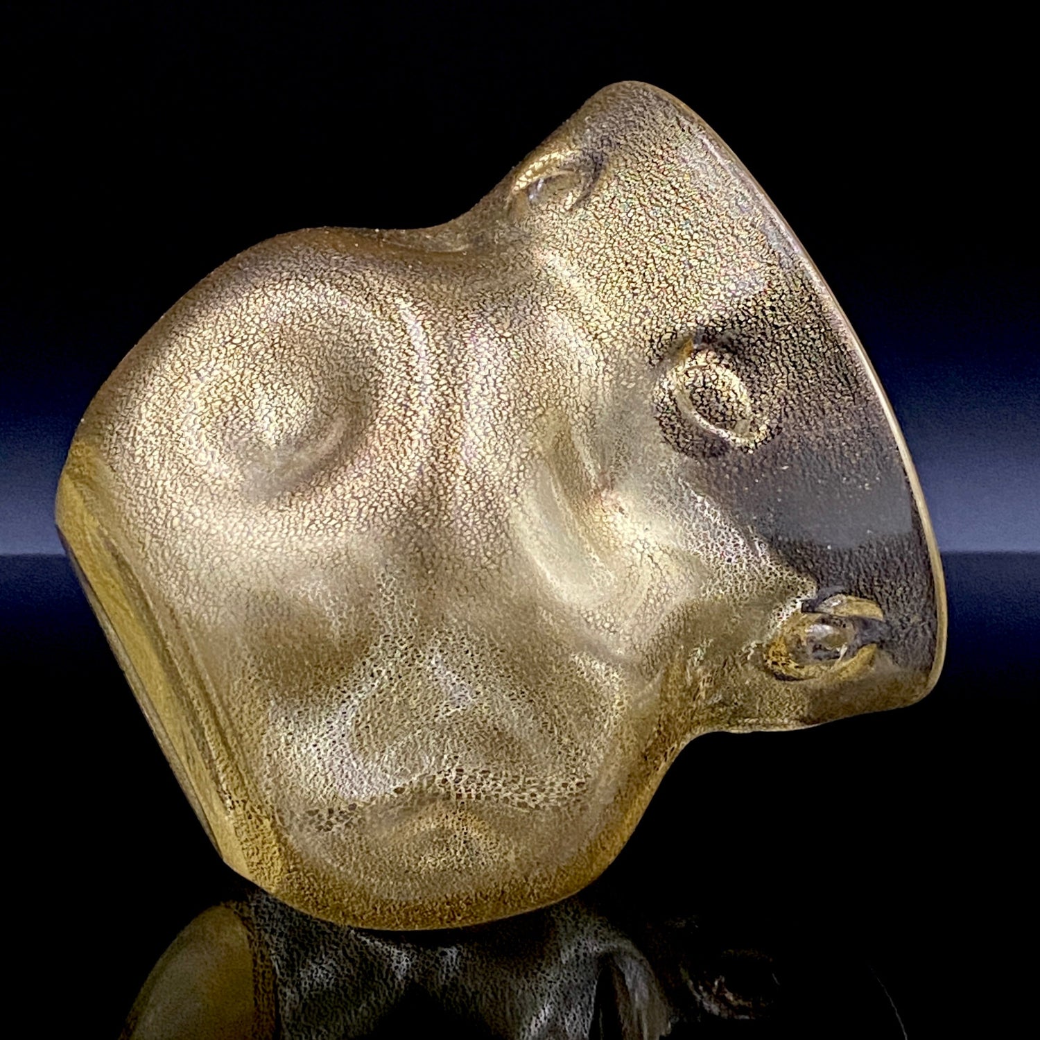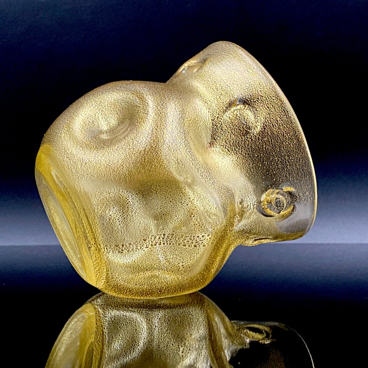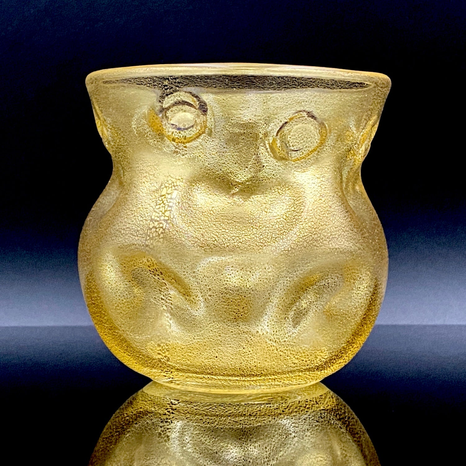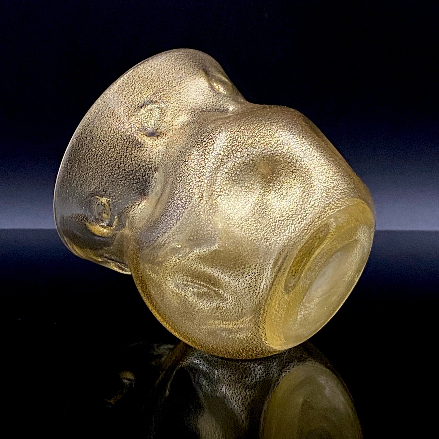 日本を代表するガラス工芸作家・岩田久利(1925–1994)の作品「燦(さん)」です。燦とは、『火の光が照りかがやいてあざやか、きらびやかで美しい』といった意味で、その名の通り、光り輝く存在感を放っています。全体にはきめ細やかな金箔が散りばめられ、手に取るとまるで光を抱いているかのような高級感があります。黄色味を帯びた外観は、実際には無数の微細な金箔によって構成されており、近くで見ると繊細な金細工の美しさが浮かび上がります。