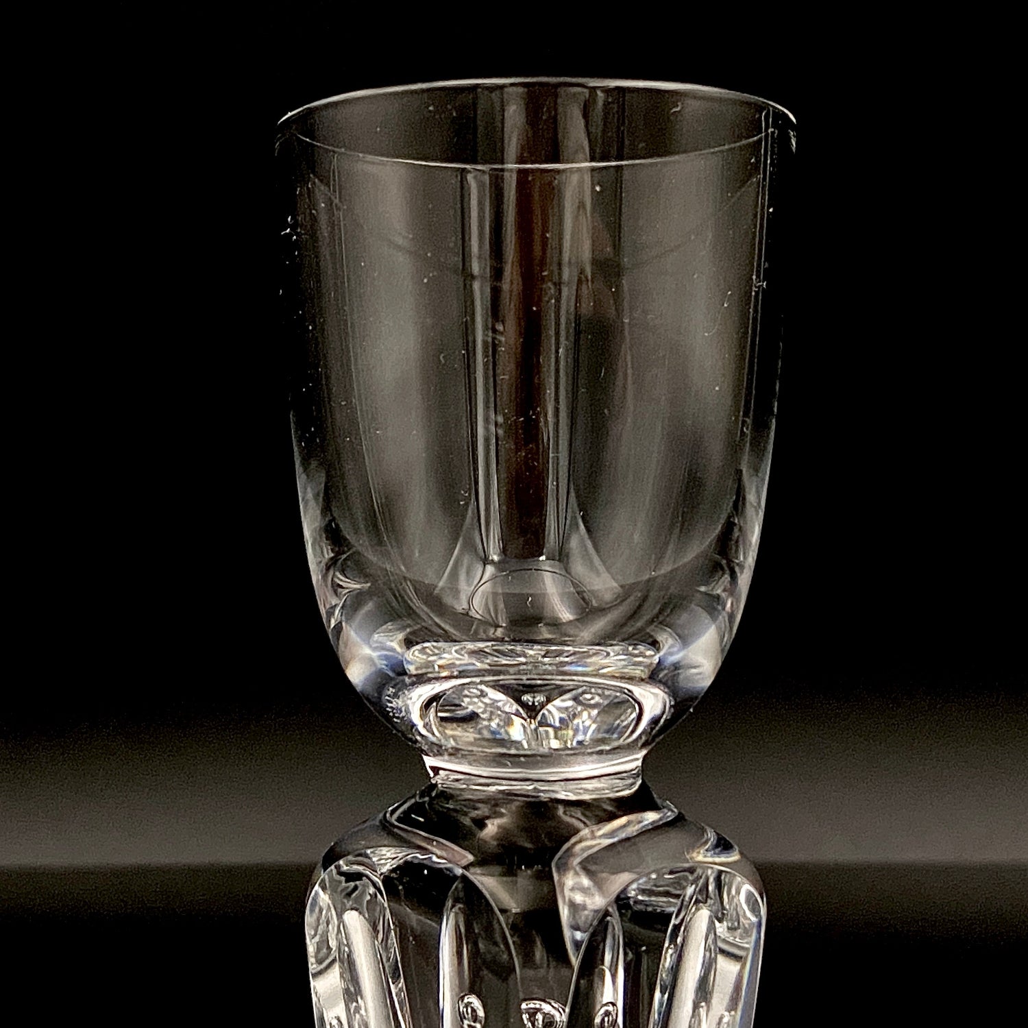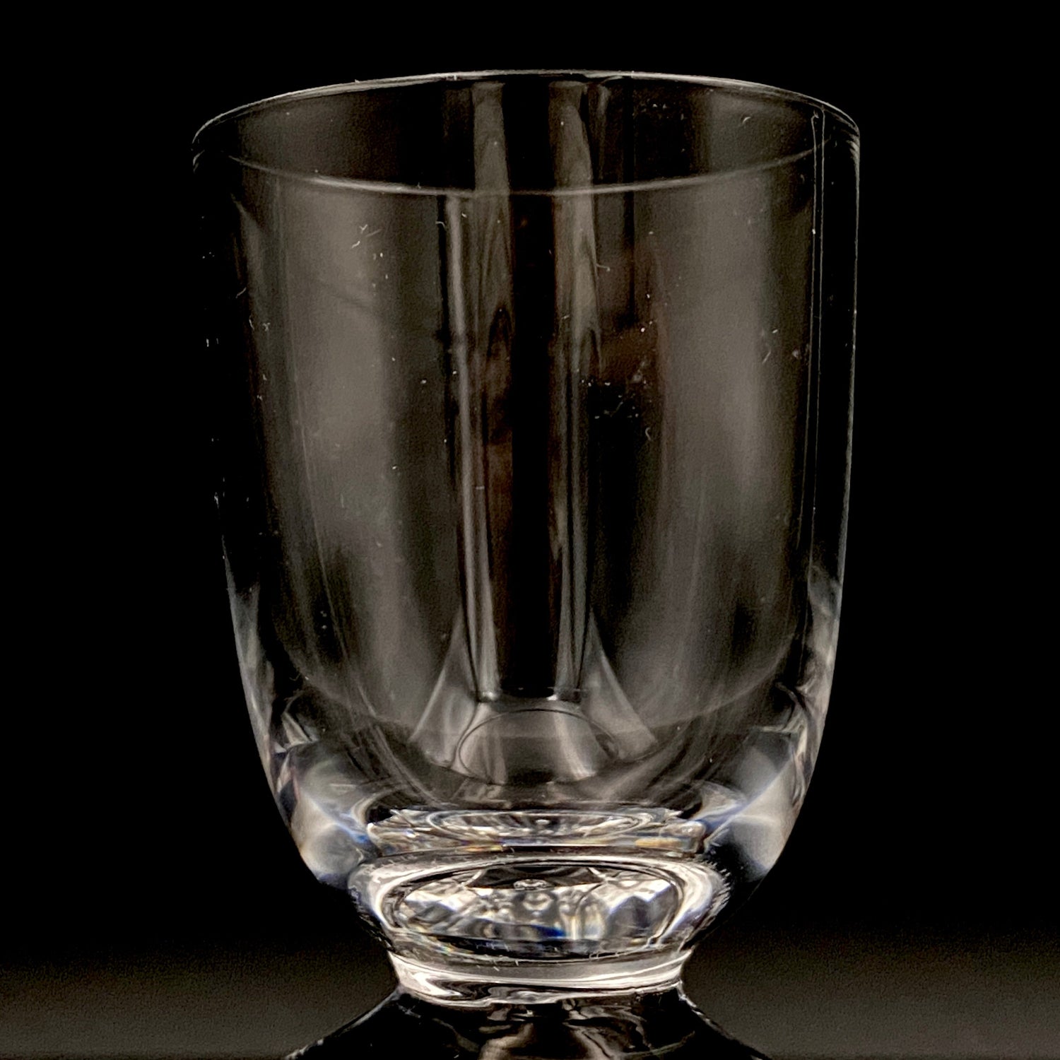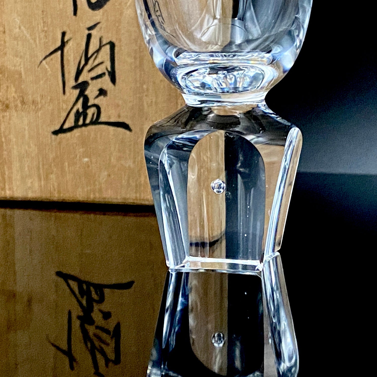 酒を注ぐボウル部分は端正な円筒型を成していますが、その底部を覗き込むと、流れる水や風を彷彿とさせる繊細な線刻模様が確認でき、硬質なクリスタルの中に柔らかなニュアンスを添えています。作品は横幅3.5cm、高さ8.0cmという小振りなサイズながら、実際に手に取った際にはクリスタル特有の心地よい重みと確かな質量感が掌に伝わります。共箱に記された力強い「丈夫作」の署名と落款は、素材の真価を問い続けた作家の誇りを象徴しています。光そのものをデザインの一部として取り込んだ本作は、端正なラインと底部の一粒の気泡の対比の中に、吉田丈夫の卓越した感性を余すところなく表現した傑作といえます。
