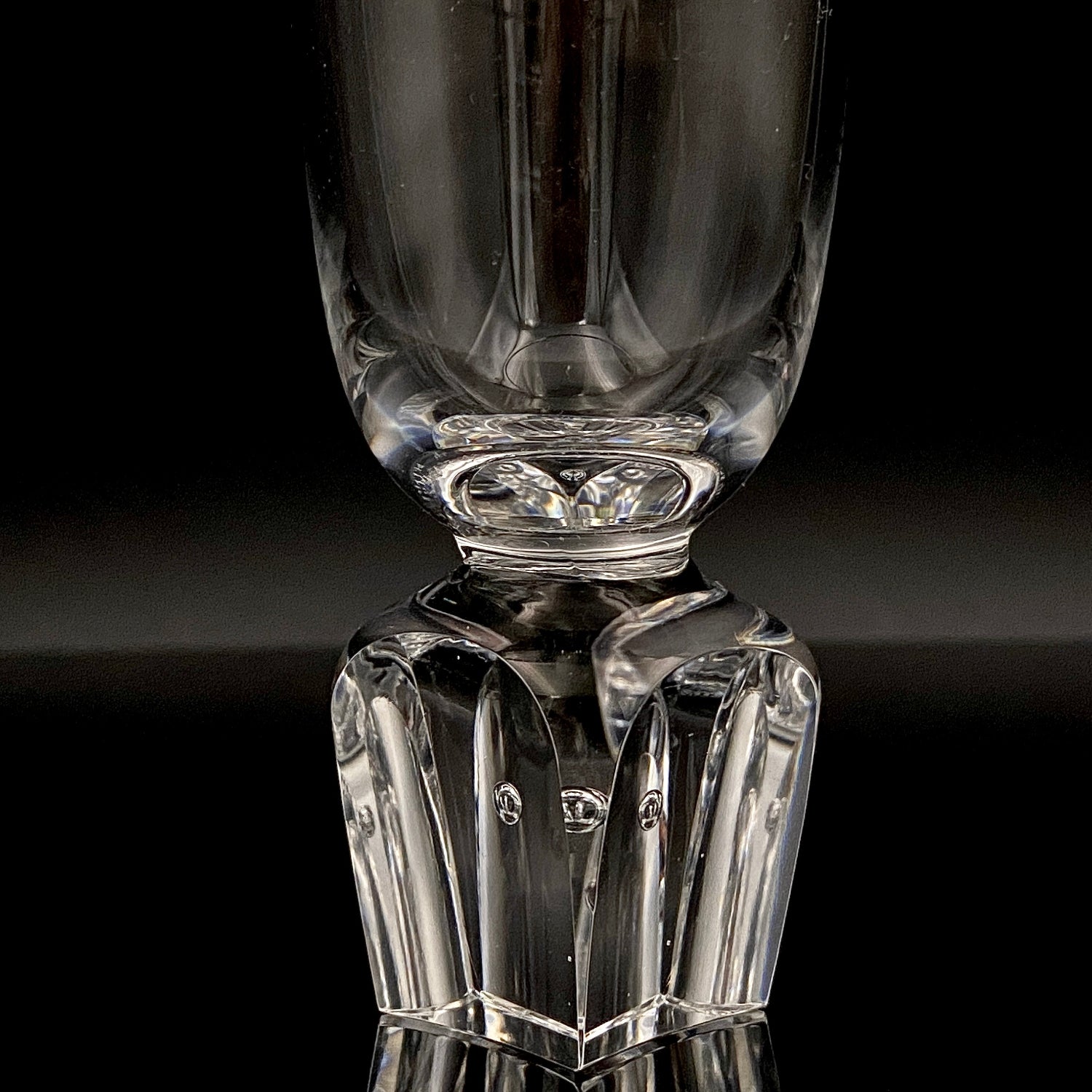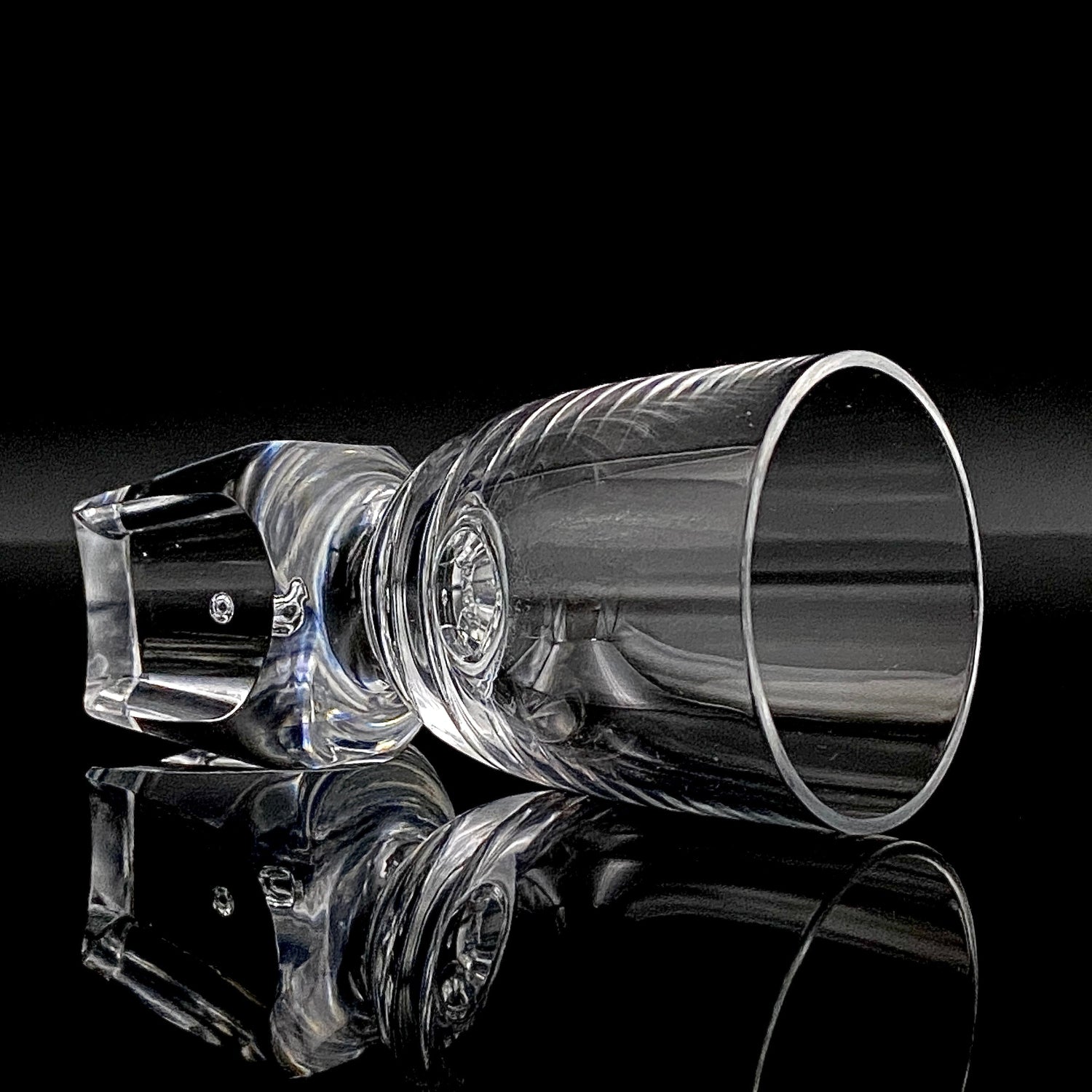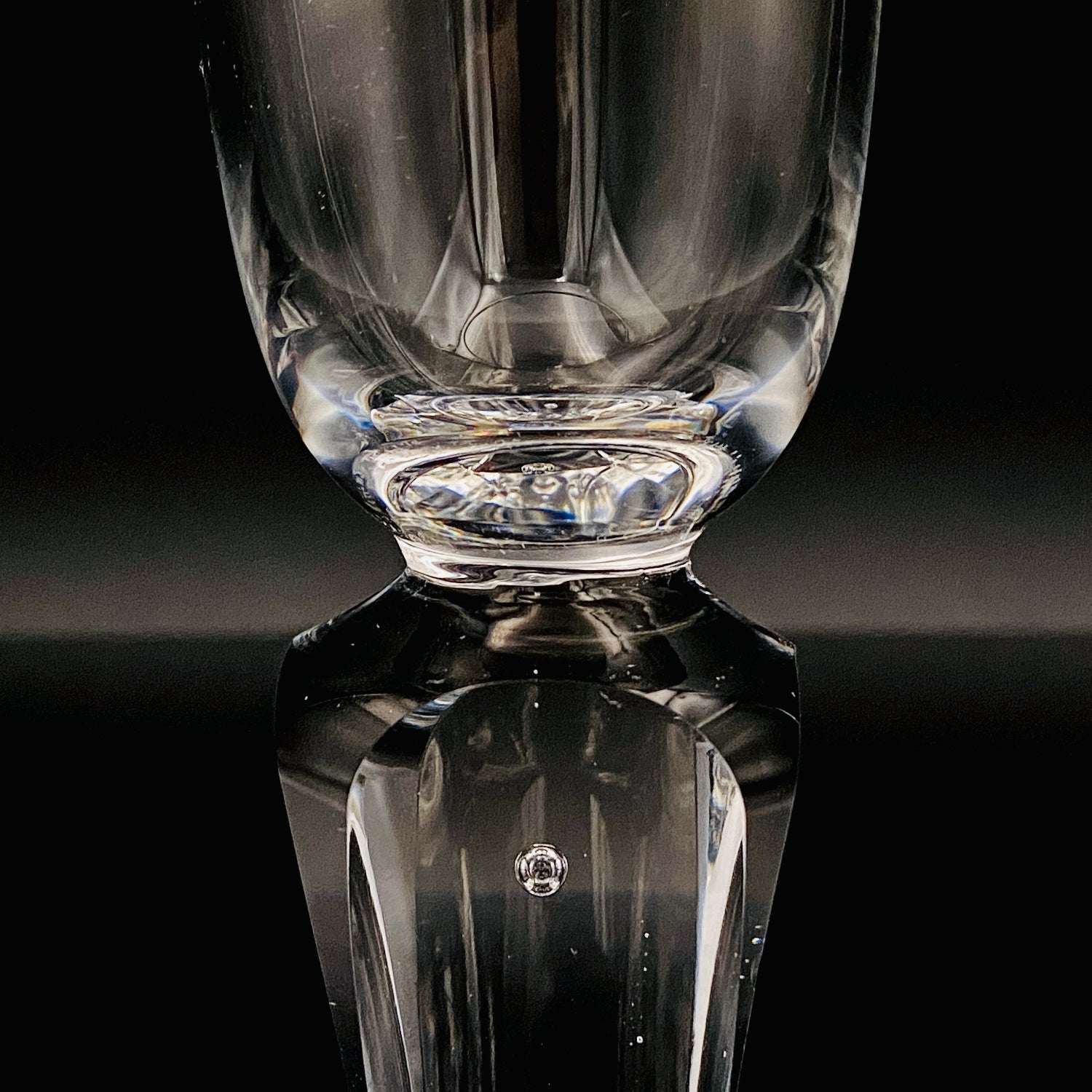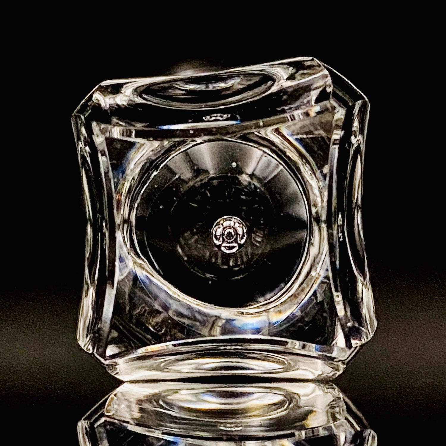 特に目を惹くのは、台座部分に施された重厚な「彫刻的な面取り」です。ガラスの塊から光を鋭く削り出したかのようなシャープなカッティングは、作家の代名詞とも言えるデザイン様式であり、彼が追い求めた「光の構造を形にする」という造形美を見事に体現しています。また、本作の大きな見どころは、台座の厚みがある底部の中心に一点の丸い気泡が意図的に閉じ込められている点にあります。不純物を極限まで排した空間に配されたこの一粒の空気は、周囲の面取りカットによって反射した光を中心へと集め、まるで銀色の宝石のような神秘的な輝きを放ちます。