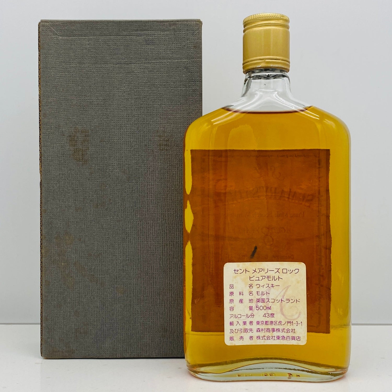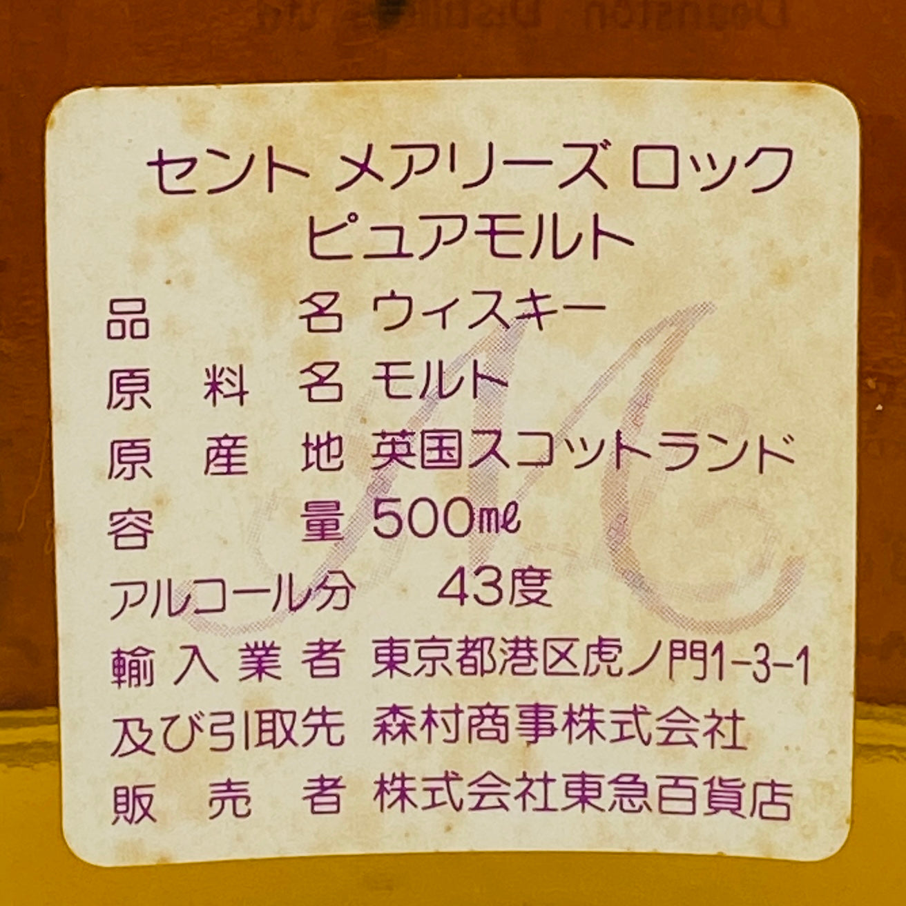 セント・メアリーズ・ロック 8年 ピュアモルト(St. Mary's Loch 8 Years Old Pure Malt Scotch Whisky)は、1980年代後半の日本における「ウイスキー特級」時代を象徴する、現在では大変希少なオールドボトルです。本品は、名門である森村商事株式会社が輸入を担い、東急百貨店を通じて販売されていたもので、当時の日本の高級酒市場における贈答文化と品質への信頼を色濃く反映した歴史的な一品です。