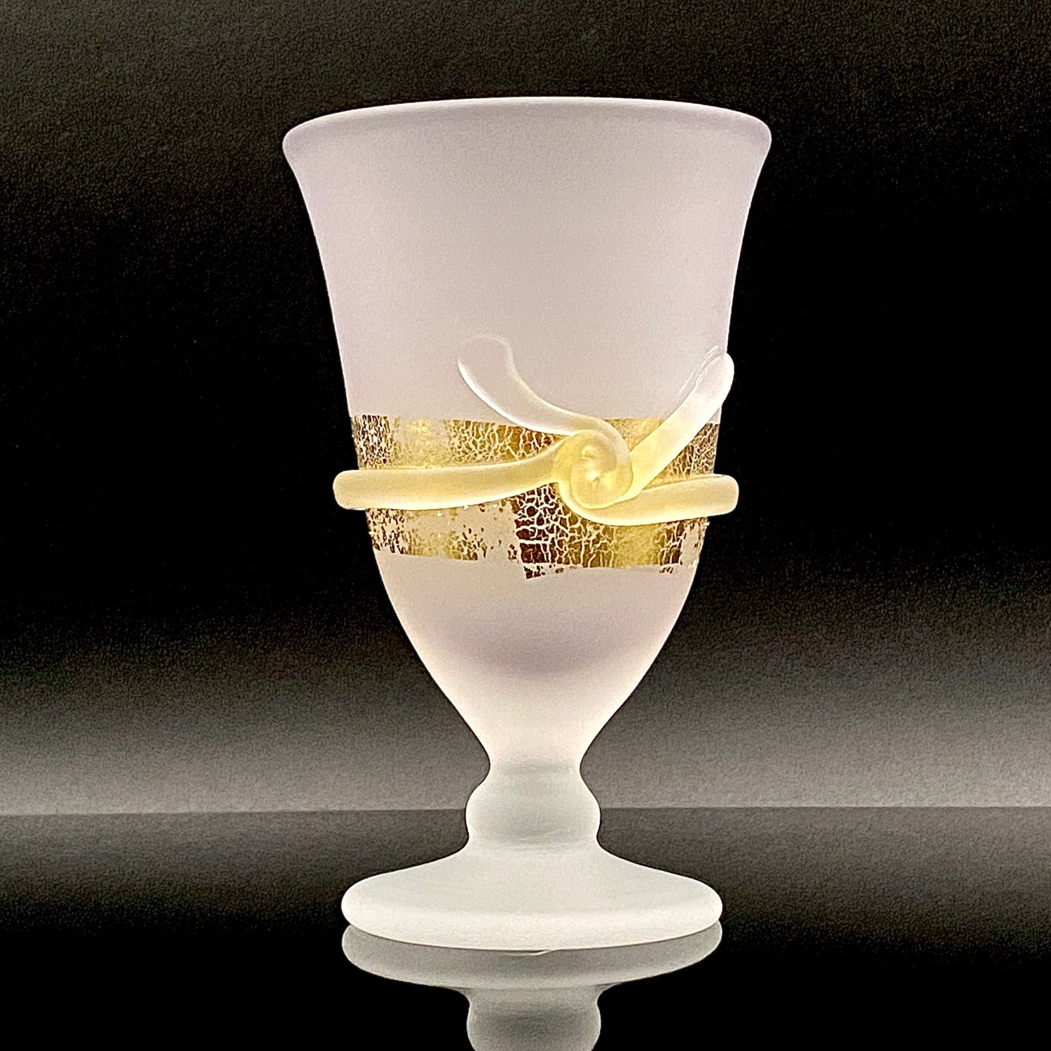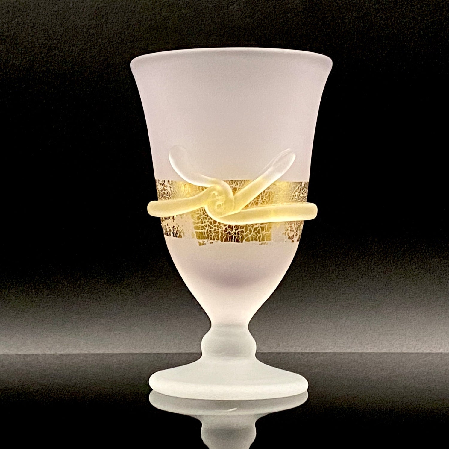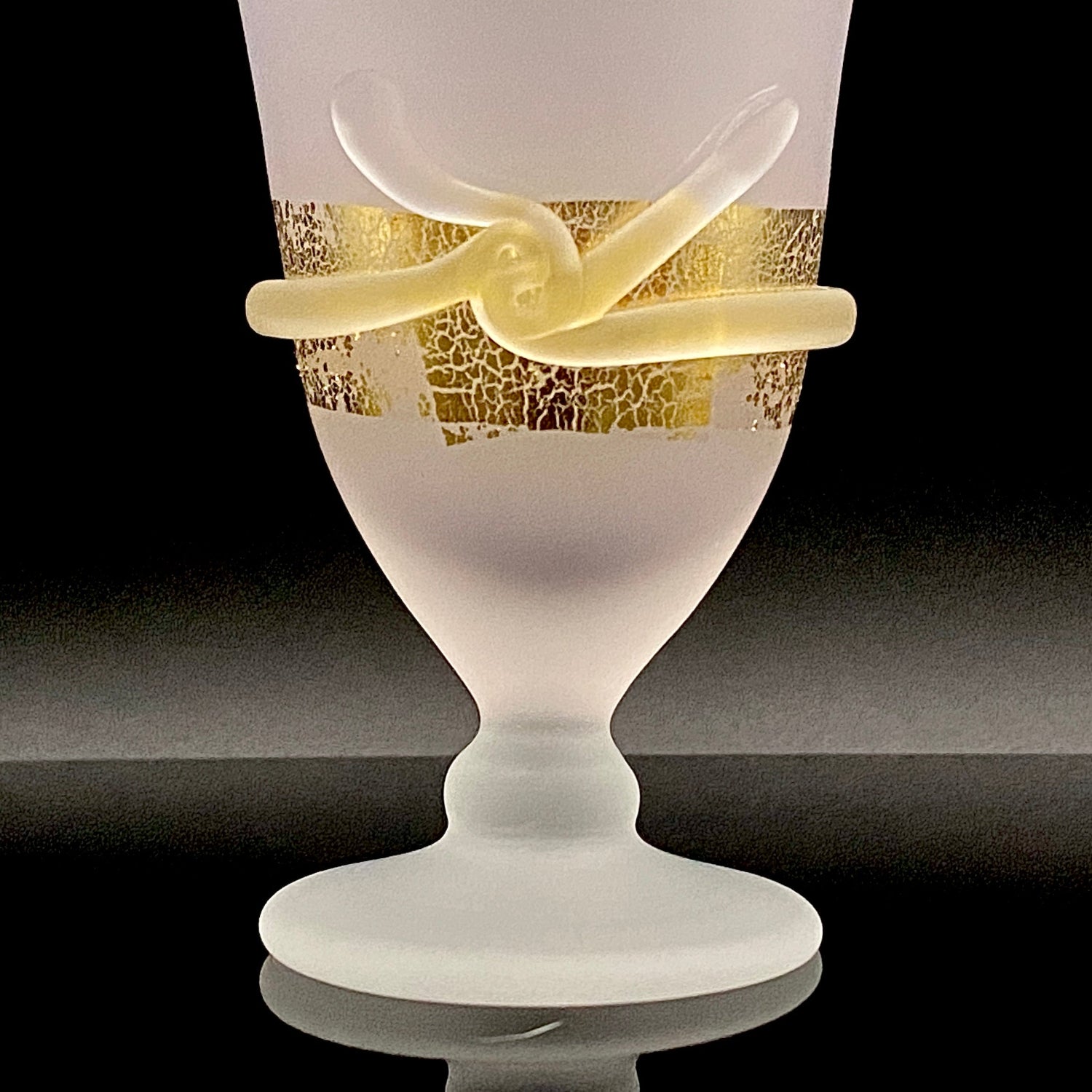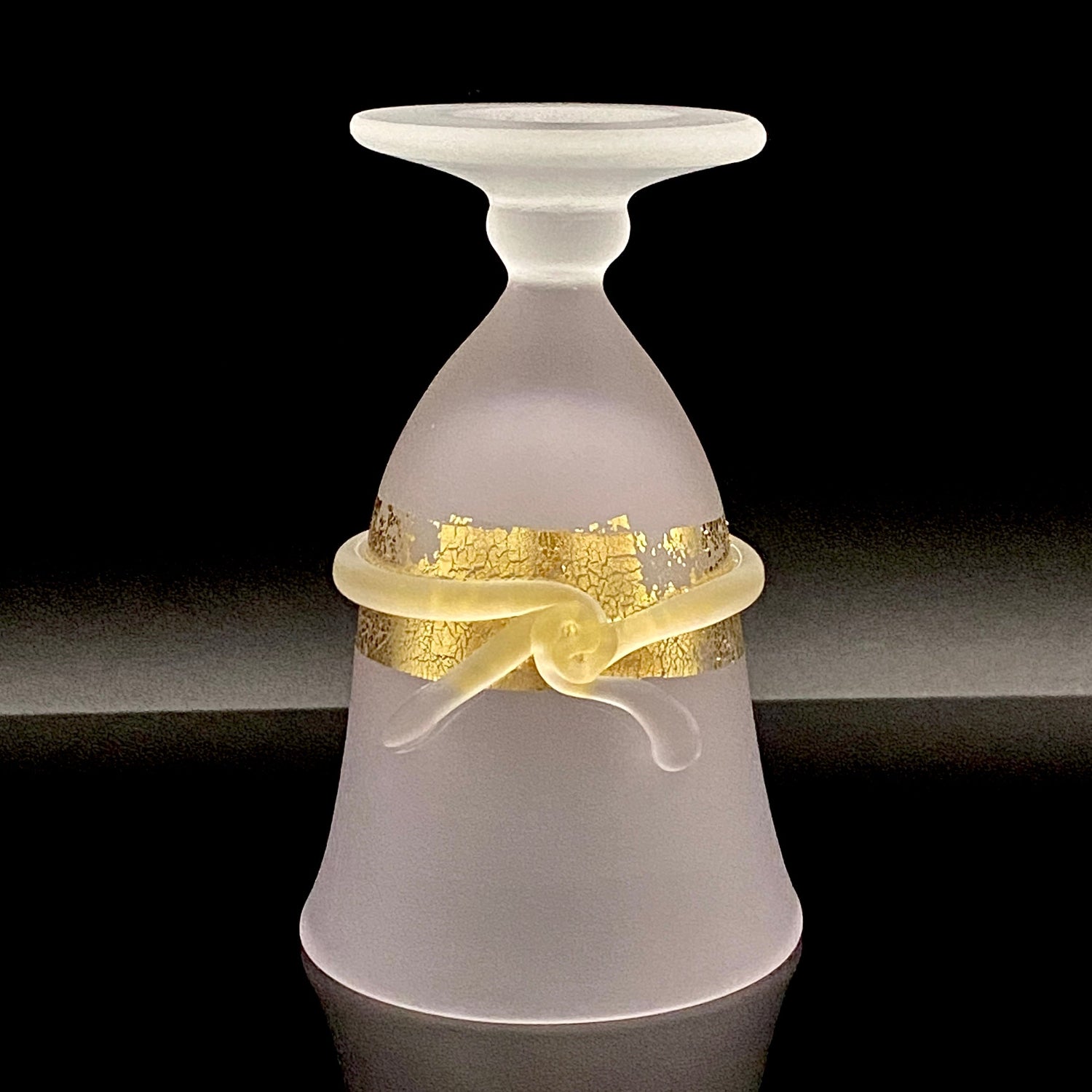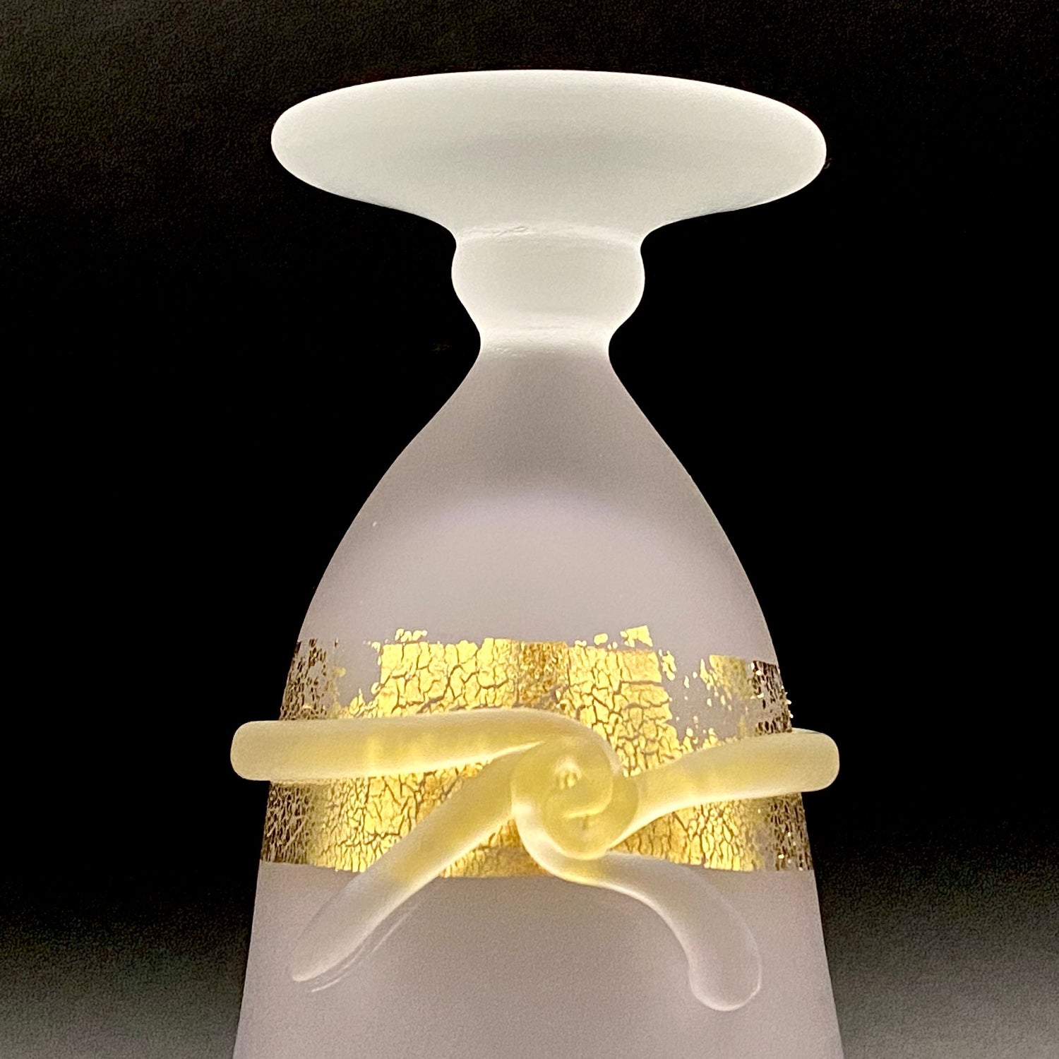 石井氏の作品の最大の魅力は、厳しい北国の冬を思わせるような、静謐で気品あふれるフロスト加工の質感にあります。そのマットな硝子肌を贅沢に彩る金彩細工は、単なる表面的な装飾に留まらず、硝子の透明感と対比させることで、光の角度によって幾重にも表情を変える奥深い輝きを放っています。特筆すべきは、胴回りに施された「結び」の意匠です。日本文化において「結び」は人と人、あるいは心と心を繋ぐ神聖な象徴とされますが、これを熱した瞬間に硬化する硝子で表現することは、極めて高度な職人技を要します。迷いのない筆致のような硝子の曲線が金彩を抱きかかえる姿は、まさに石井氏が追求した「日本らしさ」の結晶と言えるでしょう。
