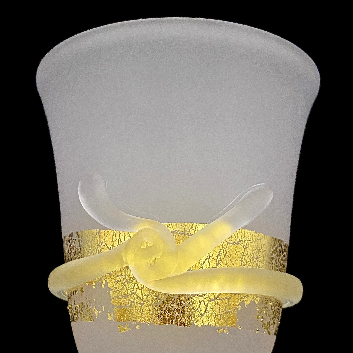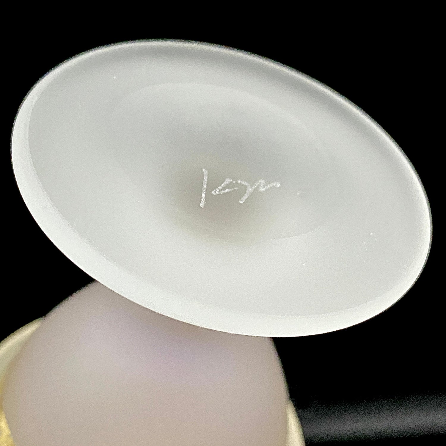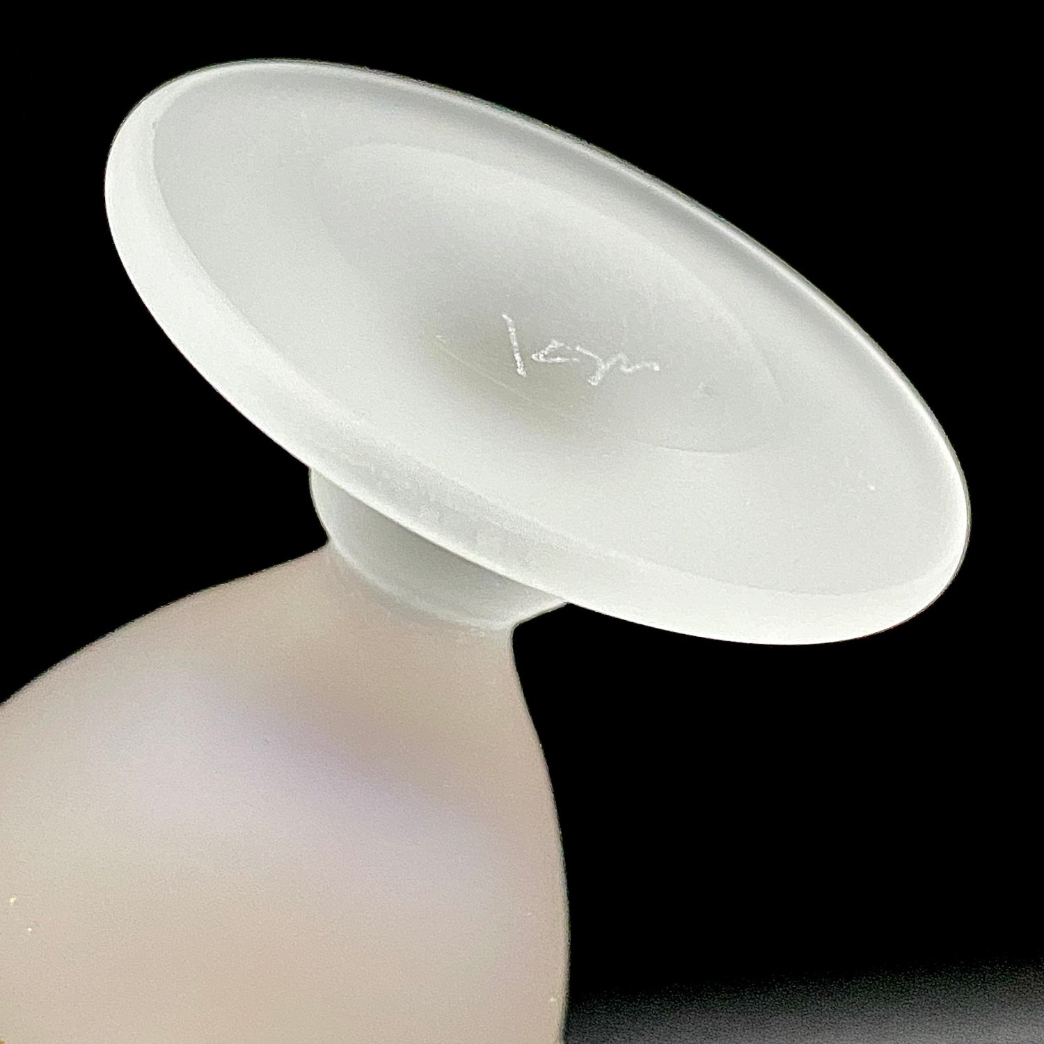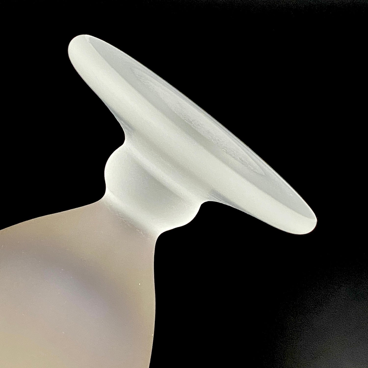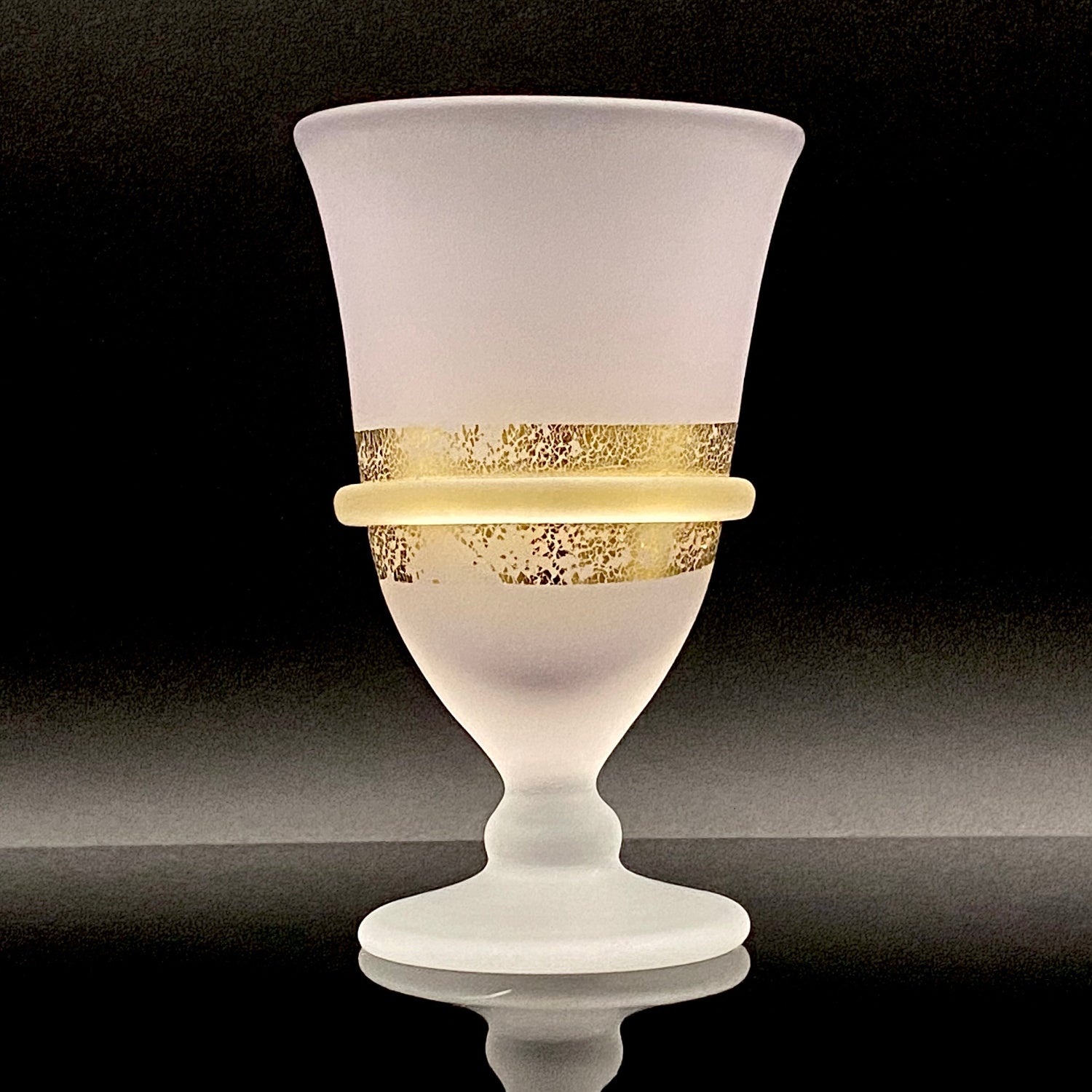 石井氏の作品の最大の魅力は、厳しい北国の冬を思わせるような、静謐で気品あふれるフロスト加工の質感にあります。そのマットな硝子肌を贅沢に彩る金彩細工は、単なる表面的な装飾に留まらず、硝子の透明感と対比させることで、光の角度によって幾重にも表情を変える奥深い輝きを放っています。特筆すべきは、胴回りに施された「結び」の意匠です。日本文化において「結び」は人と人、あるいは心と心を繋ぐ神聖な象徴とされますが、これを熱した瞬間に硬化する硝子で表現することは、極めて高度な職人技を要します。迷いのない筆致のような硝子の曲線が金彩を抱きかかえる姿は、まさに石井氏が追求した「日本らしさ」の結晶と言えるでしょう。