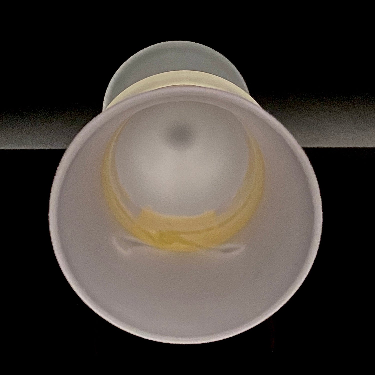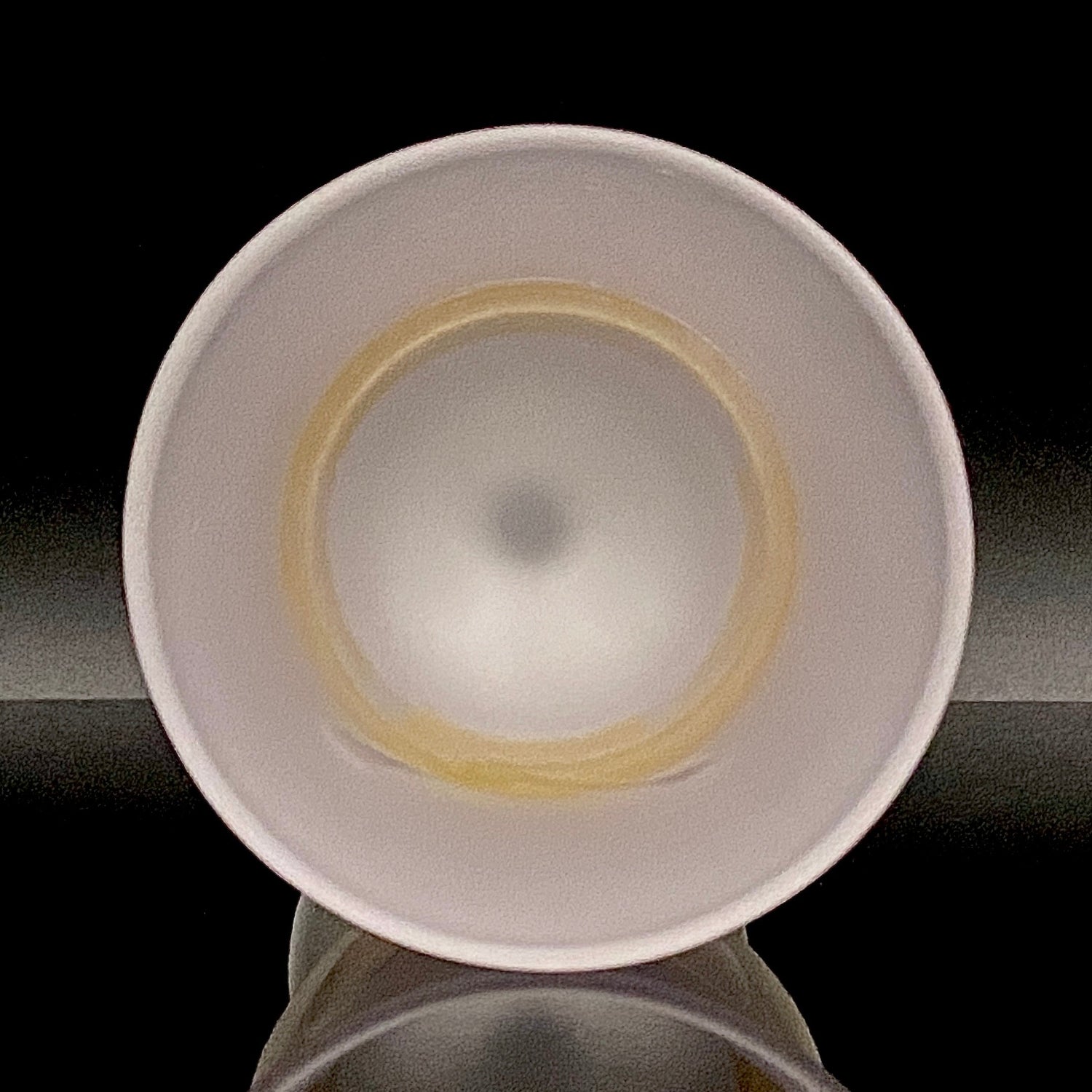 また、本作のような「ステム(脚)のある酒杯」の構造は、硝子工芸において最も製作難易度が高い形状の一つです。手吹きによって成形される過程で、薄い脚部には極度の熱応力がかかり、冷却段階での破損や歪みが非常に多く発生するため、完成に至るまでには並大抵ではない集中力と熟練の技術が求められます。底裏に刻まれた氏のサインは、その過酷な工程を乗り越え、厳しい検品を通過した真作であることの証です。共箱とともに大切に受け継がれてきたこの酒杯は、単なる酒器としての機能を越え、持ち主の手に馴染むたびに石井康治氏が硝子に込めた情熱と狂気を伝えてくれるはずです。
