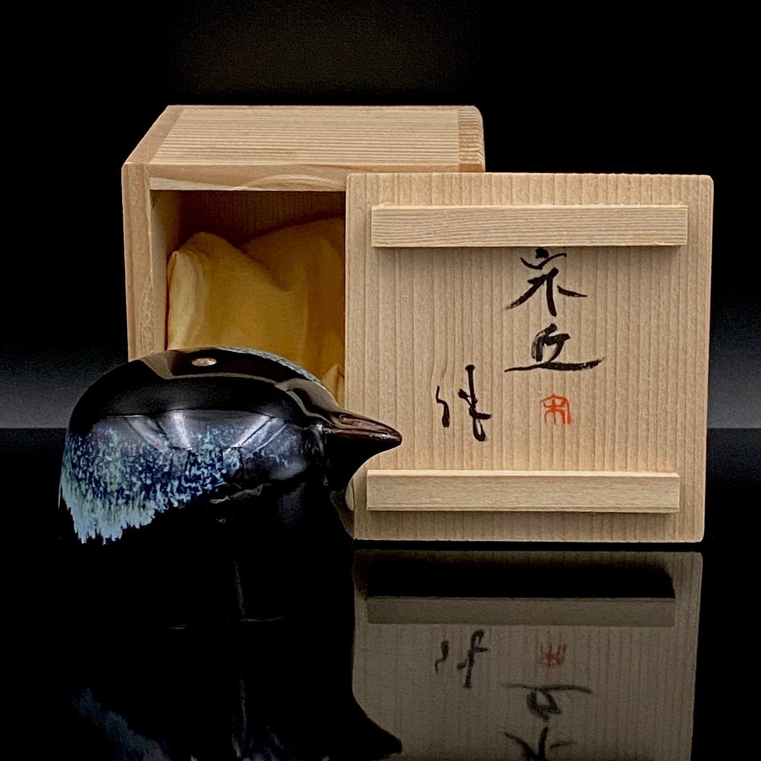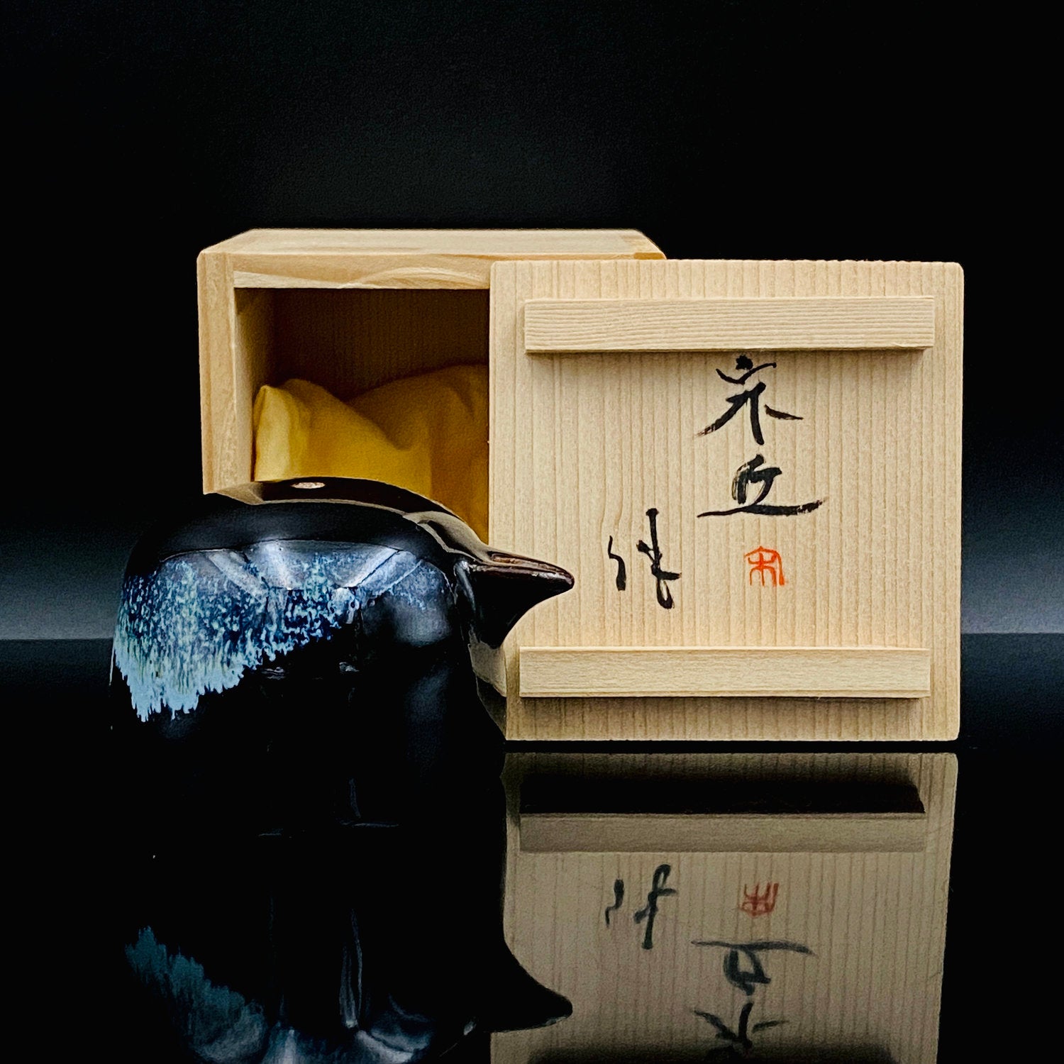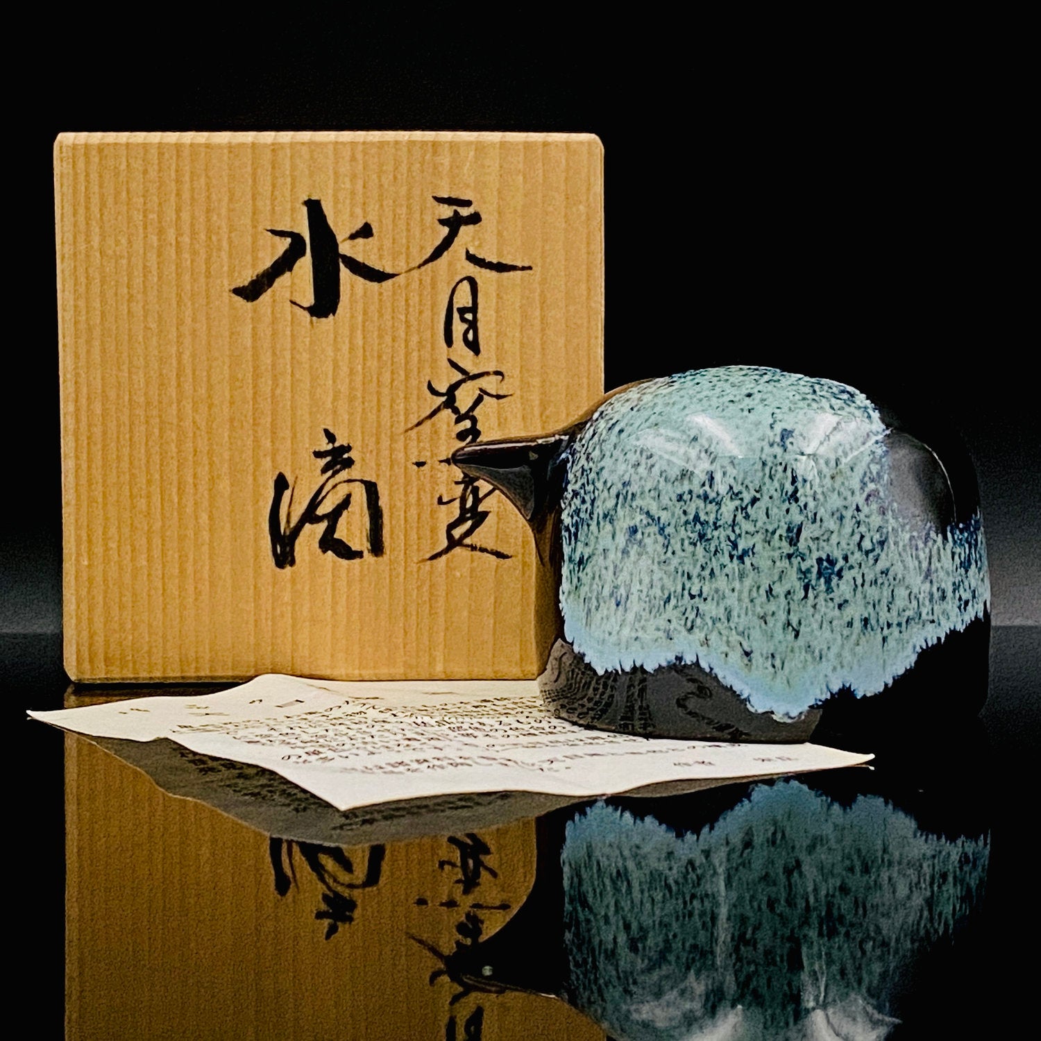 本作品は、久保義蔵氏の熟練した技術によって生み出された天目窯変の水滴です。天目窯変は、窯の内部で発生する複雑な炎の作用によって釉薬が独特の結晶や色彩へと変化する高度な技法であり、作家の計算と炎の偶然が交差する一点物の美しさを備えています。1989年に逝去した氏の作品は、現在では新たに制作されることのない物故作家の遺作として高い希少性を有しています。