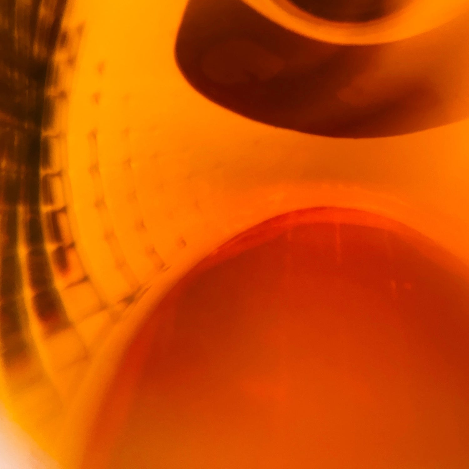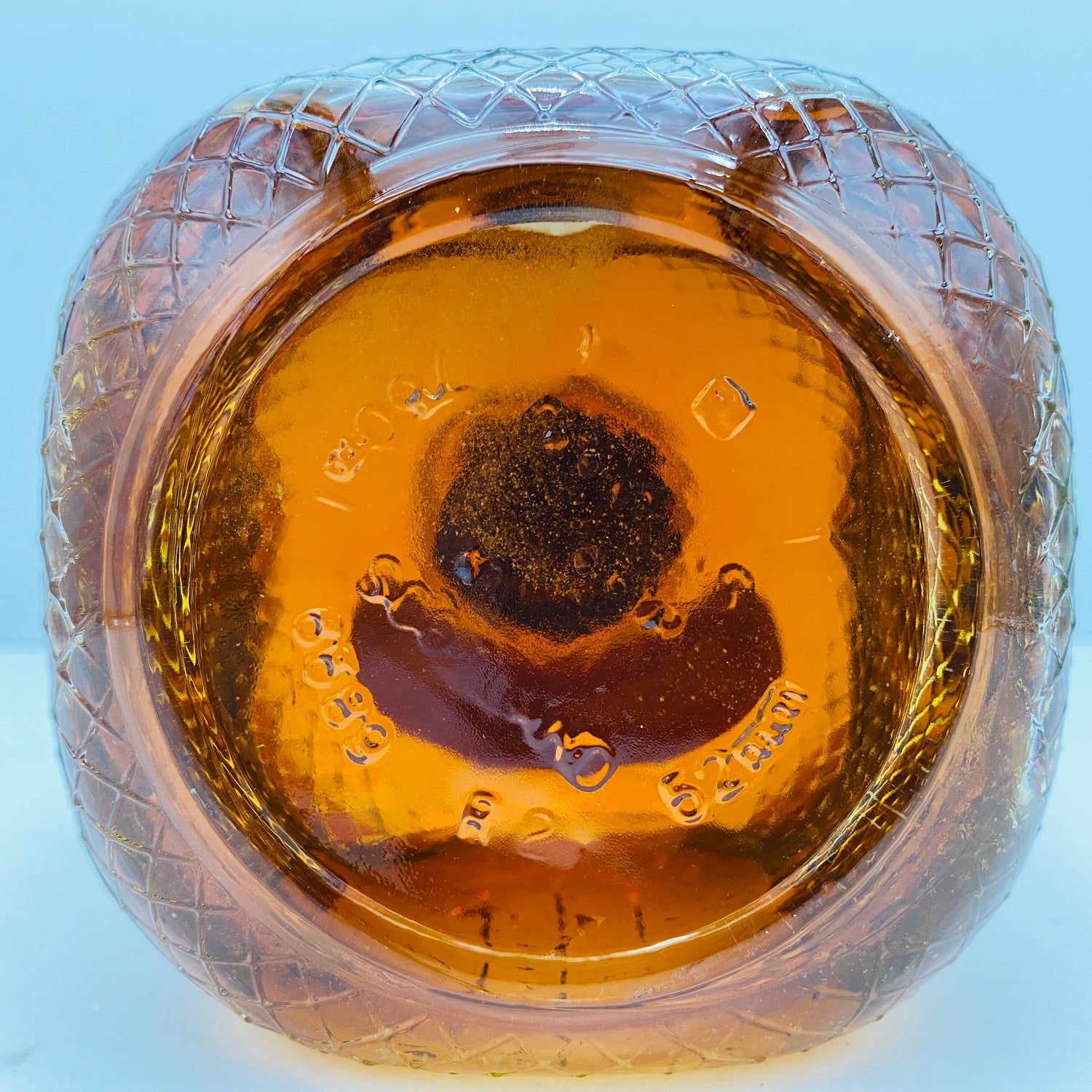 ボトル形状は、中世のフラスク(平たい酒瓶)を思わせる独特の丸みを帯びた扁平な形をしており、表面全体には網目状のエンボス加工(型押し)が施されています。この立体的な意匠が、光を受けるたびに琥珀色のウイスキーを複雑に輝かせ、重厚な雰囲気を与えています。