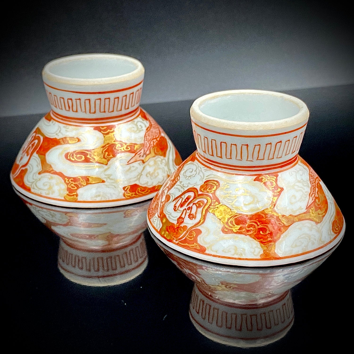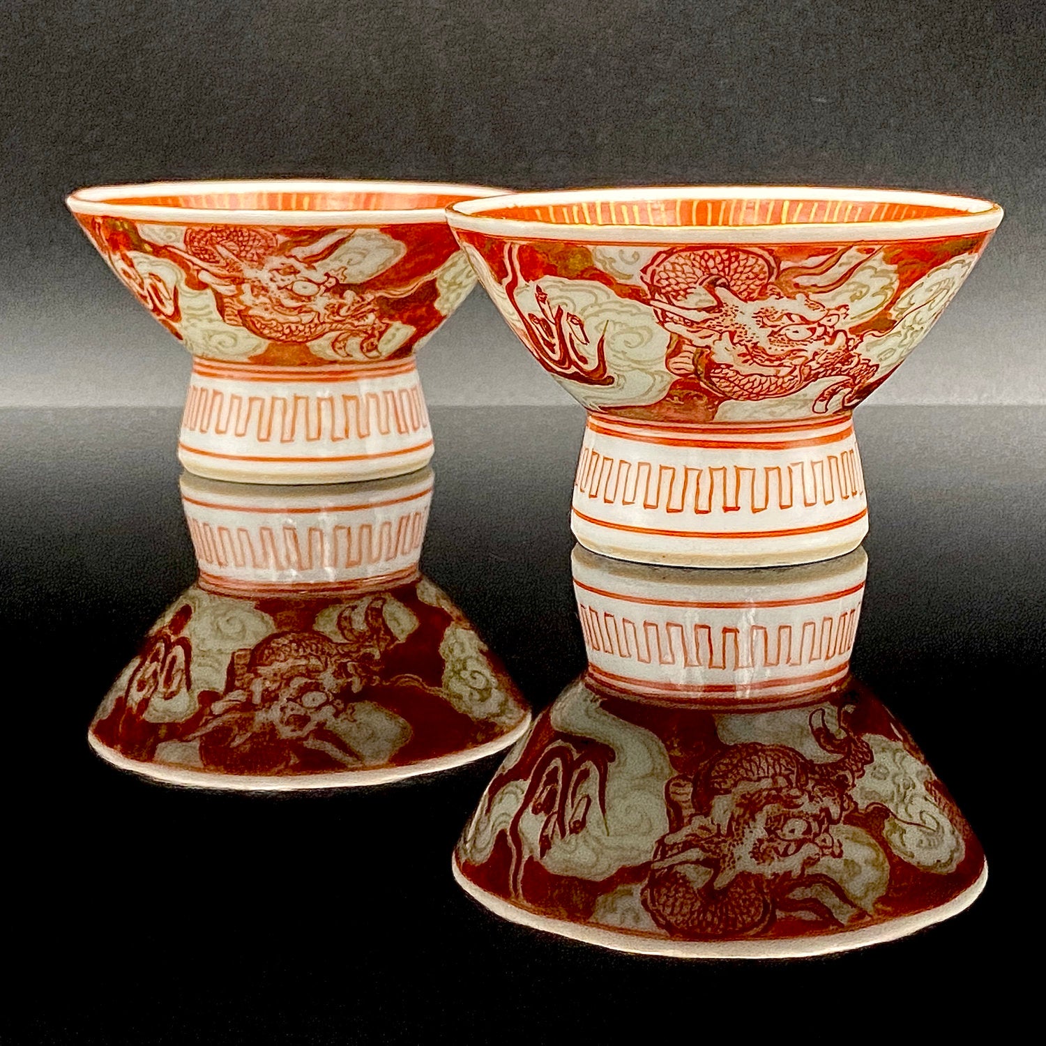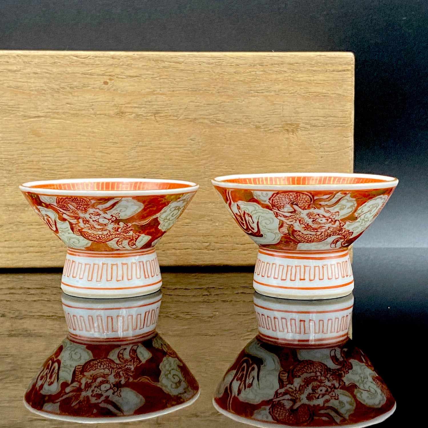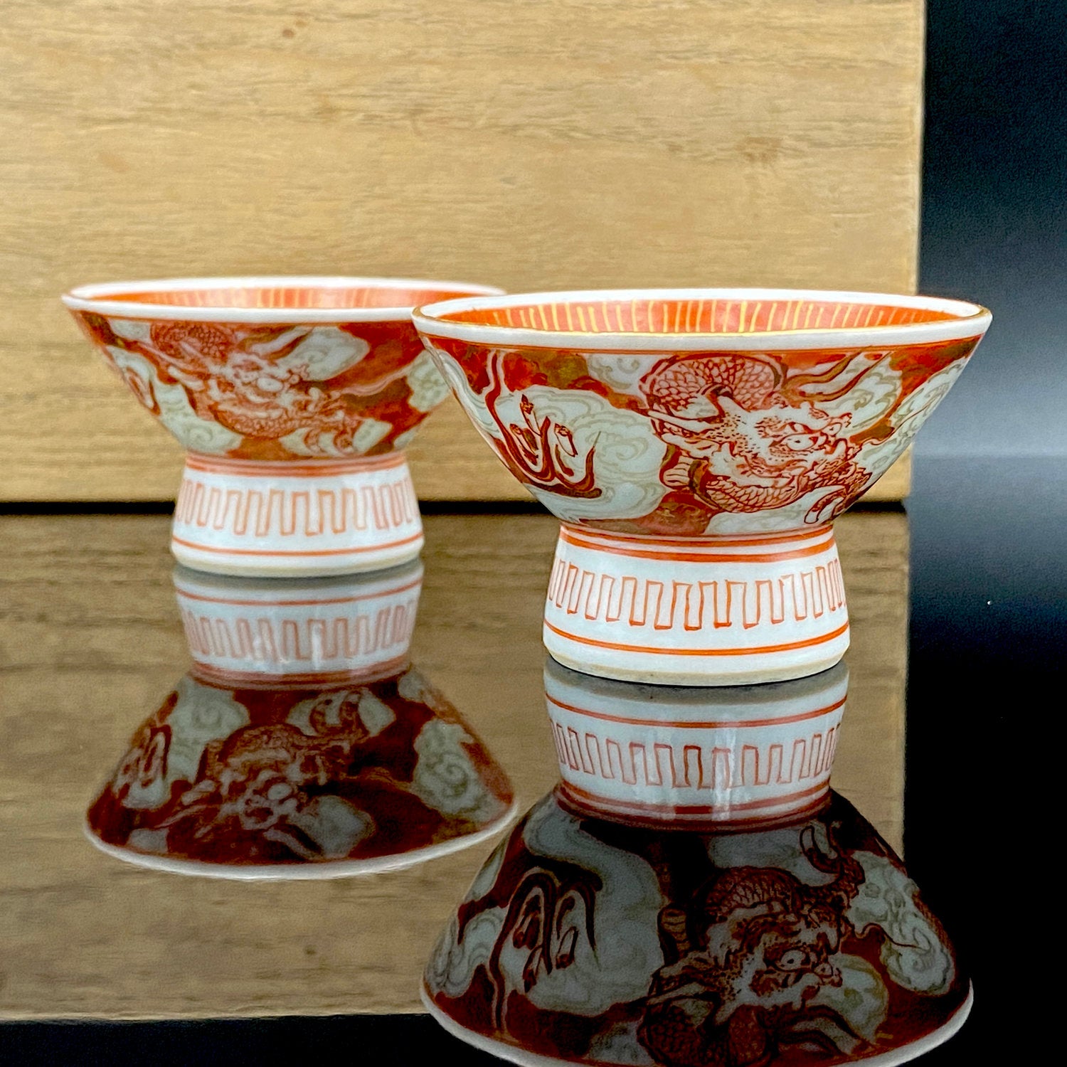谷 秋渓 作 金彩赤絵細描 雲龍文 酒盃 二客 昭和初期制作 竹内吟秋門下の真髄 下絵なしの極細一筆書き龍模様 ジャパニーズコウゲイの至宝 #203