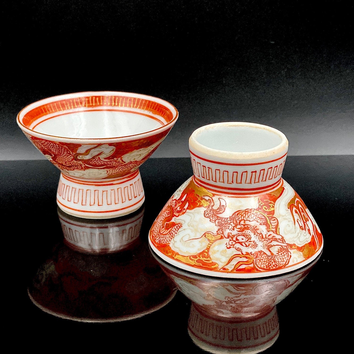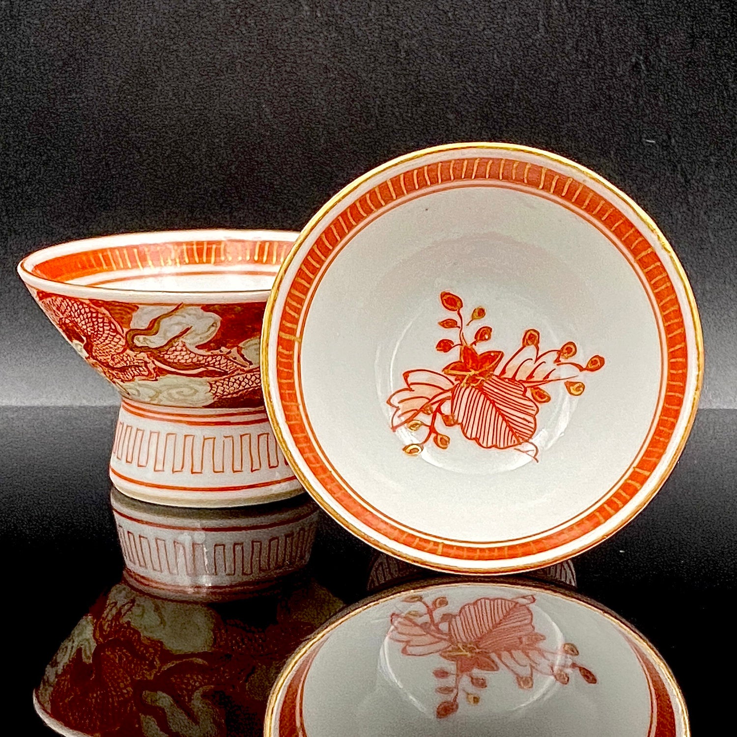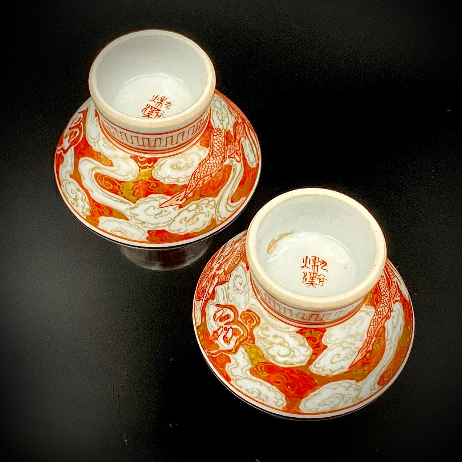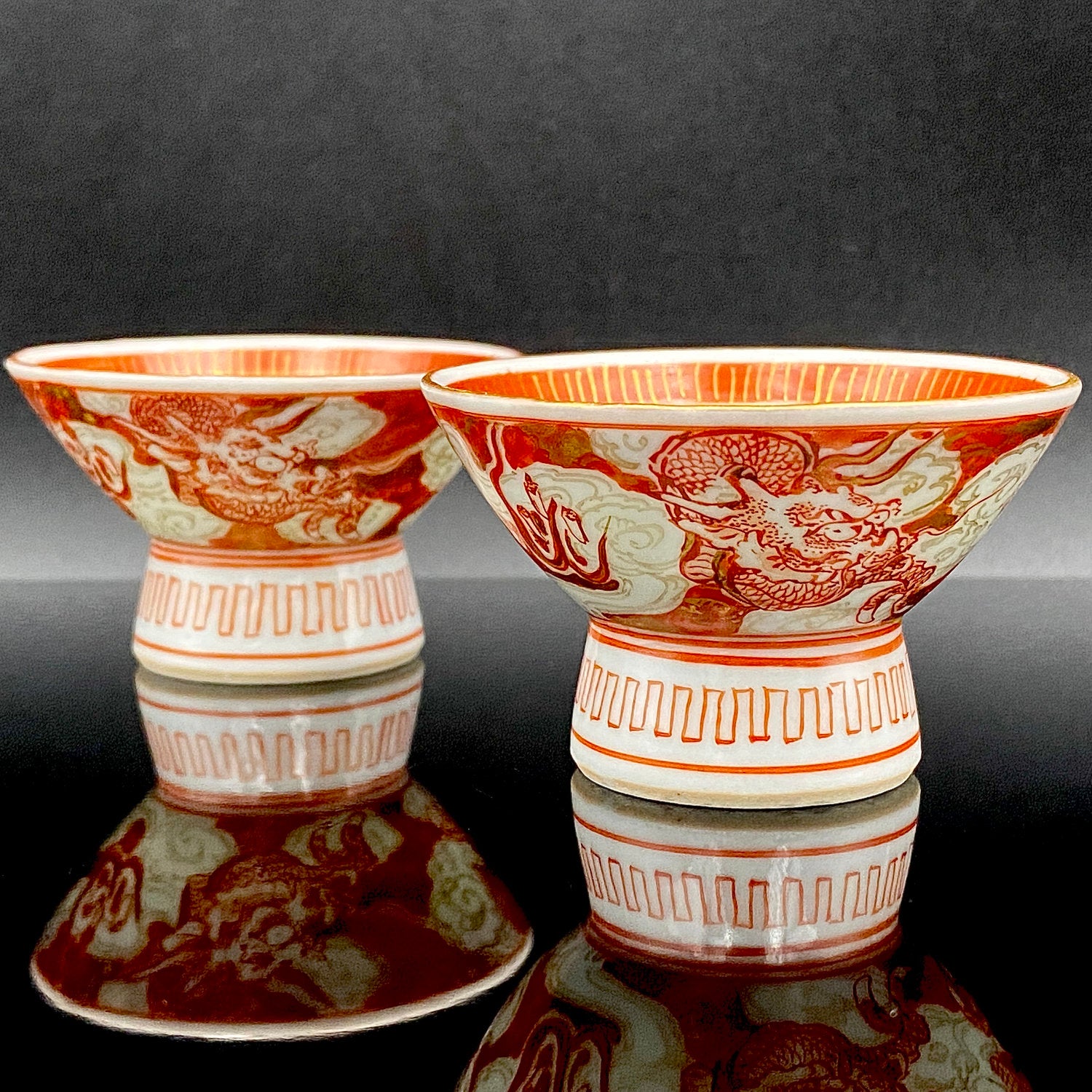 谷 秋渓 作 金彩赤絵細描 雲龍文 酒盃 二客 昭和初期制作 竹内吟秋門下の真髄 下絵なしの極細一筆書き龍模様 ジャパニーズコウゲイの至宝 #203