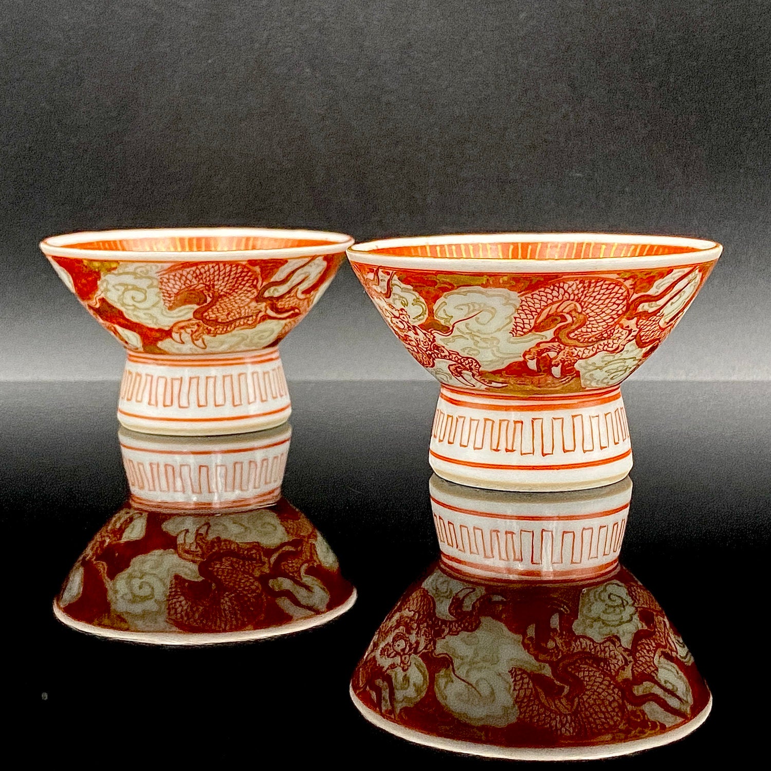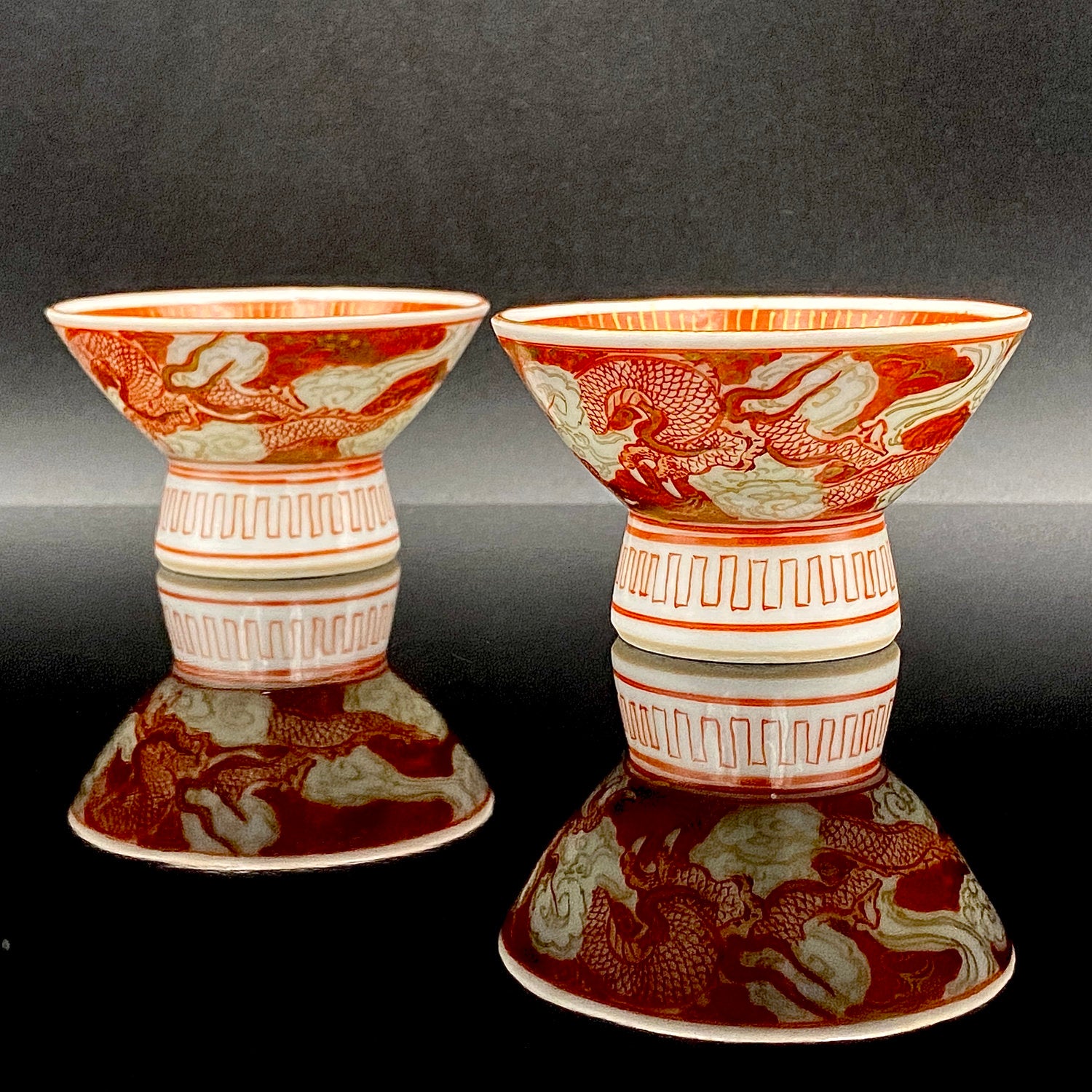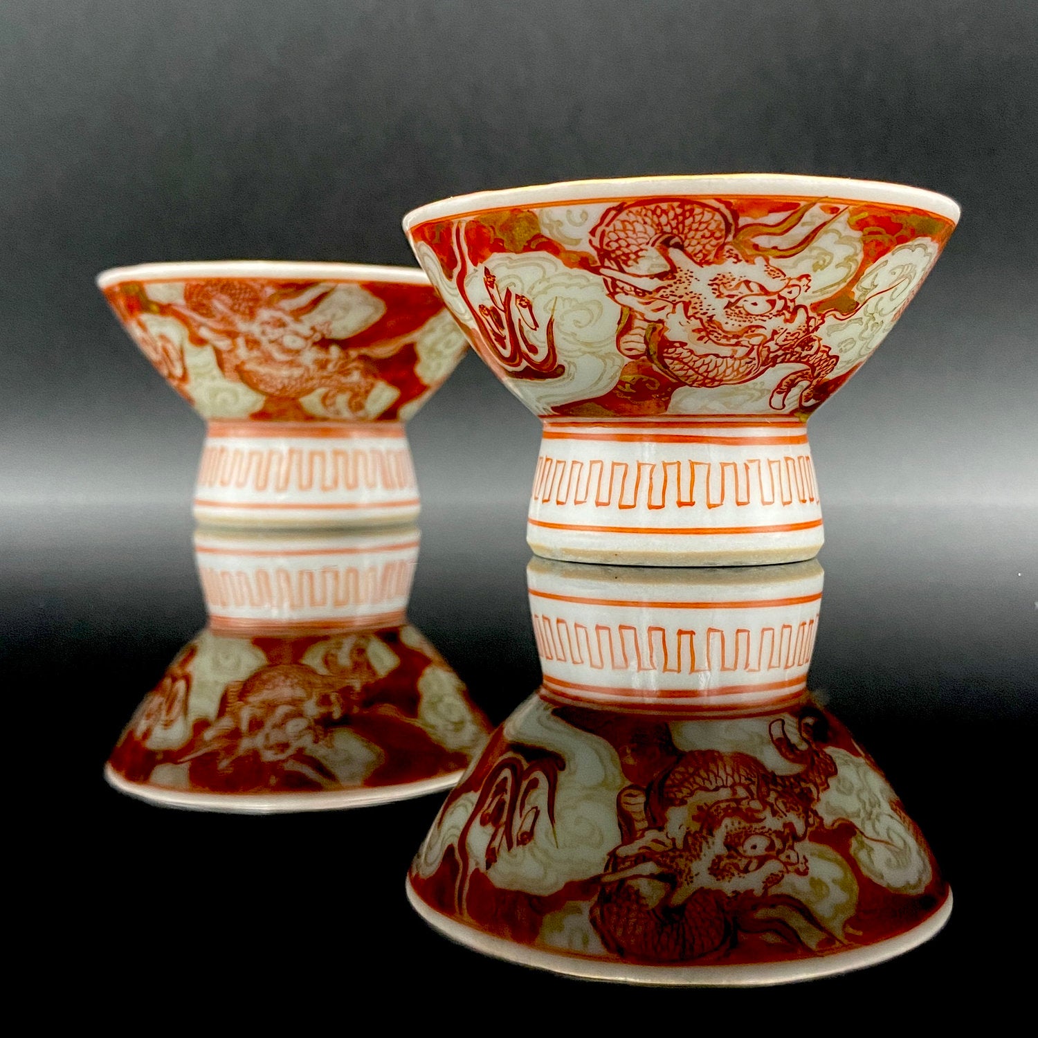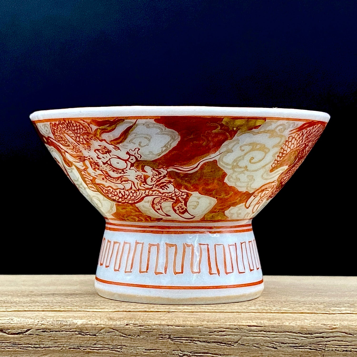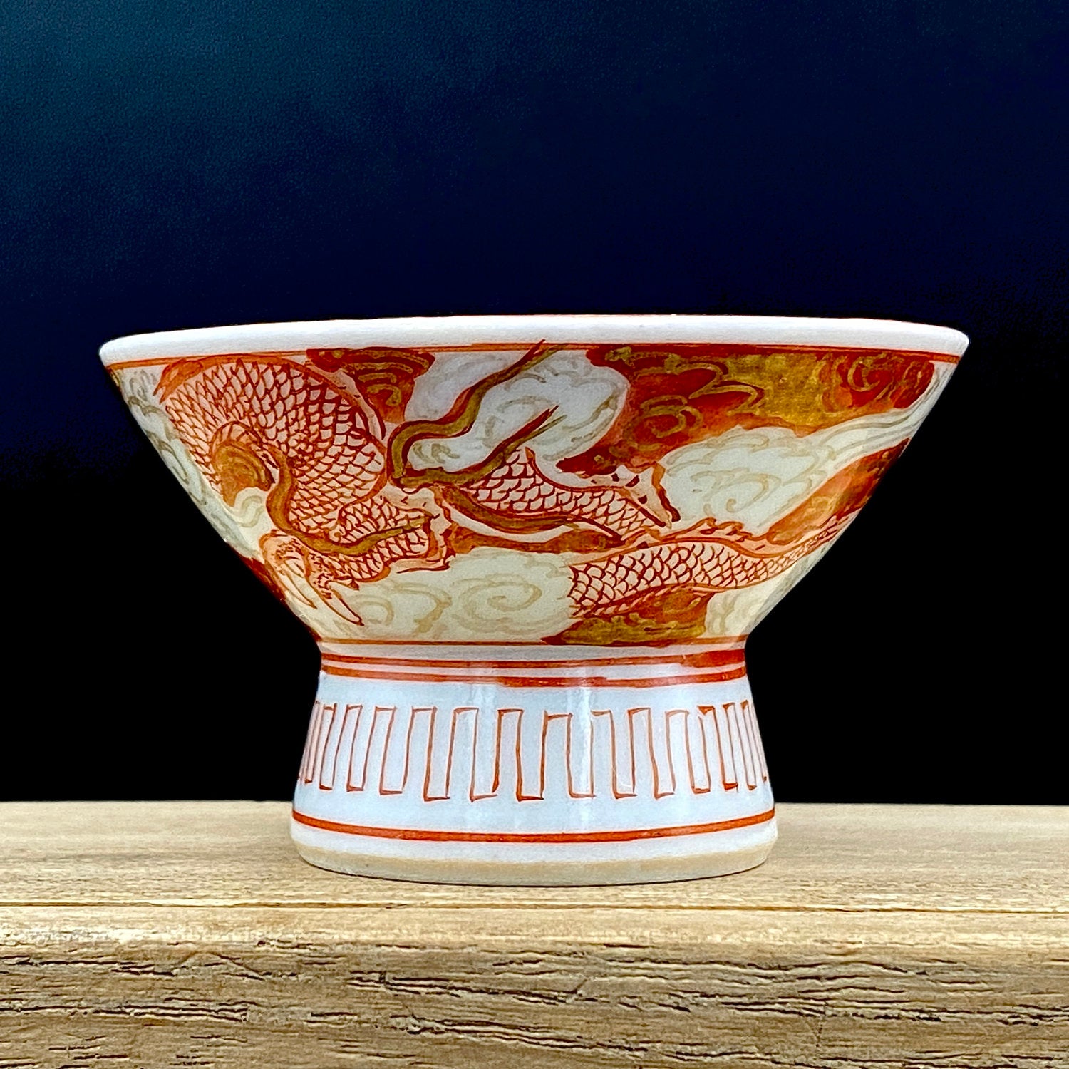谷 秋渓 作 金彩赤絵細描 雲龍文 酒盃 二客 昭和初期制作 竹内吟秋門下の真髄 下絵なしの極細一筆書き龍模様 ジャパニーズコウゲイの至宝 #203
