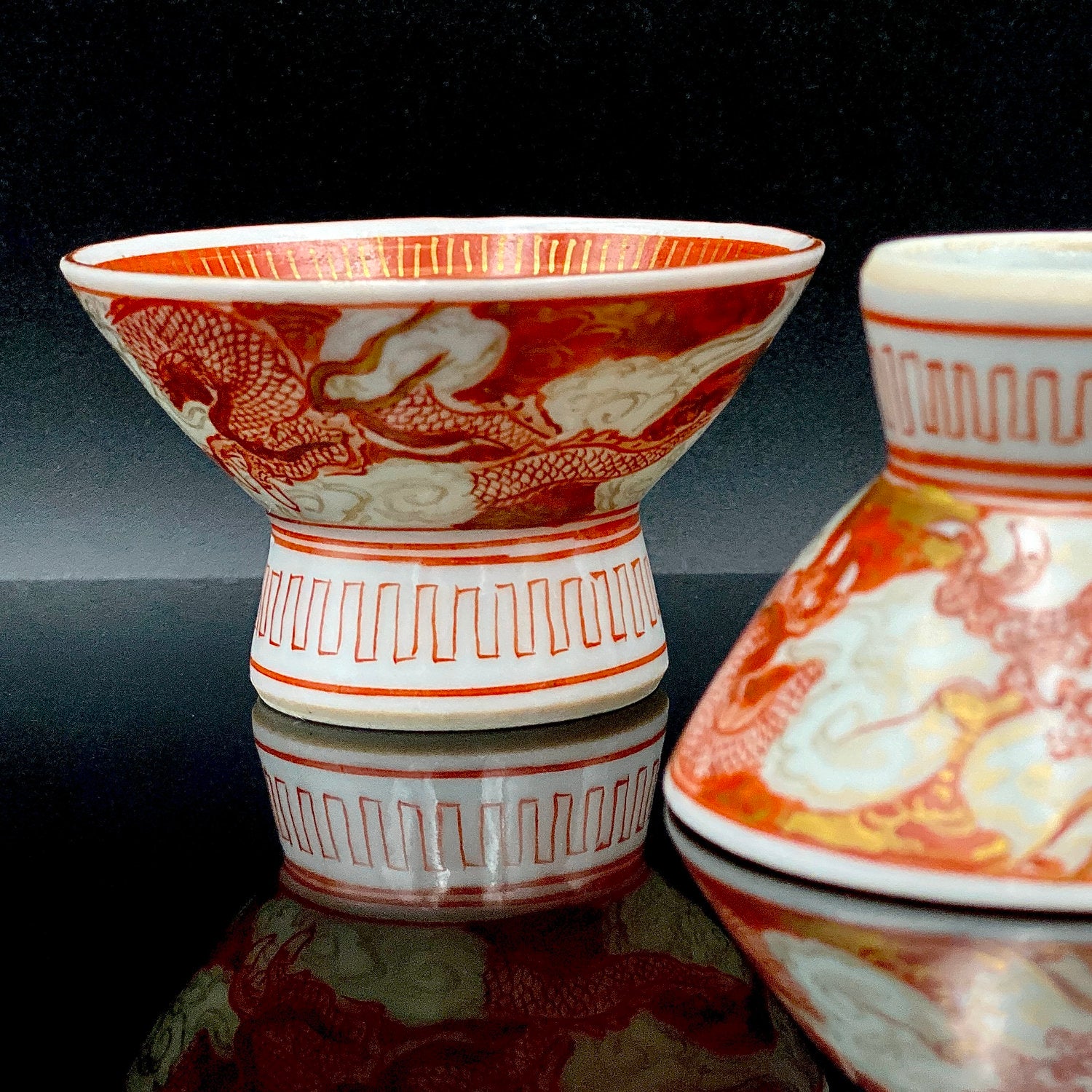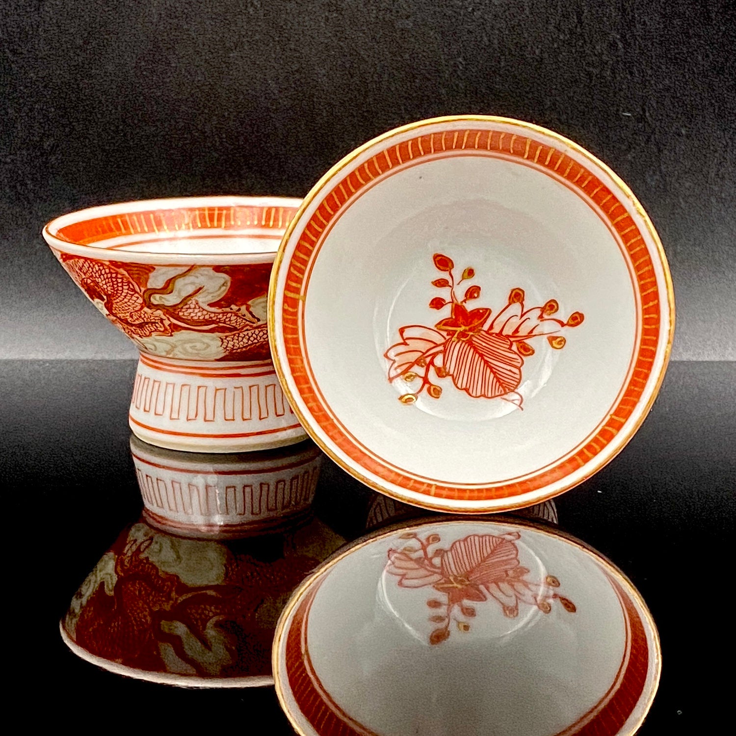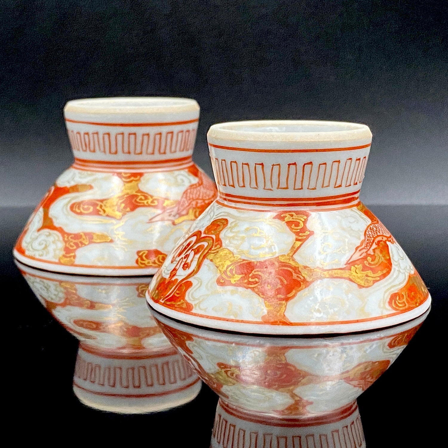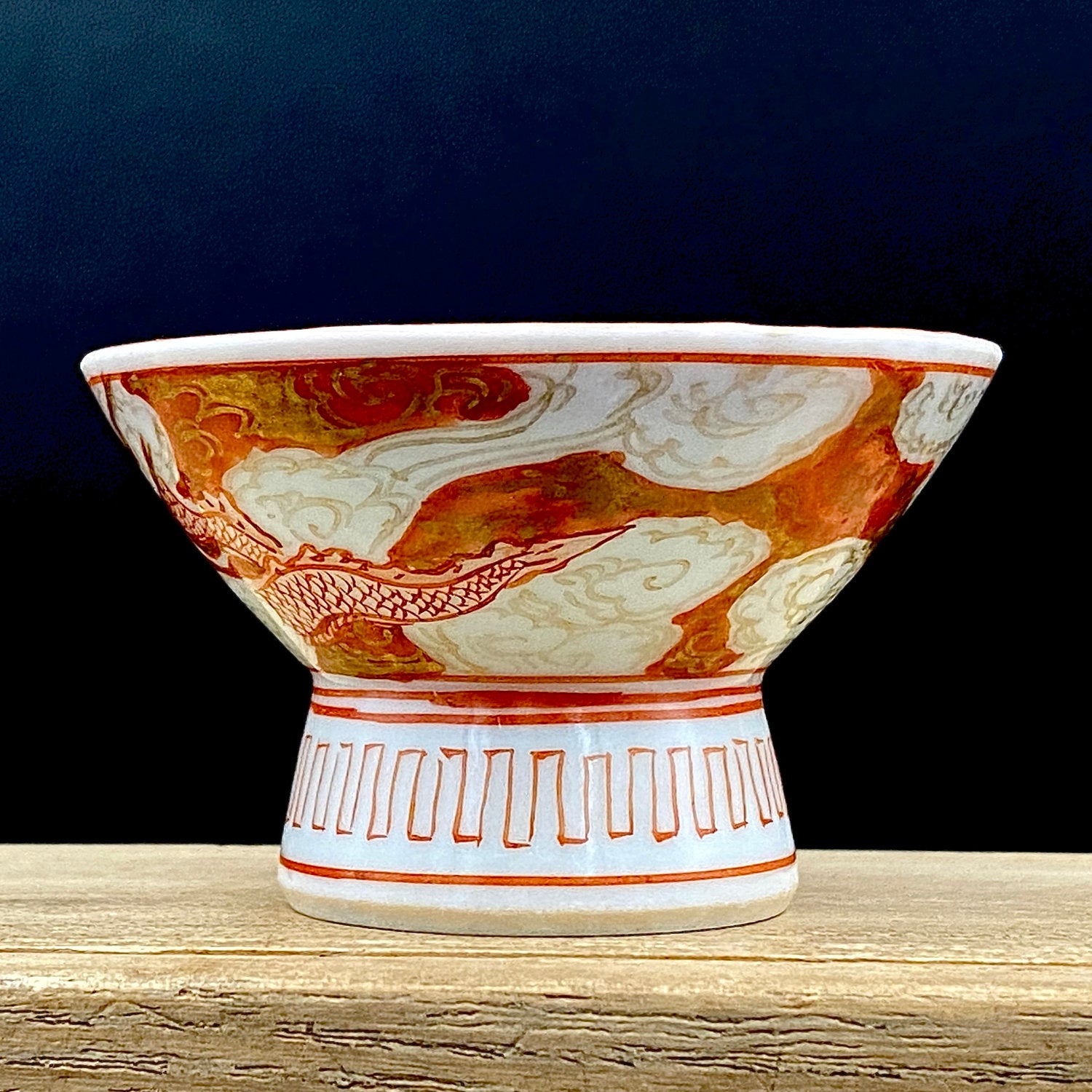 谷 秋渓 作 金彩赤絵細描 雲龍文 酒盃 二客 昭和初期制作 竹内吟秋門下の真髄 下絵なしの極細一筆書き龍模様 ジャパニーズコウゲイの至宝 #203
