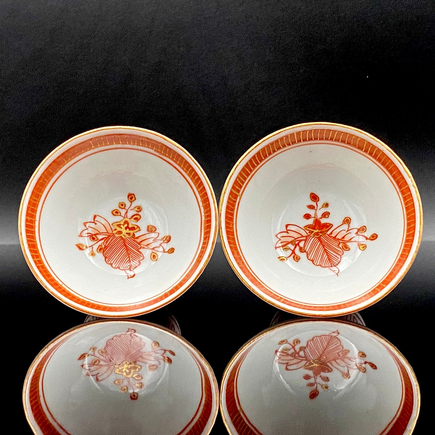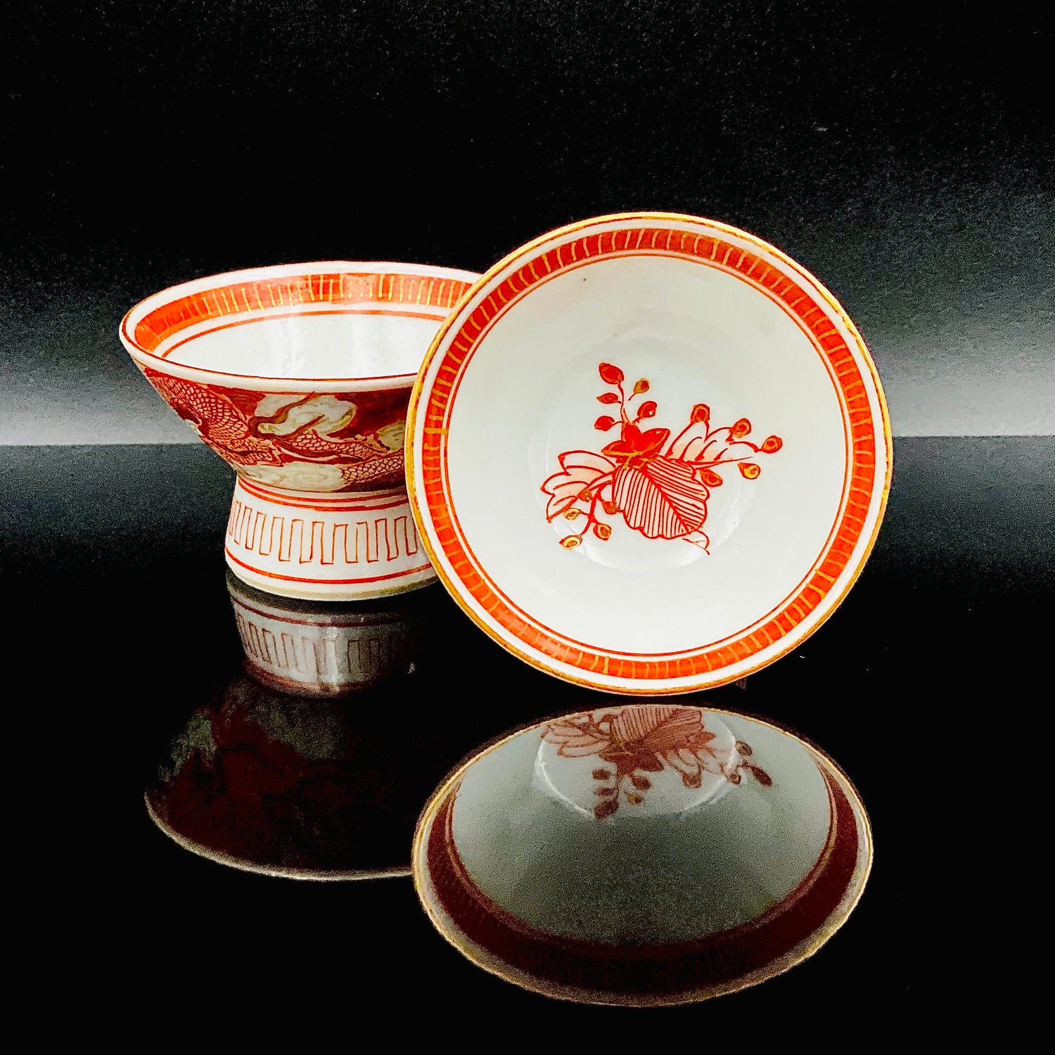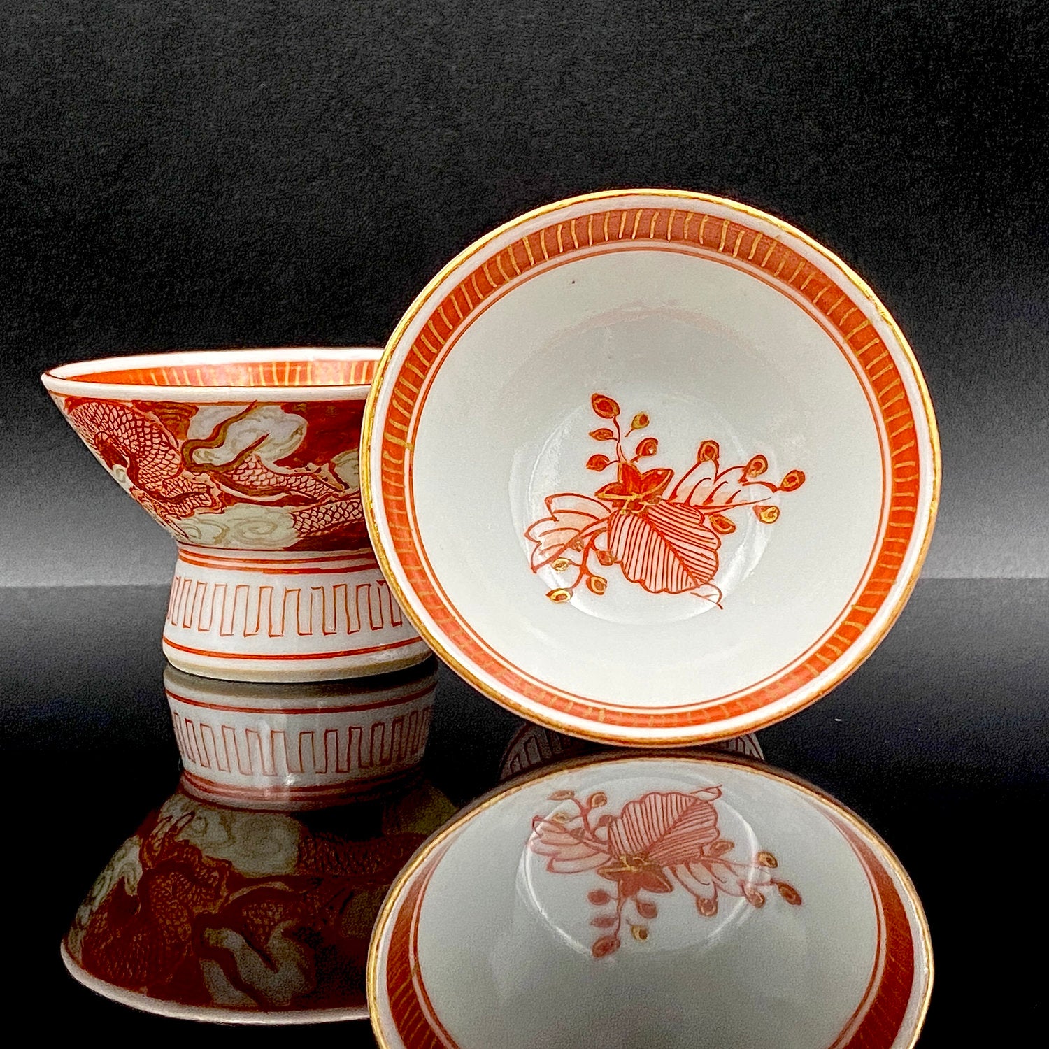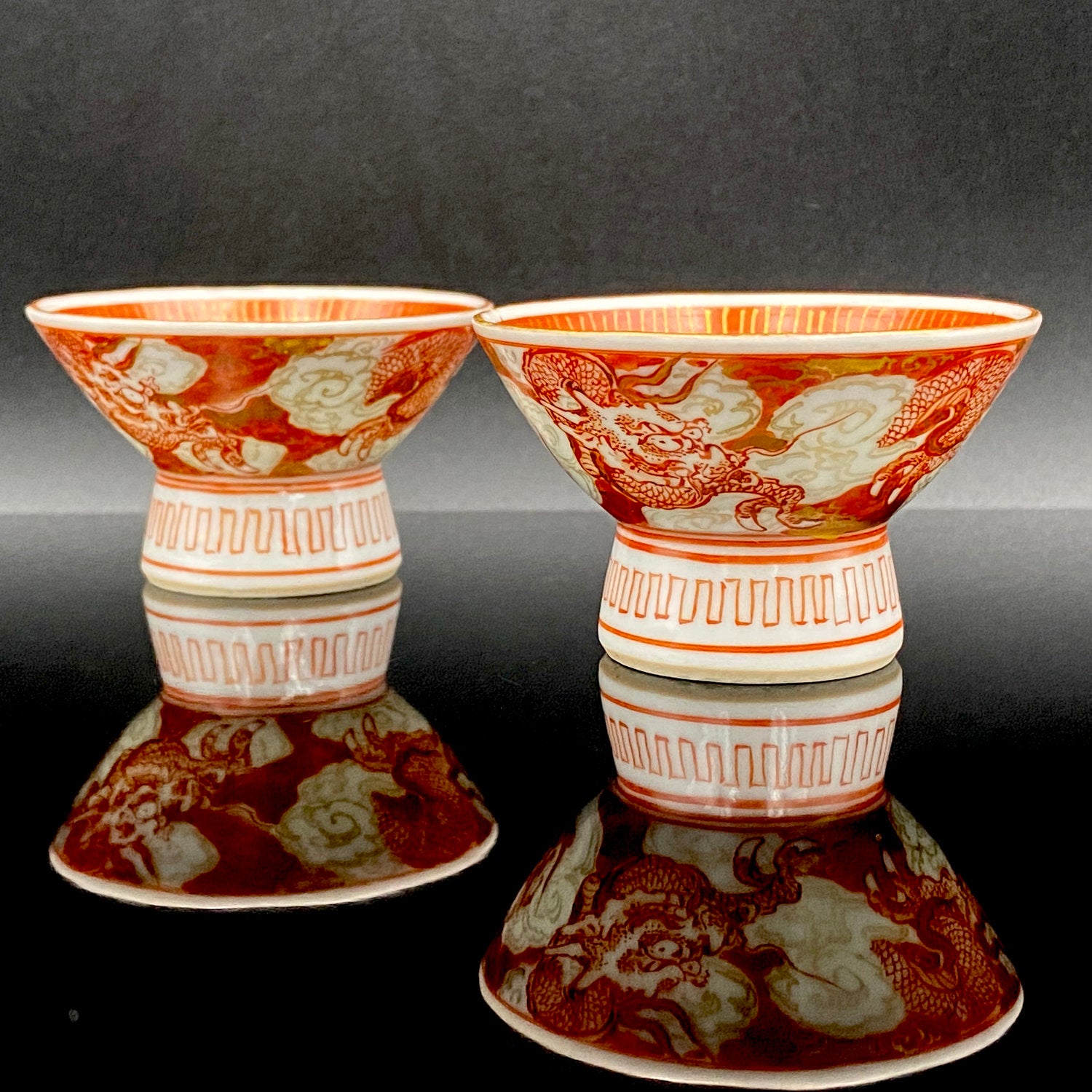 谷 秋渓 作 金彩赤絵細描 雲龍文 酒盃 二客 昭和初期制作 竹内吟秋門下の真髄 下絵なしの極細一筆書き龍模様 ジャパニーズコウゲイの至宝 #203