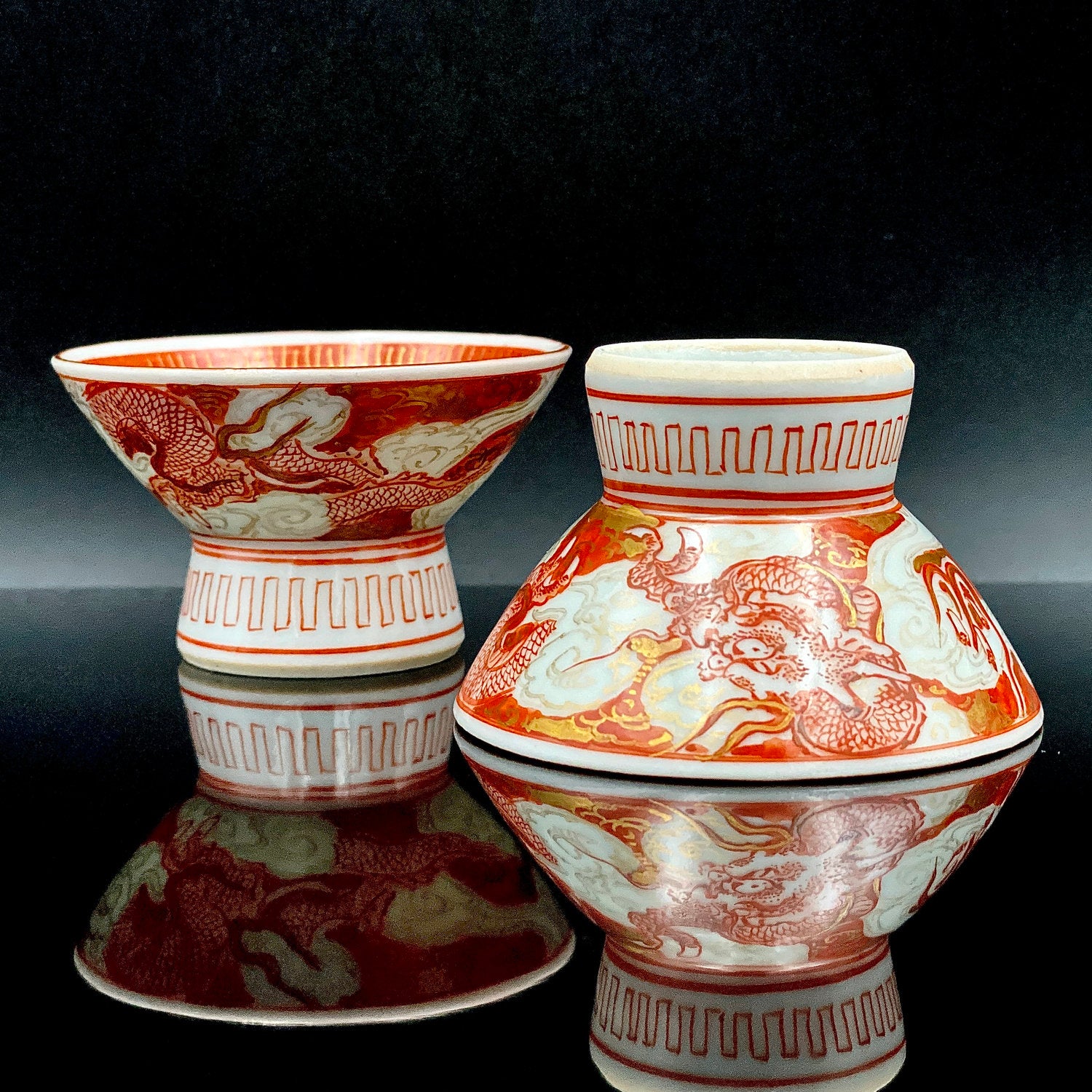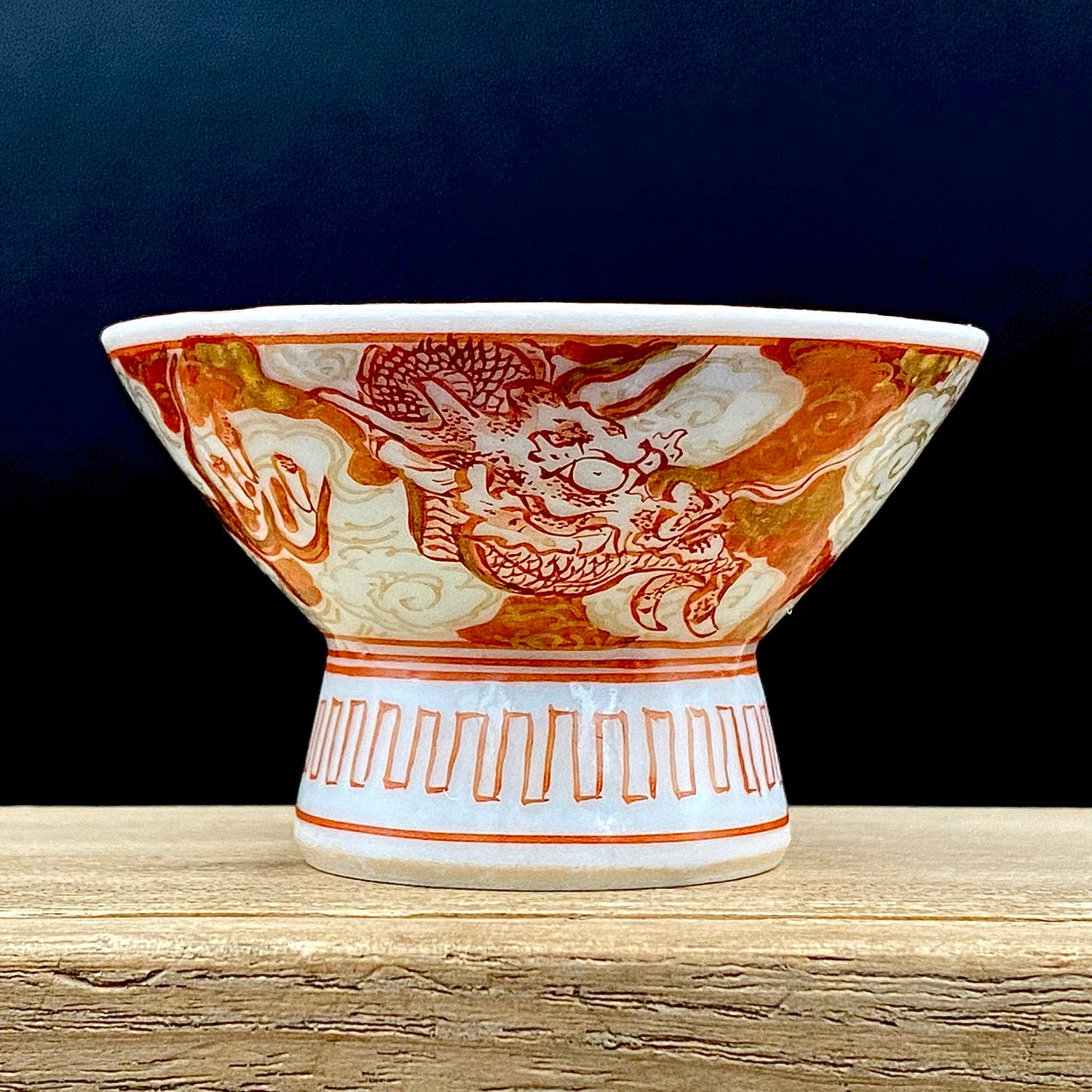 石川県加賀市大聖寺に出自を持つ谷秋渓(たに しゅうけい、1888年-1959年、本名:政記)は、明治九谷の巨匠である竹内吟秋とその三男の広沢芦秋に師事し、九谷赤絵細描の正統を継承した名工です。秋渓の最大の特徴は、下描きを一切介さずに極細の筆一本で器を埋め尽くす超人的な筆力にあり、特に龍や鳳凰の図案においては、全く同一の文様を自在に描き出すことができたと伝えられています。本作の酒盃二客には、その真骨頂である雲龍文が施されており、小ぶりな器体に螺旋を描くように配された龍の鱗や瑞雲の描写には、淀みのない流麗な筆致と、金彩を交えた気品ある色彩設計が明確に表れています。