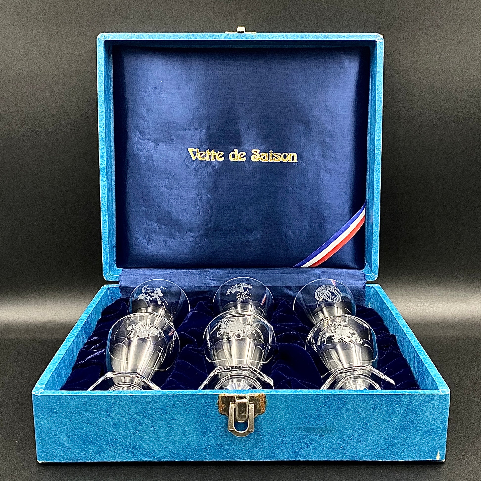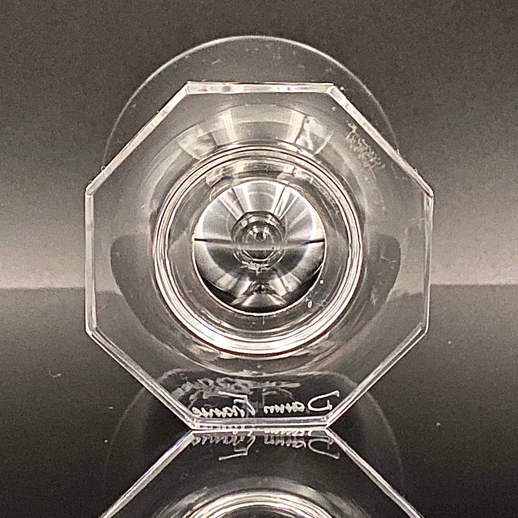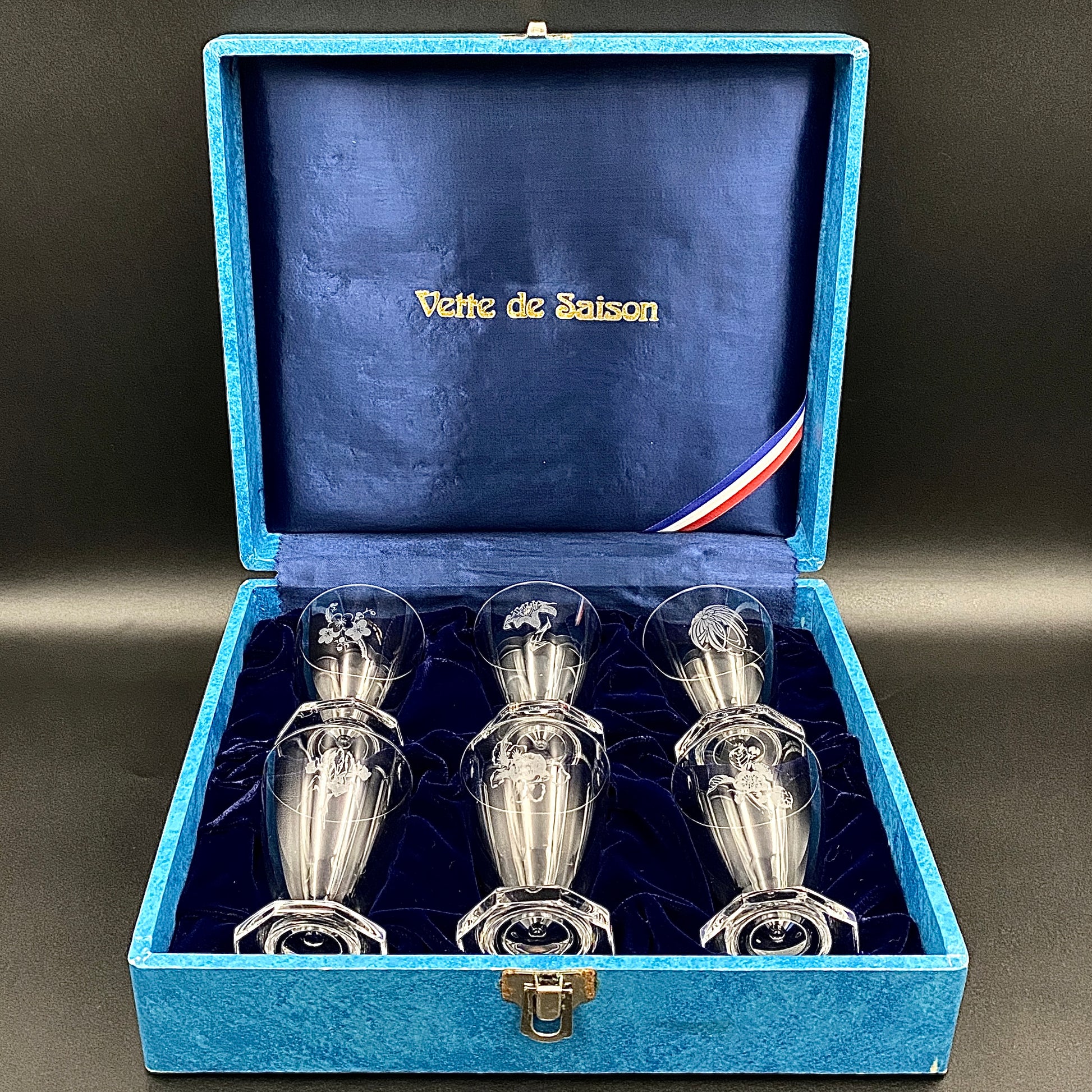 本品は、ドームクリスタルの「Vette de Saison(ヴェット・ドゥ・セゾン)」シリーズより、クリスタルグラス6点セットです。「Saison(季節)」を意味する名の通り、本コレクションは「季節の移ろい」をテーマとし、6客それぞれが異なる植物や動物、抽象的なモチーフで飾られています。グラスの形状は、安定感のある八角形(オクタゴン)にカットされた重厚な台座が特徴的です。台座から上に向かって広がる優雅な逆円錐形のボウルは、リキュールや食前酒を少量楽しむのに最適なサイズです。