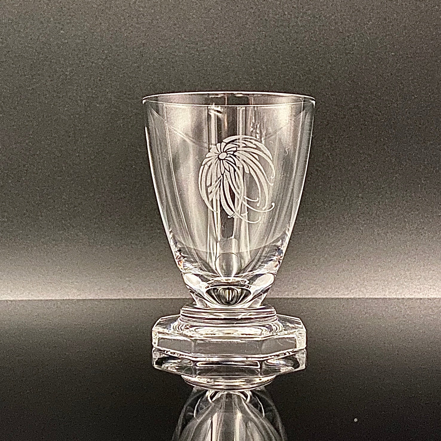 グラスの最大の魅力は、ボウル全体に施された繊細で緻密なエッチング(彫り込み)技術です。このエッチングは、光の当たり方によってモチーフが立体的に浮かび上がります。また、グラス本体の台座の裏側には、ドームクリスタルに特徴的な筆記体エッチングの「Daum France」サインが刻まれています。この精巧なクリスタルは、ウイスキーや希少な酒のアロマを、静かに、そして最大限に引き出します。ぜひこのグラスで、長年のコレクションである貴方の特別な一杯を、フランス工芸の美とともに深く味わいください。