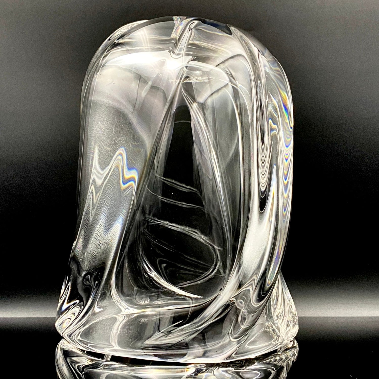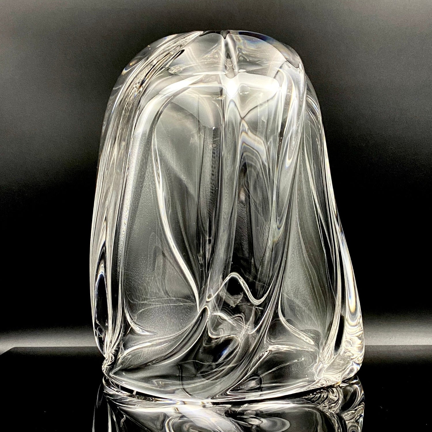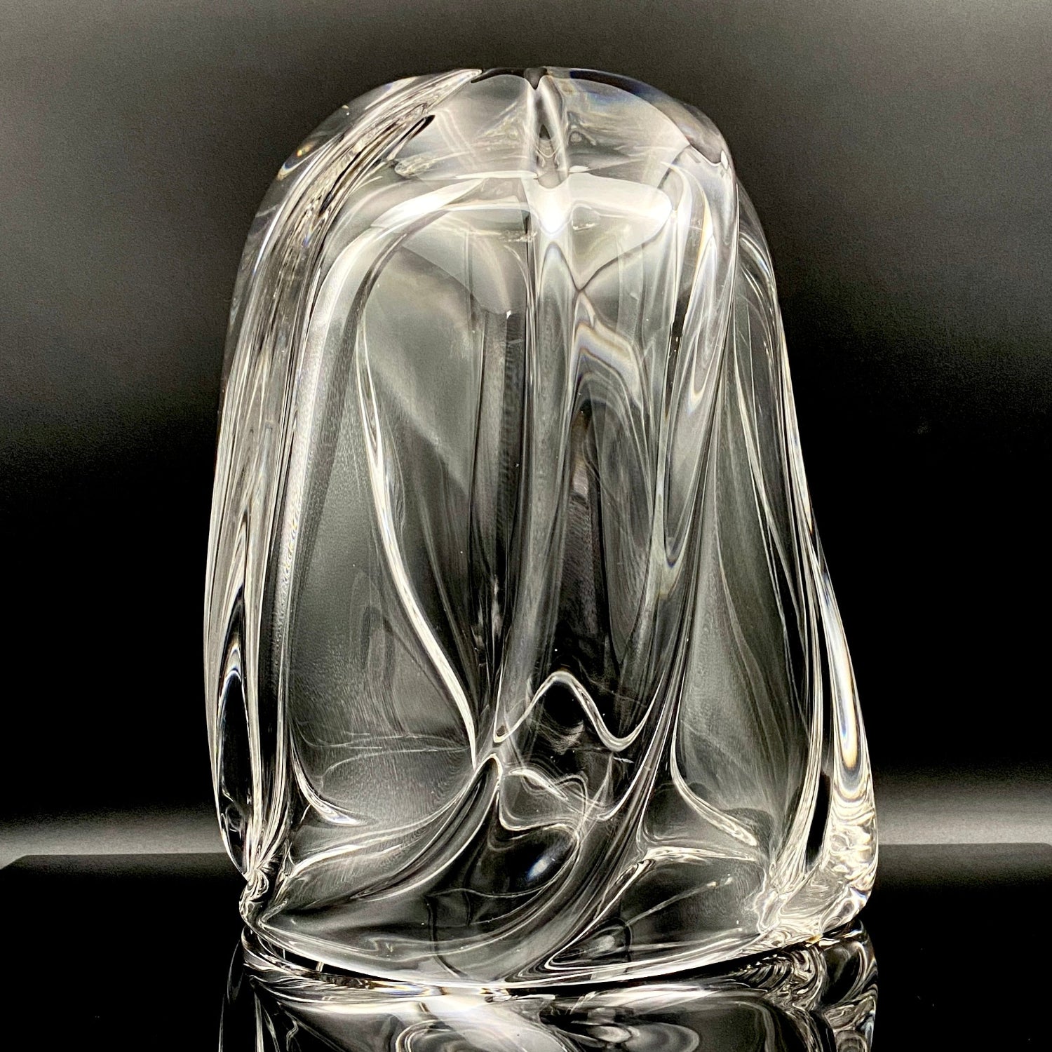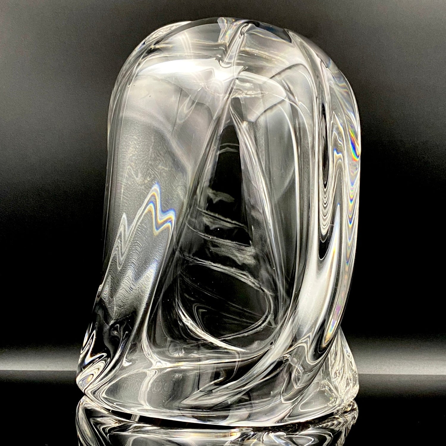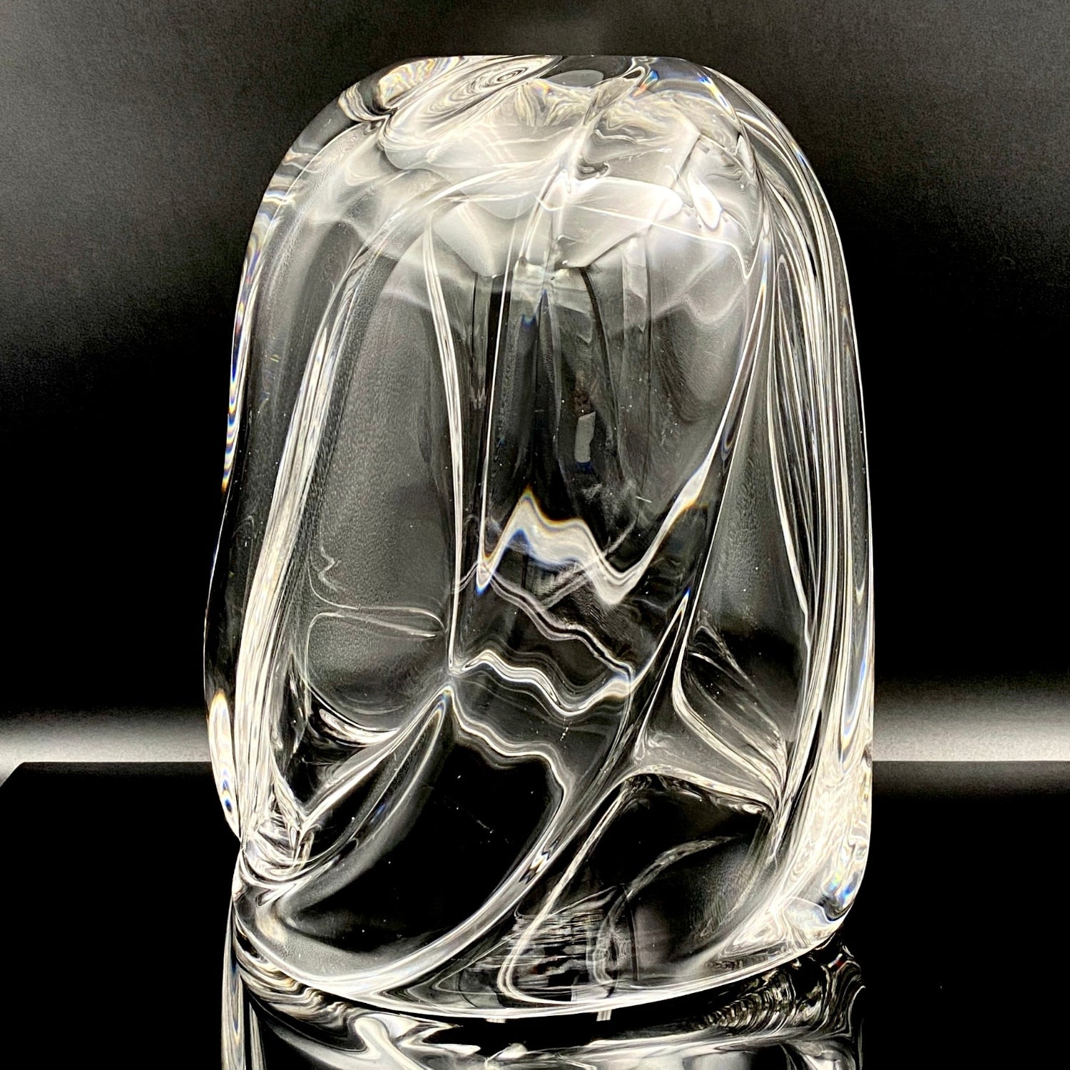 この作品の造形は、まるで勢いよく流れる渓流の水が、一瞬にして硬質なクリスタルになったかのような優美な曲面で構成されています。高さ約27cm、横幅21.5cmの堂々としたサイズでありながら、内部に気泡や不純物をあまり含まない透明度の高さを維持するには、極めて高い技術と繊細な温度管理が必要です。大型かつ純粋なクリスタルガラスの手吹き成形は、冷却過程でヒビや歪みが発生しやすく、成功品の制作難易度が非常に高いため、この作品の稀少性と価値を裏付けています。透明度の高い硝子が内部に深くカーブを描き、見る者に空間の広がりを感じさせます。花器として制作されましたが、内部に大きな氷の塊を入れることで、氷とガラスが一体化したような幻想的なアイスボウルとしてお愉しみいただくことを提案いたします。その優美な流れの中に光と影を映し込み、見れば見るほど吸い込まれるような魅力にあふれる作品です。