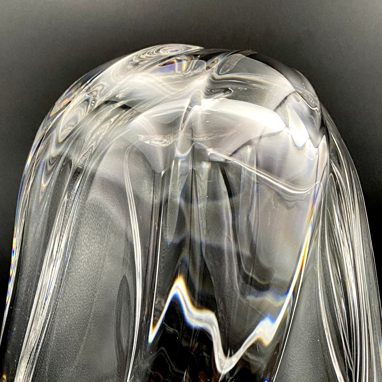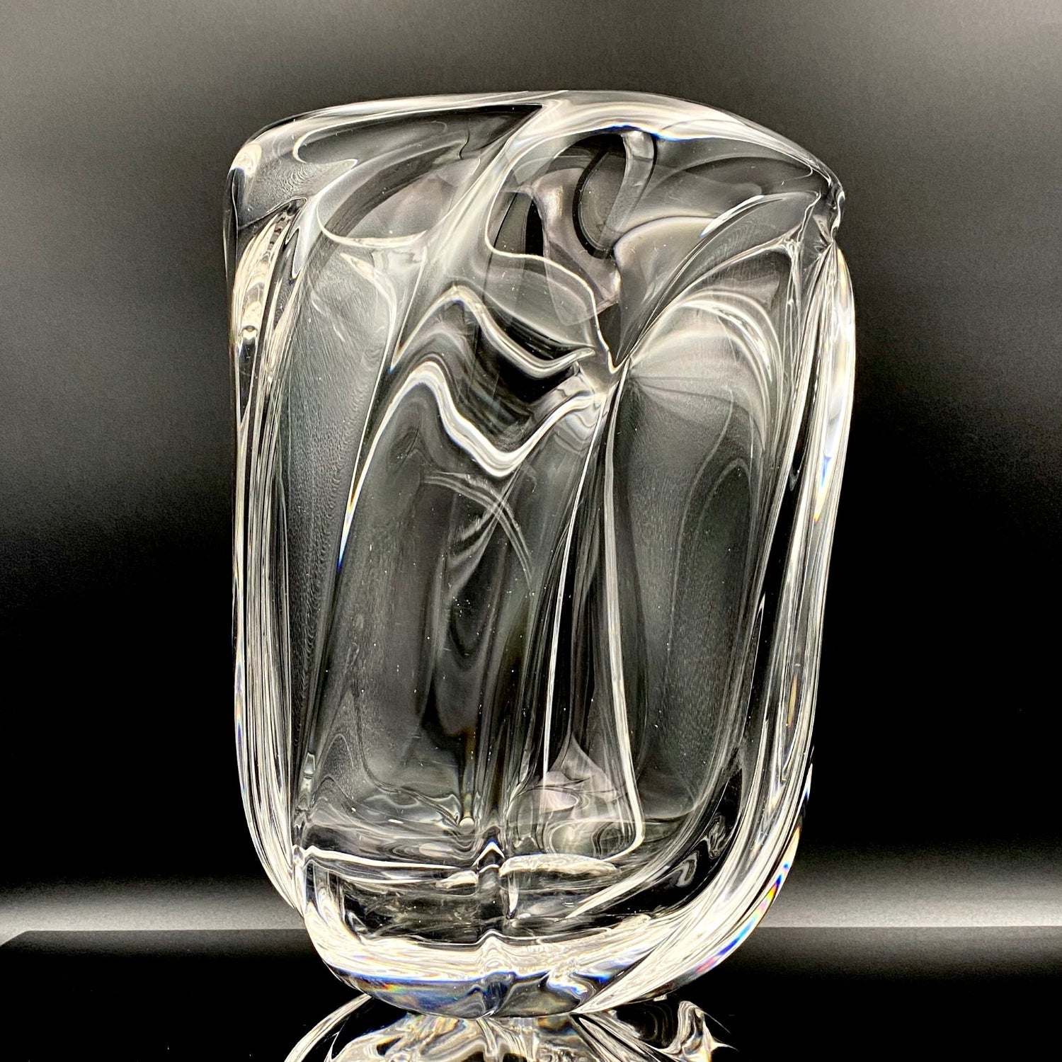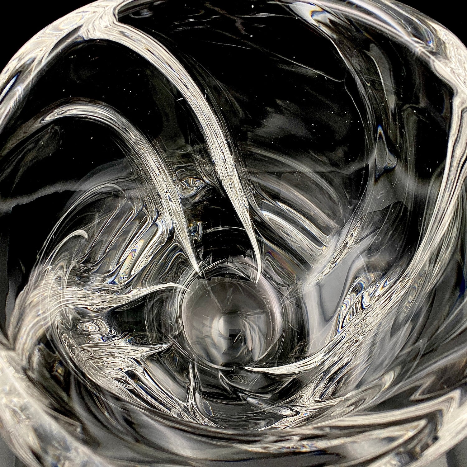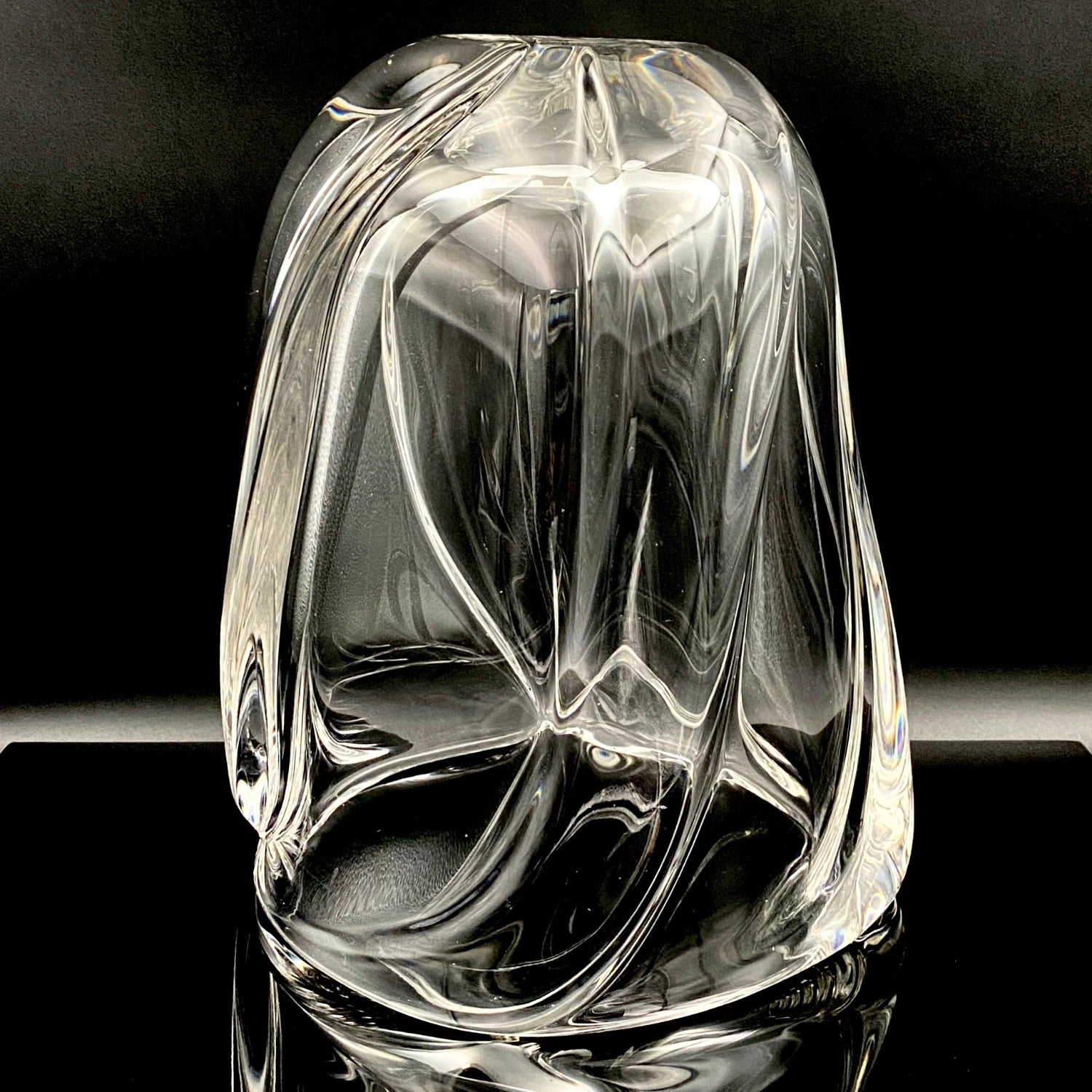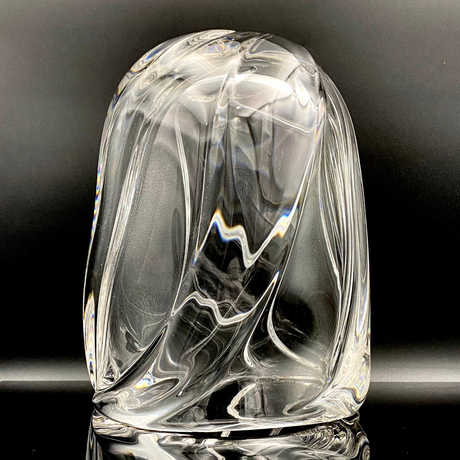 この作品の造形は、まるで勢いよく流れる渓流の水が、一瞬にして硬質なクリスタルになったかのような優美な曲面で構成されています。高さ約27cm、横幅21.5cmの堂々としたサイズでありながら、内部に気泡や不純物をあまり含まない透明度の高さを維持するには、極めて高い技術と繊細な温度管理が必要です。大型かつ純粋なクリスタルガラスの手吹き成形は、冷却過程でヒビや歪みが発生しやすく、成功品の制作難易度が非常に高いため、この作品の稀少性と価値を裏付けています。透明度の高い硝子が内部に深くカーブを描き、見る者に空間の広がりを感じさせます。花器として制作されましたが、内部に大きな氷の塊を入れることで、氷とガラスが一体化したような幻想的なアイスボウルとしてお愉しみいただくことを提案いたします。その優美な流れの中に光と影を映し込み、見れば見るほど吸い込まれるような魅力にあふれる作品です。