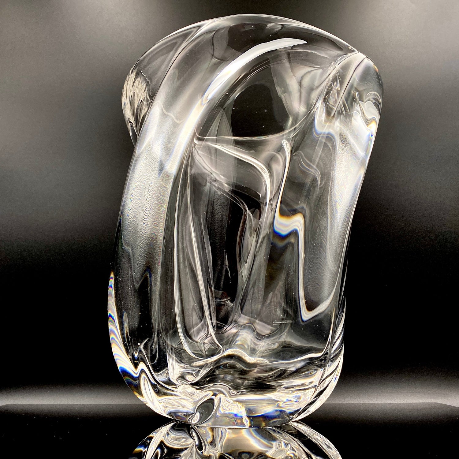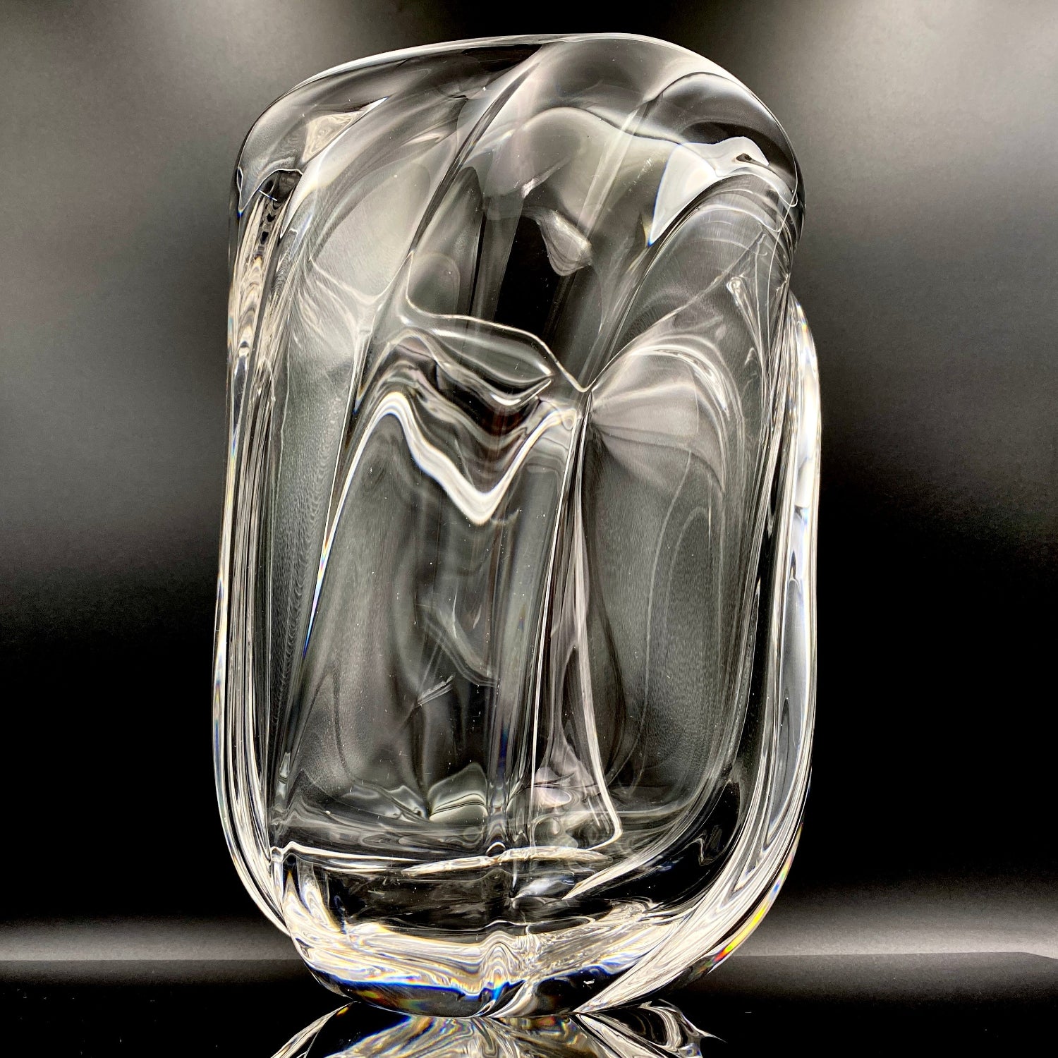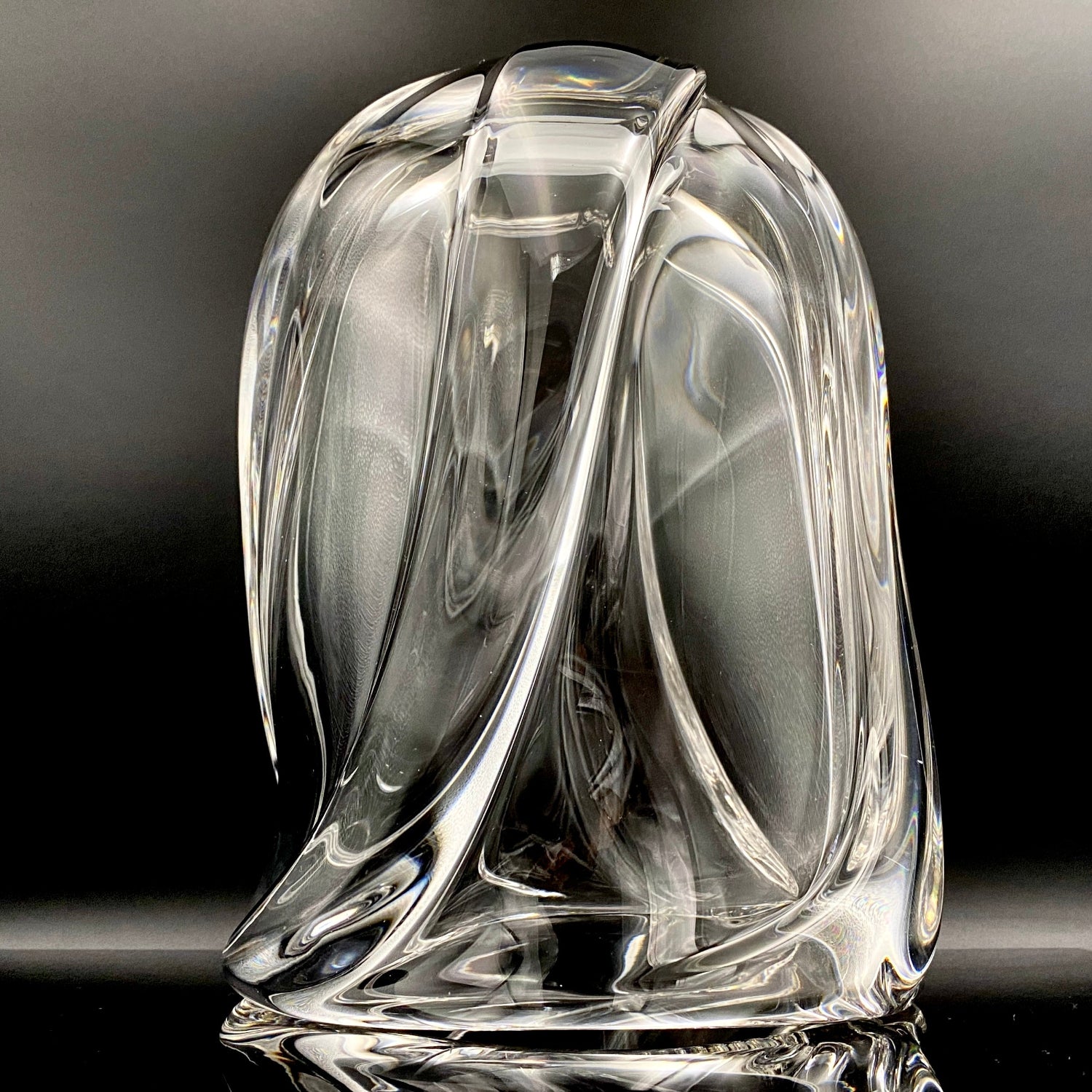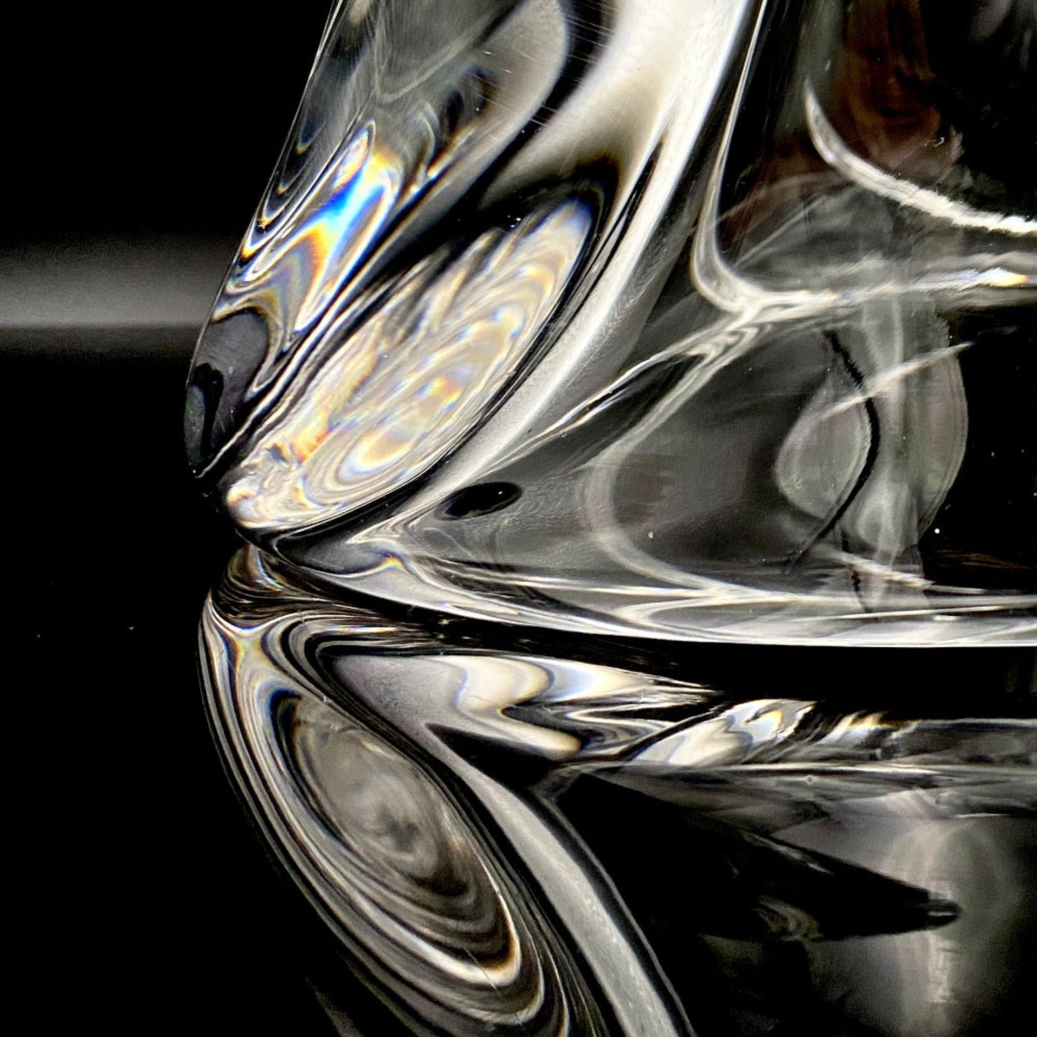 この作品の造形は、まるで勢いよく流れる渓流の水が、一瞬にして硬質なクリスタルになったかのような優美な曲面で構成されています。高さ約27cm、横幅21.5cmの堂々としたサイズでありながら、内部に気泡や不純物をあまり含まない透明度の高さを維持するには、極めて高い技術と繊細な温度管理が必要です。大型かつ純粋なクリスタルガラスの手吹き成形は、冷却過程でヒビや歪みが発生しやすく、成功品の制作難易度が非常に高いため、この作品の稀少性と価値を裏付けています。透明度の高い硝子が内部に深くカーブを描き、見る者に空間の広がりを感じさせます。花器として制作されましたが、内部に大きな氷の塊を入れることで、氷とガラスが一体化したような幻想的なアイスボウルとしてお愉しみいただくことを提案いたします。その優美な流れの中に光と影を映し込み、見れば見るほど吸い込まれるような魅力にあふれる作品です。