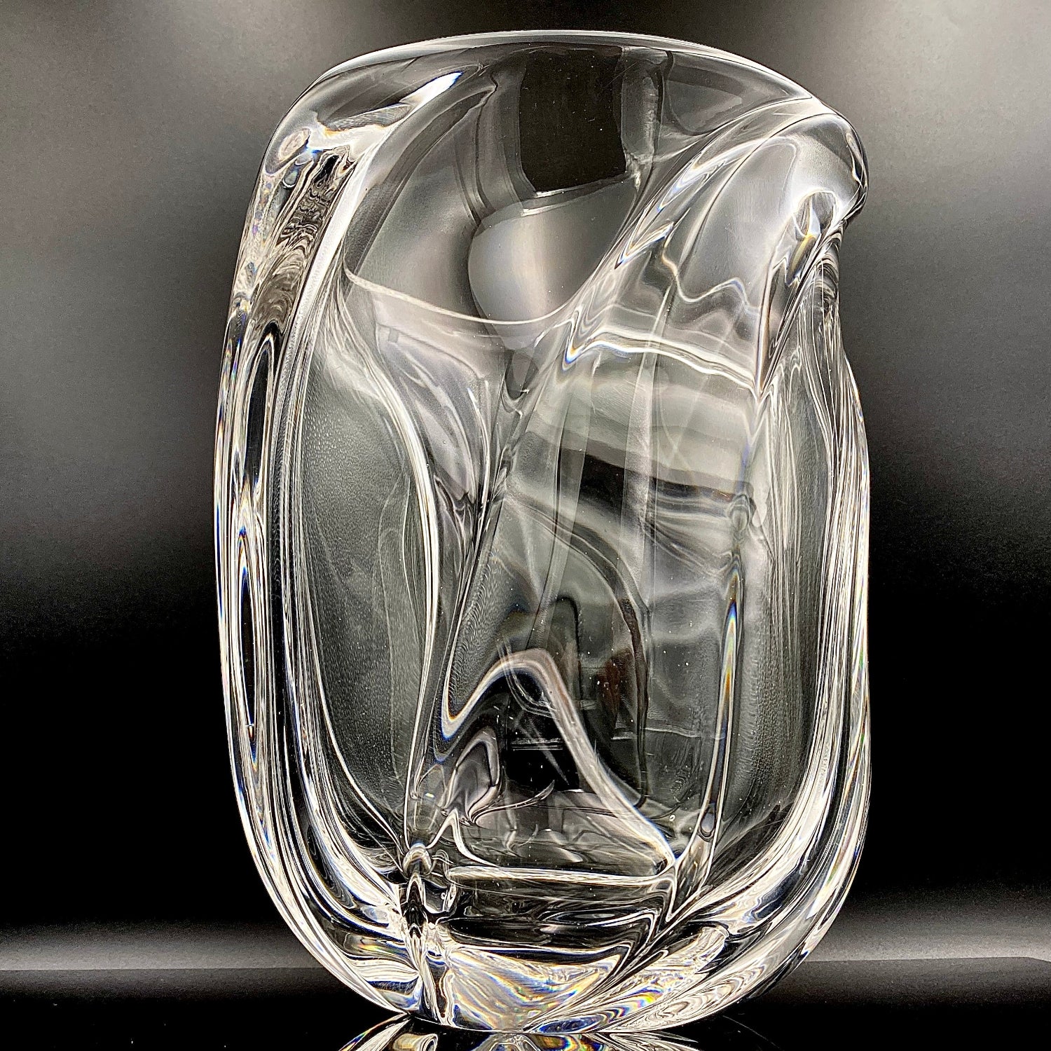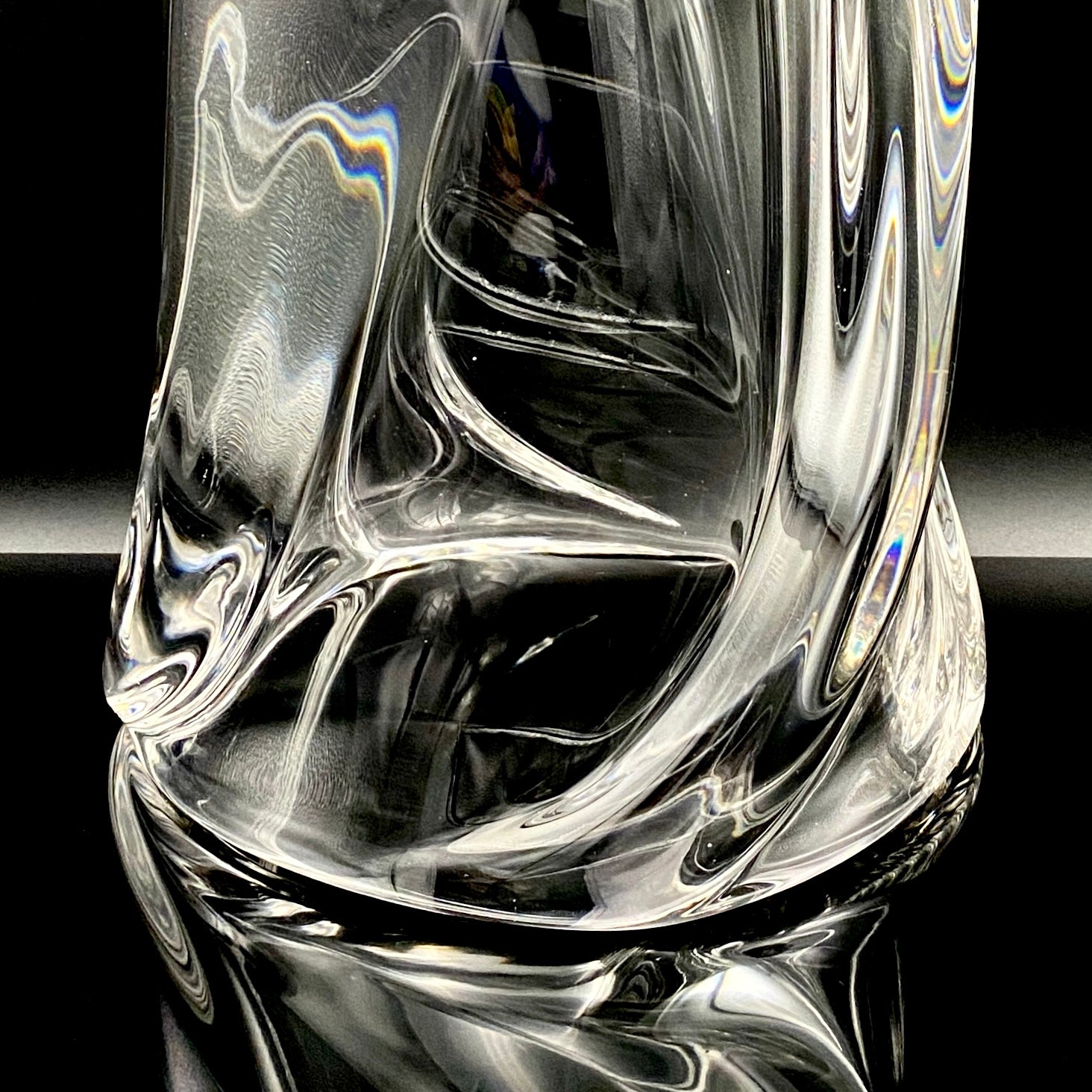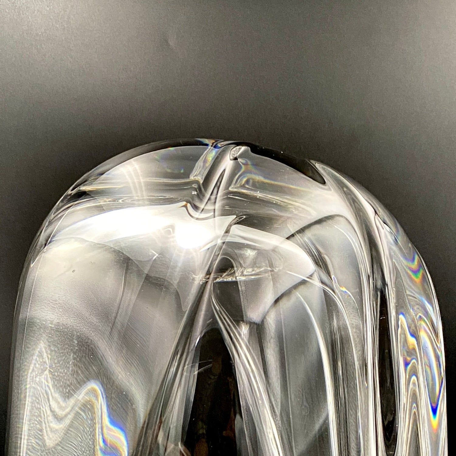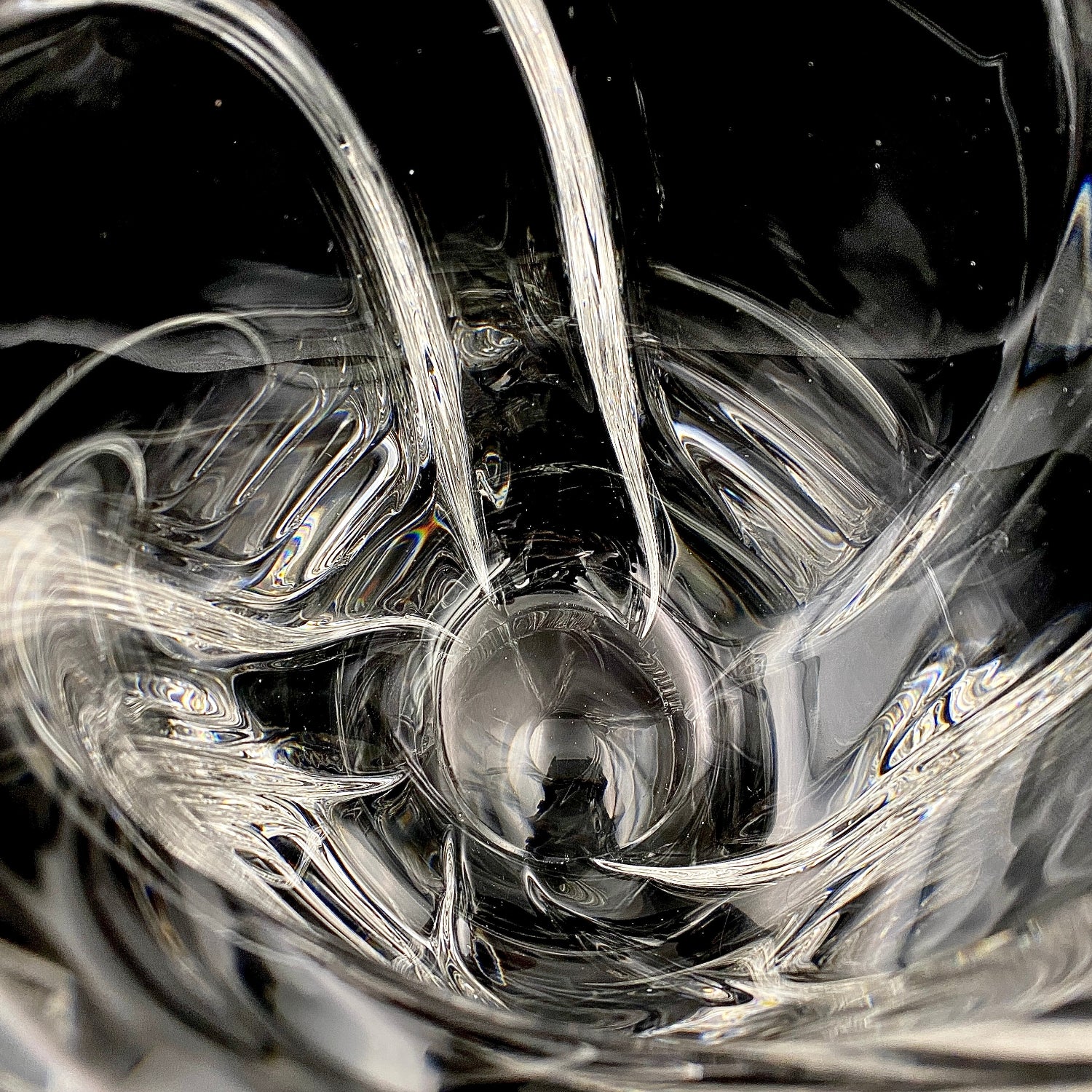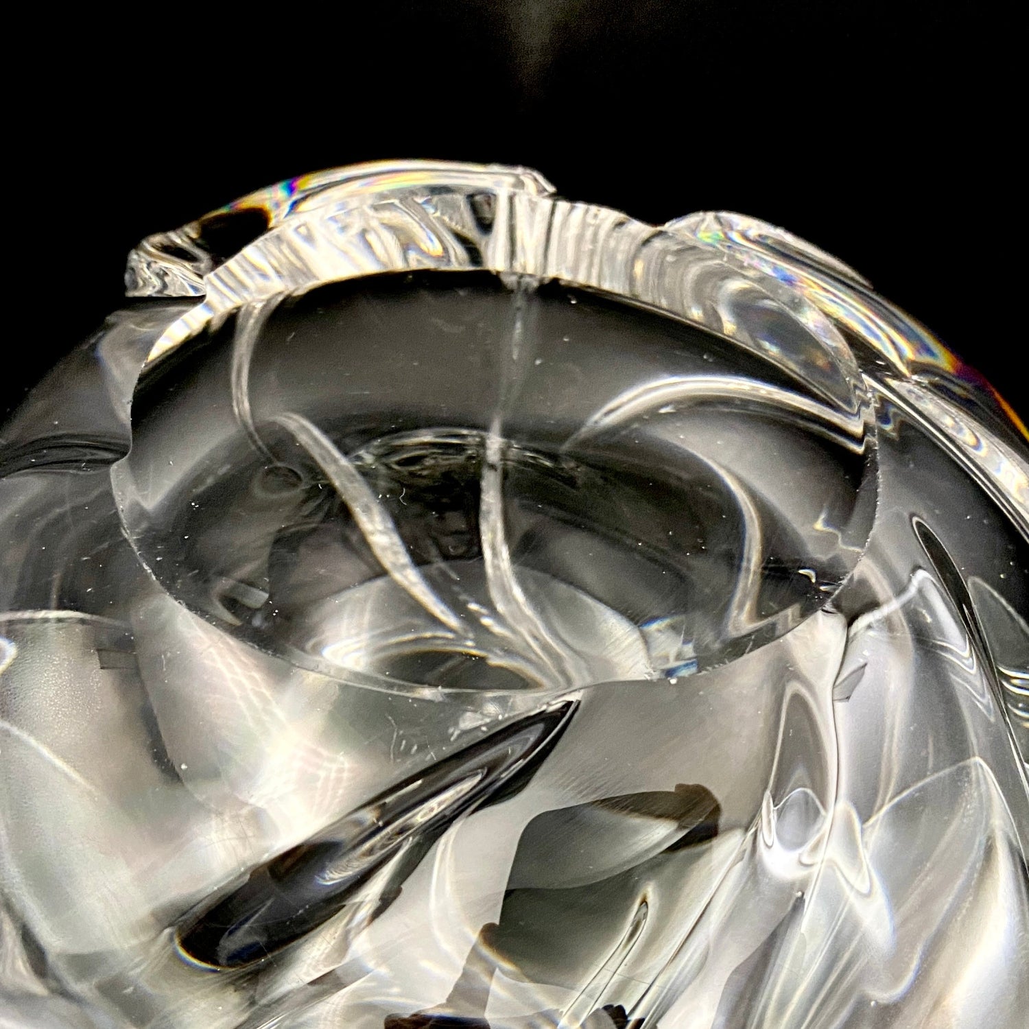 この作品の造形は、まるで勢いよく流れる渓流の水が、一瞬にして硬質なクリスタルになったかのような優美な曲面で構成されています。高さ約27cm、横幅21.5cmの堂々としたサイズでありながら、内部に気泡や不純物をあまり含まない透明度の高さを維持するには、極めて高い技術と繊細な温度管理が必要です。大型かつ純粋なクリスタルガラスの手吹き成形は、冷却過程でヒビや歪みが発生しやすく、成功品の制作難易度が非常に高いため、この作品の稀少性と価値を裏付けています。透明度の高い硝子が内部に深くカーブを描き、見る者に空間の広がりを感じさせます。花器として制作されましたが、内部に大きな氷の塊を入れることで、氷とガラスが一体化したような幻想的なアイスボウルとしてお愉しみいただくことを提案いたします。その優美な流れの中に光と影を映し込み、見れば見るほど吸い込まれるような魅力にあふれる作品です。