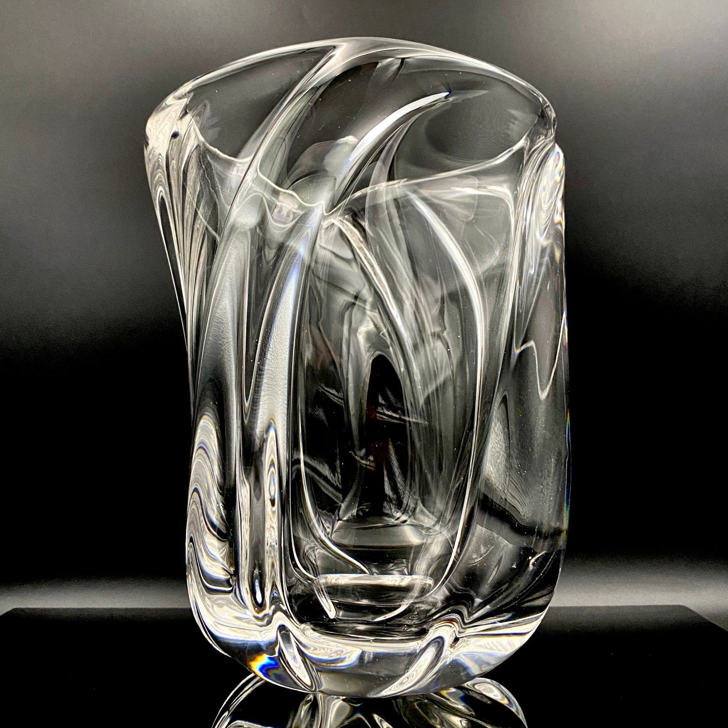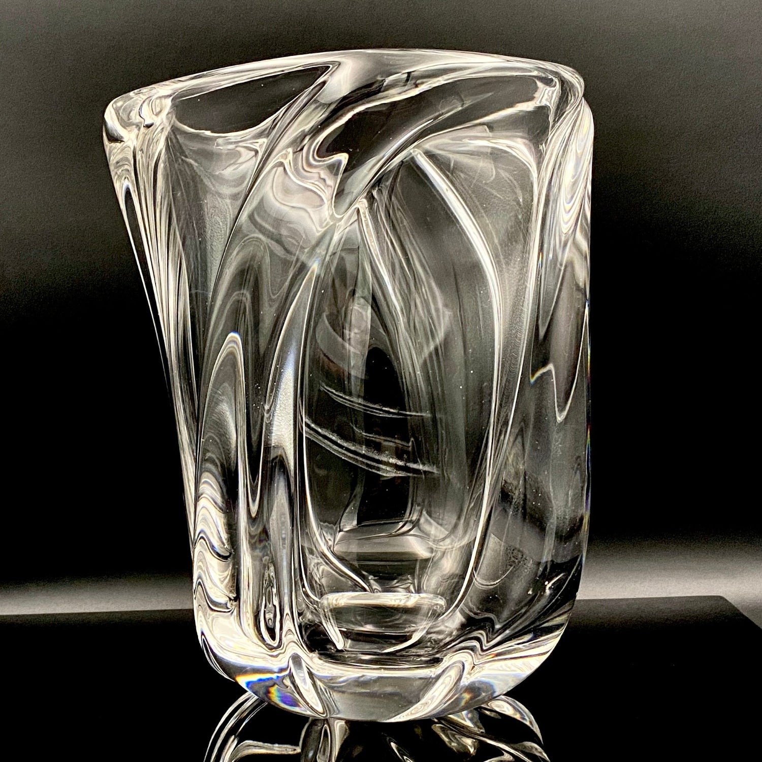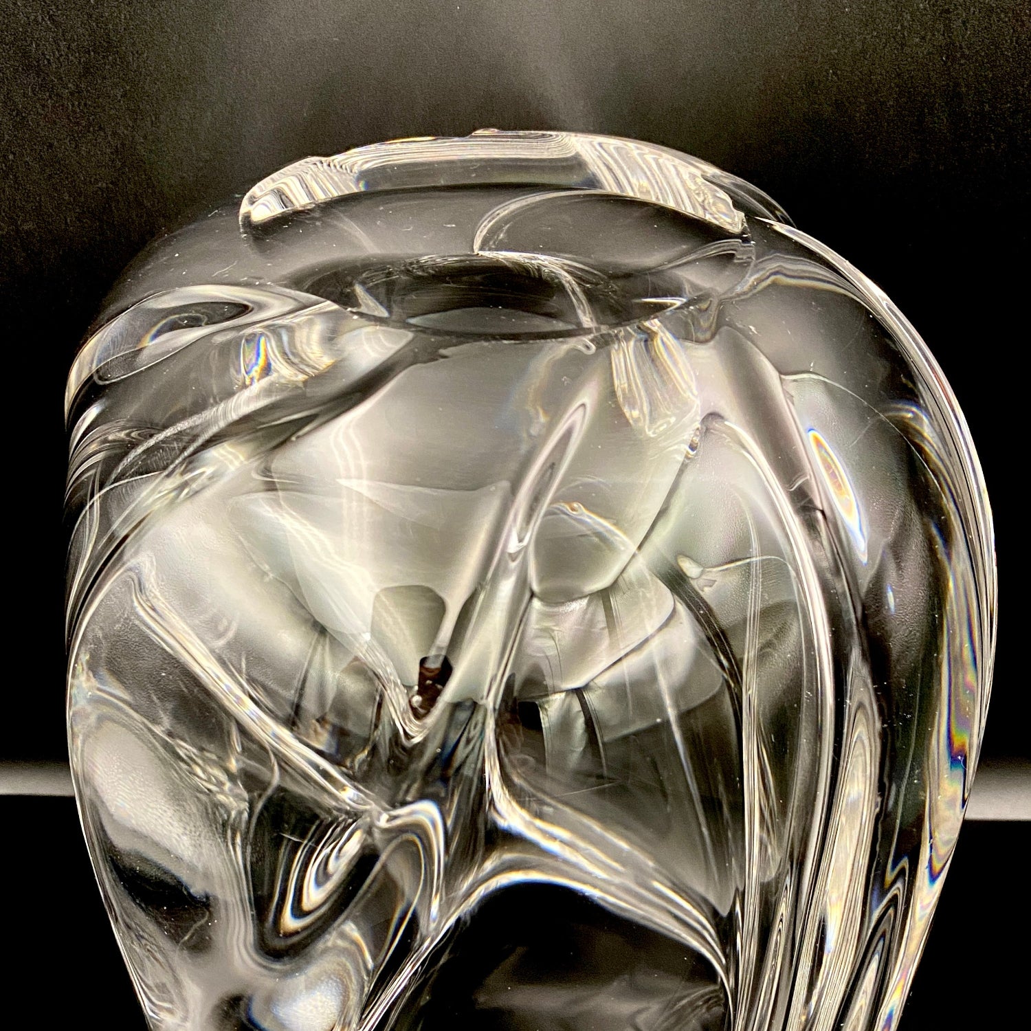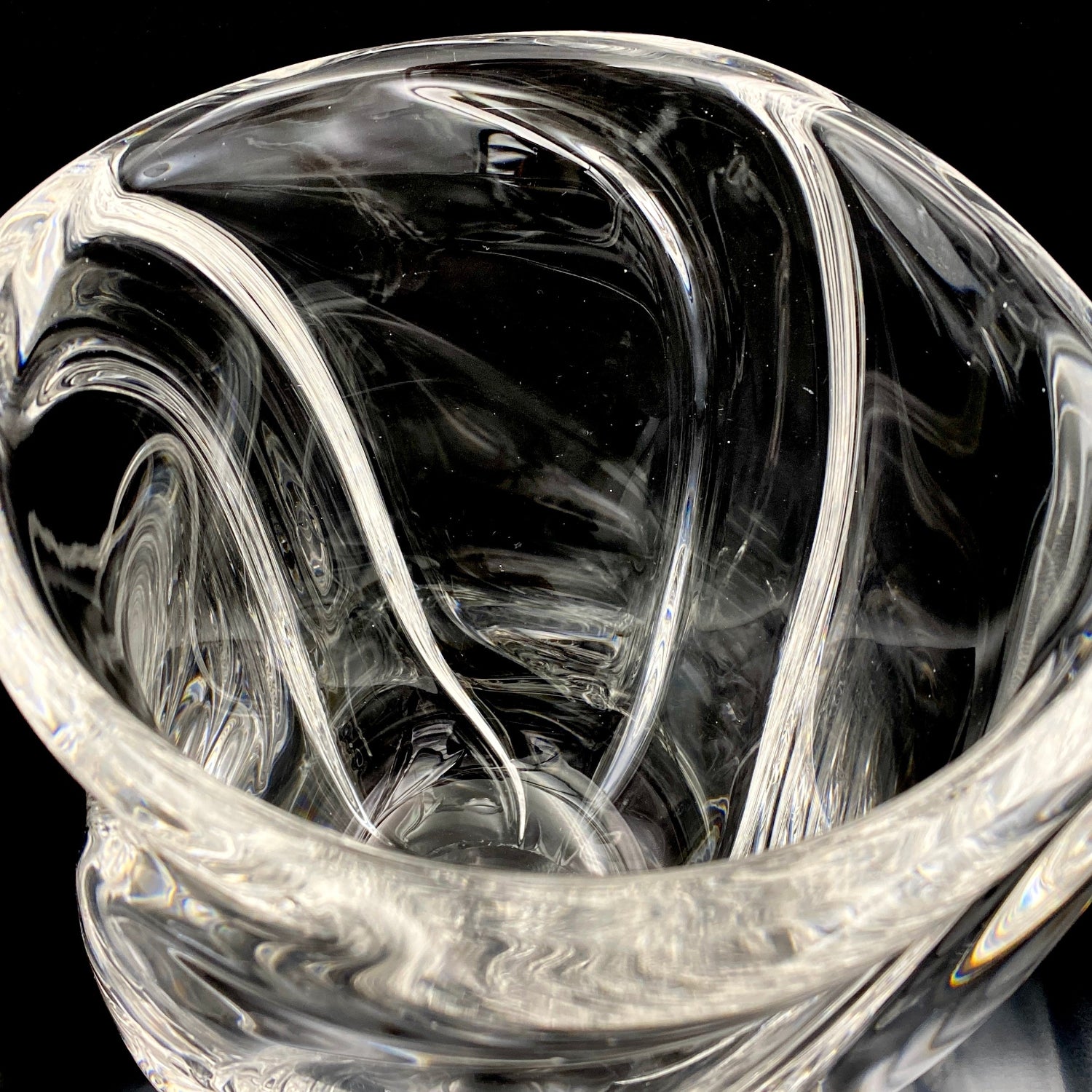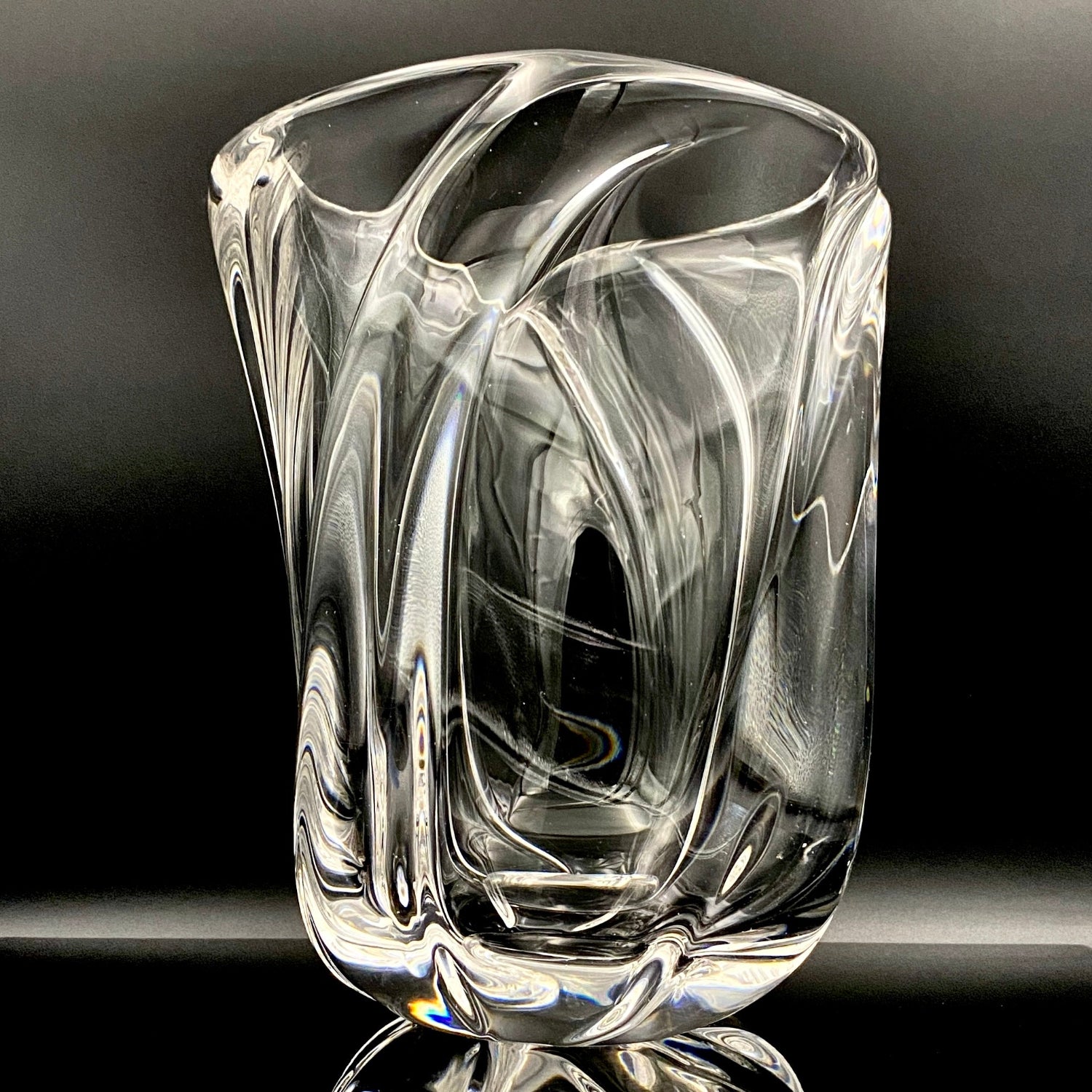 この作品の造形は、まるで勢いよく流れる渓流の水が、一瞬にして硬質なクリスタルになったかのような優美な曲面で構成されています。高さ約27cm、横幅21.5cmの堂々としたサイズでありながら、内部に気泡や不純物をあまり含まない透明度の高さを維持するには、極めて高い技術と繊細な温度管理が必要です。大型かつ純粋なクリスタルガラスの手吹き成形は、冷却過程でヒビや歪みが発生しやすく、成功品の制作難易度が非常に高いため、この作品の稀少性と価値を裏付けています。透明度の高い硝子が内部に深くカーブを描き、見る者に空間の広がりを感じさせます。花器として制作されましたが、内部に大きな氷の塊を入れることで、氷とガラスが一体化したような幻想的なアイスボウルとしてお愉しみいただくことを提案いたします。その優美な流れの中に光と影を映し込み、見れば見るほど吸い込まれるような魅力にあふれる作品です。