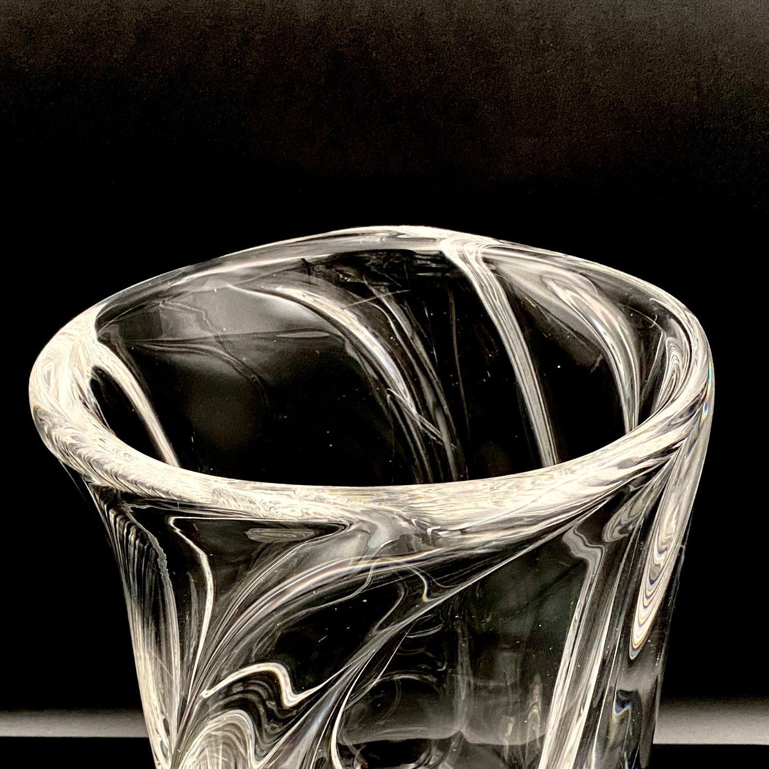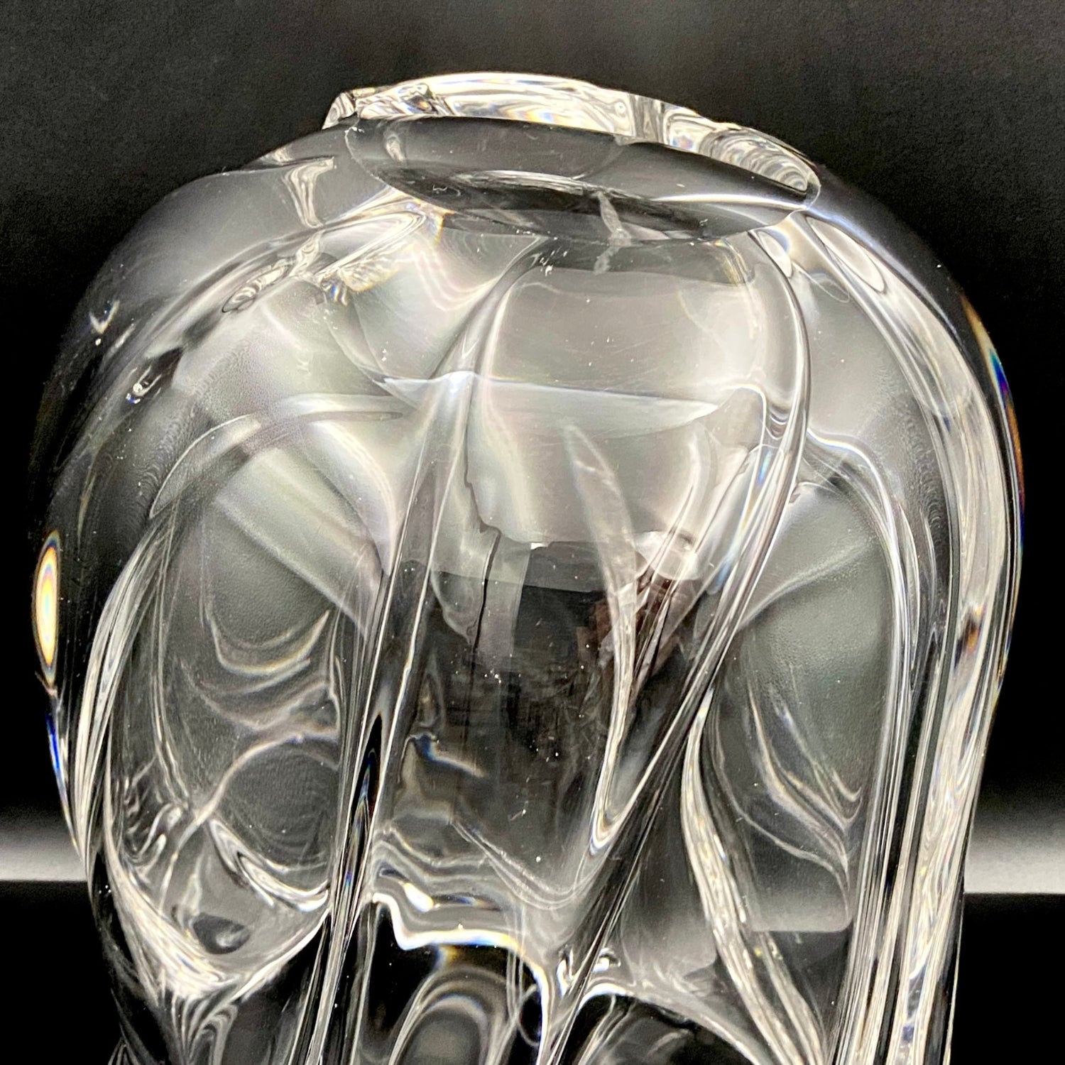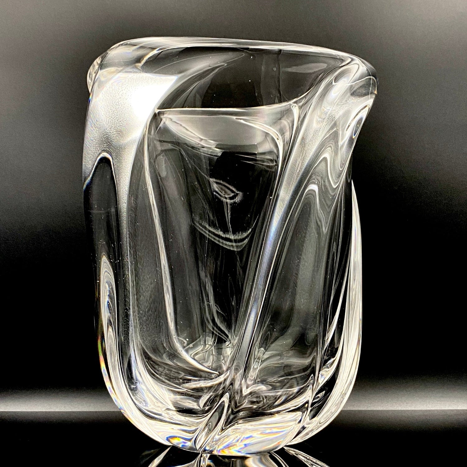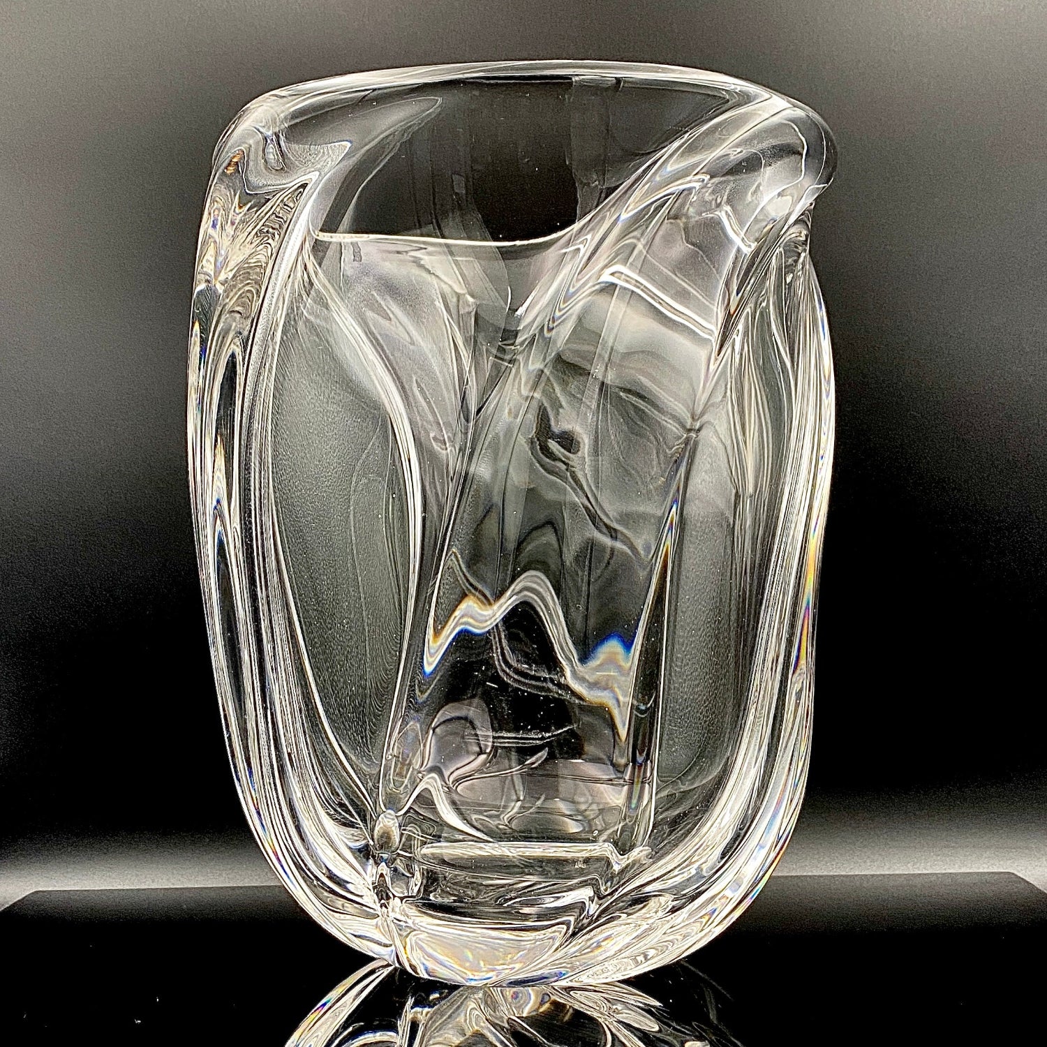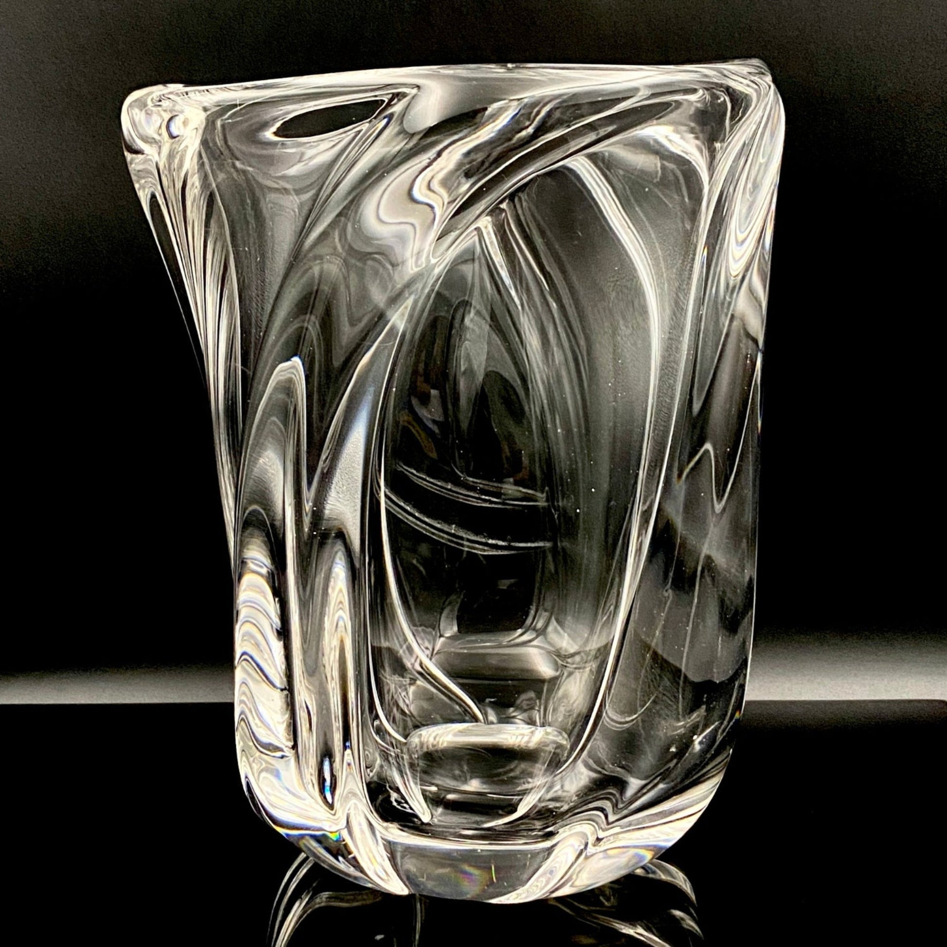 この作品の造形は、まるで勢いよく流れる渓流の水が、一瞬にして硬質なクリスタルになったかのような優美な曲面で構成されています。高さ約27cm、横幅21.5cmの堂々としたサイズでありながら、内部に気泡や不純物をあまり含まない透明度の高さを維持するには、極めて高い技術と繊細な温度管理が必要です。大型かつ純粋なクリスタルガラスの手吹き成形は、冷却過程でヒビや歪みが発生しやすく、成功品の制作難易度が非常に高いため、この作品の稀少性と価値を裏付けています。透明度の高い硝子が内部に深くカーブを描き、見る者に空間の広がりを感じさせます。花器として制作されましたが、内部に大きな氷の塊を入れることで、氷とガラスが一体化したような幻想的なアイスボウルとしてお愉しみいただくことを提案いたします。その優美な流れの中に光と影を映し込み、見れば見るほど吸い込まれるような魅力にあふれる作品です。