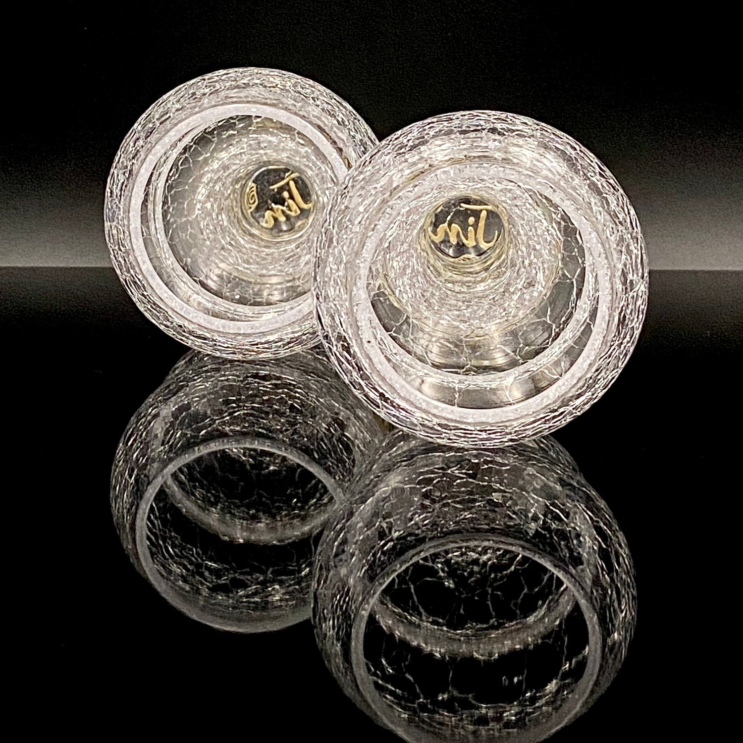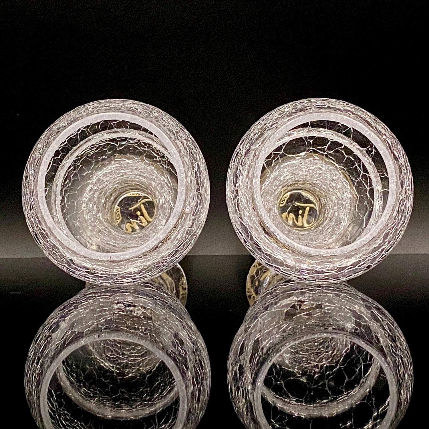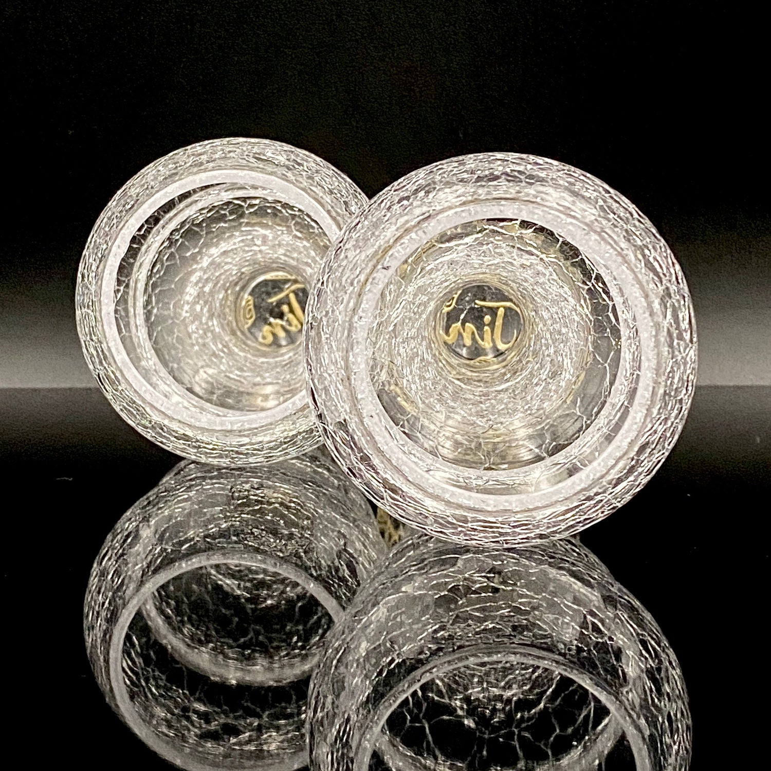 グラス本体には、硝子の表面を緻密にヒビ割れさせたクラックル(ひび割れ)技法が、全体に施されています。この技法によって、光が当たると氷のように細かく砕けた面が不規則に反射し、作品全体に幻想的な輝きと涼しげな質感を与えています。