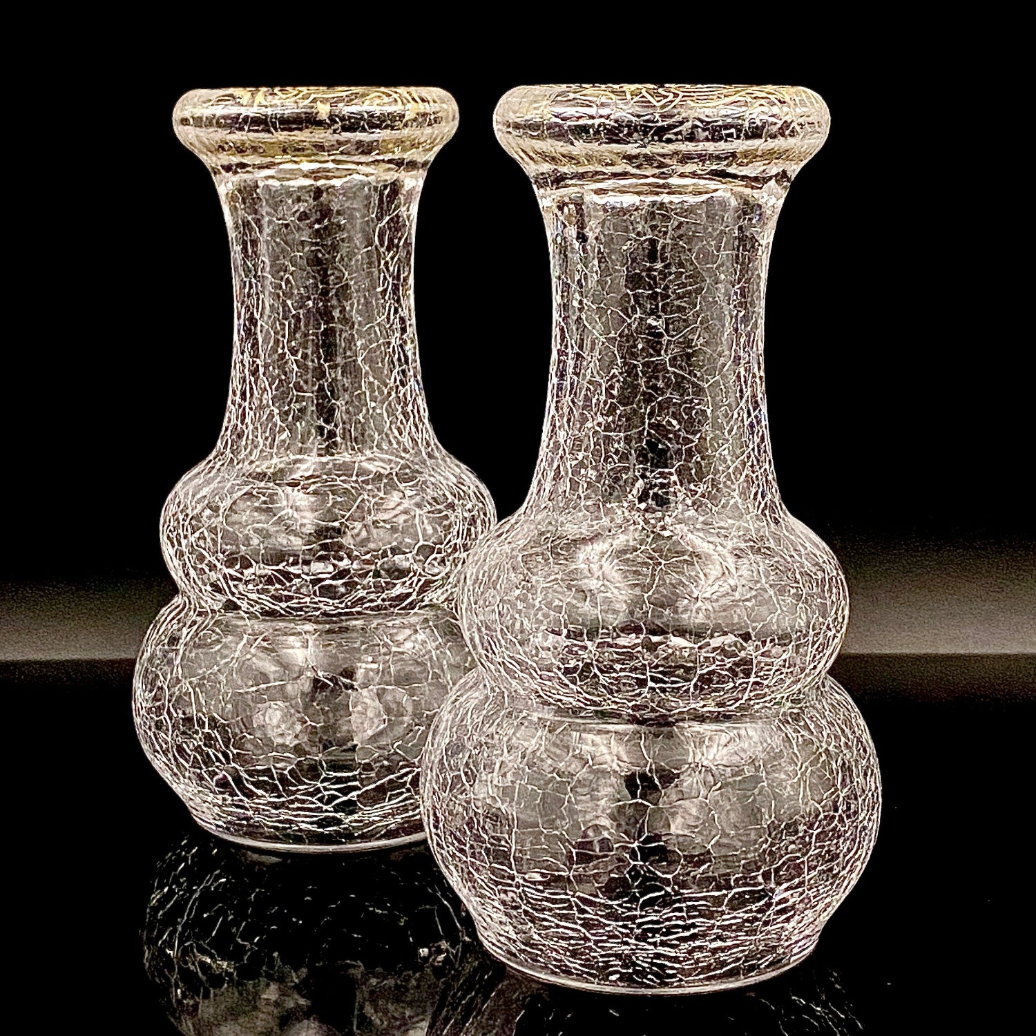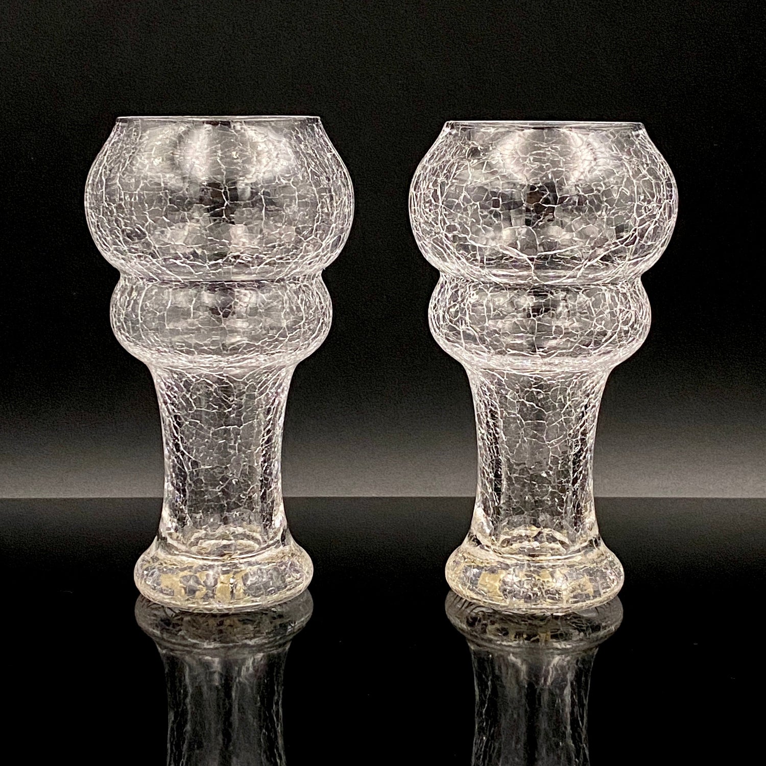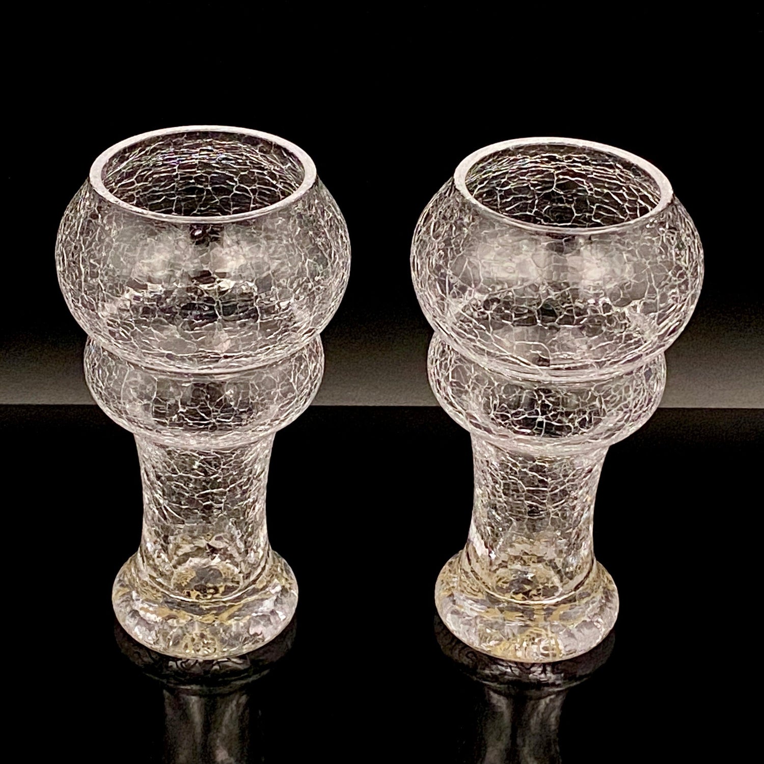 グラス本体には、硝子の表面を緻密にヒビ割れさせたクラックル(ひび割れ)技法が、全体に施されています。この技法によって、光が当たると氷のように細かく砕けた面が不規則に反射し、作品全体に幻想的な輝きと涼しげな質感を与えています。