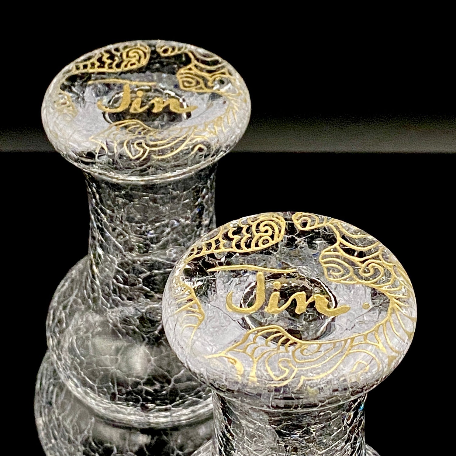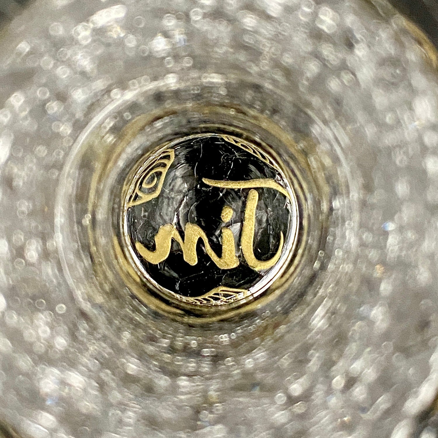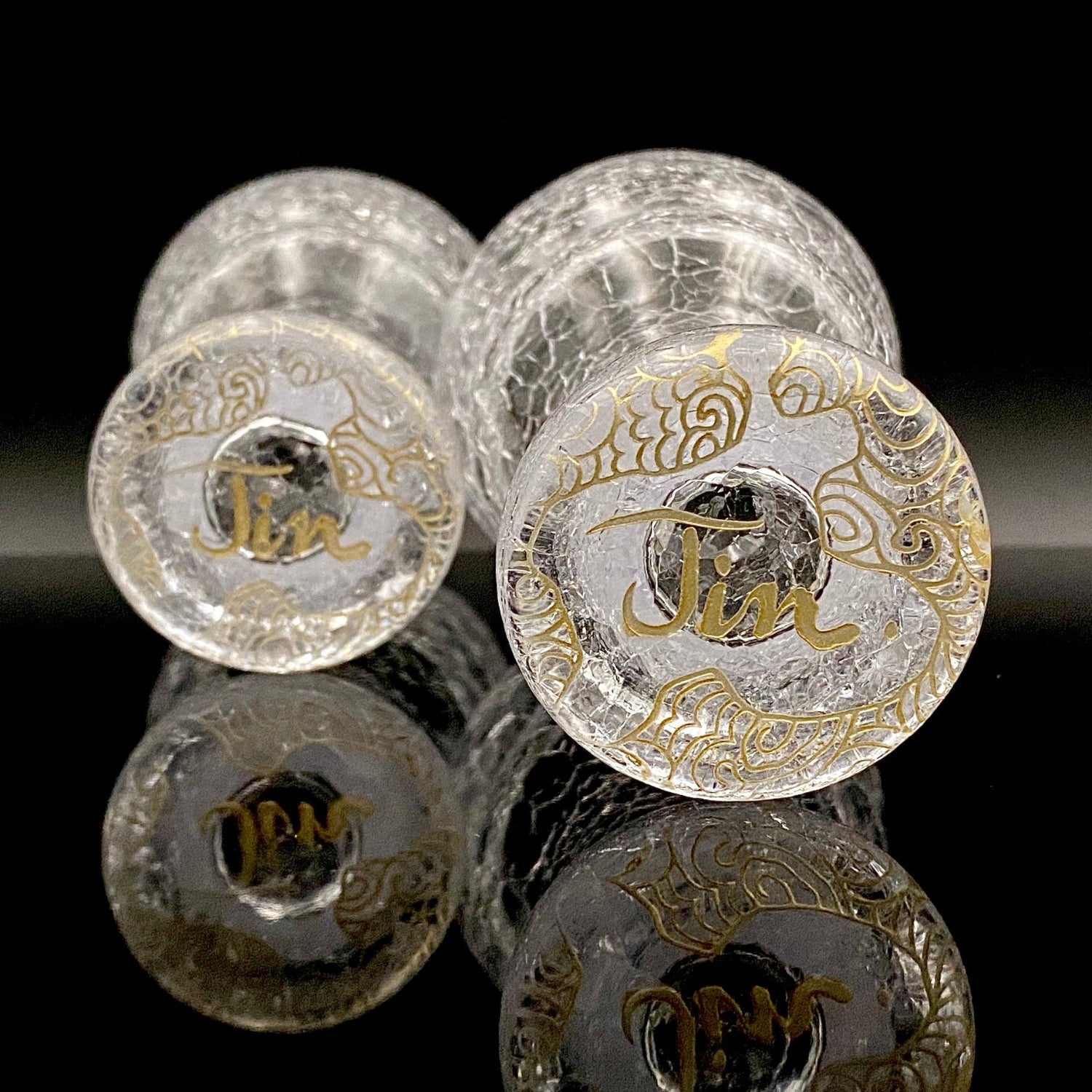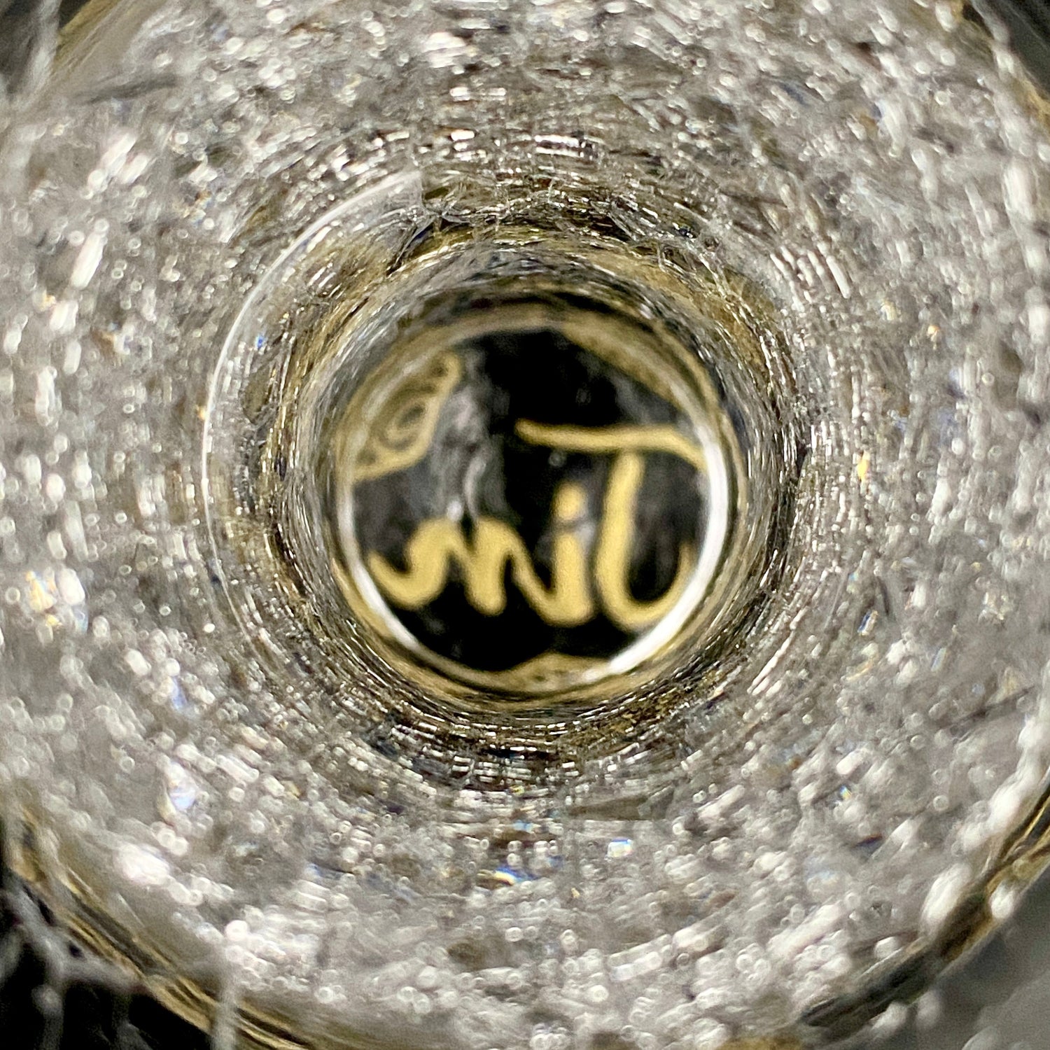 造形は、胴部が上下二段の丸い膨らみで構成され、中央部で一度くびれを持たせた深甚紋を思わせるユニークなシェイプが特徴的です。そして、グラス底の裏側には、金彩で繊細な唐草文様と共に、作家のサインである『Jin』の文字が華やかに描かれています。また、グラスの内側にも金彩のアクセントが確認できます。この金彩の装飾が、単なる酒盃を超えた、工芸品としての高い価値を与えています。