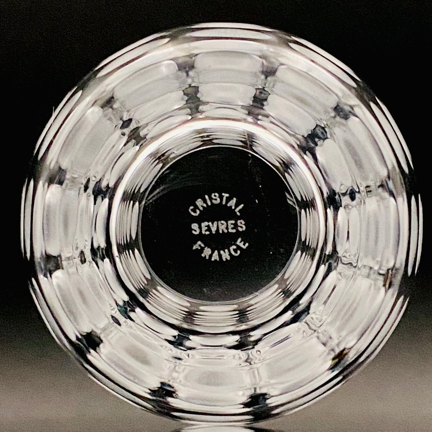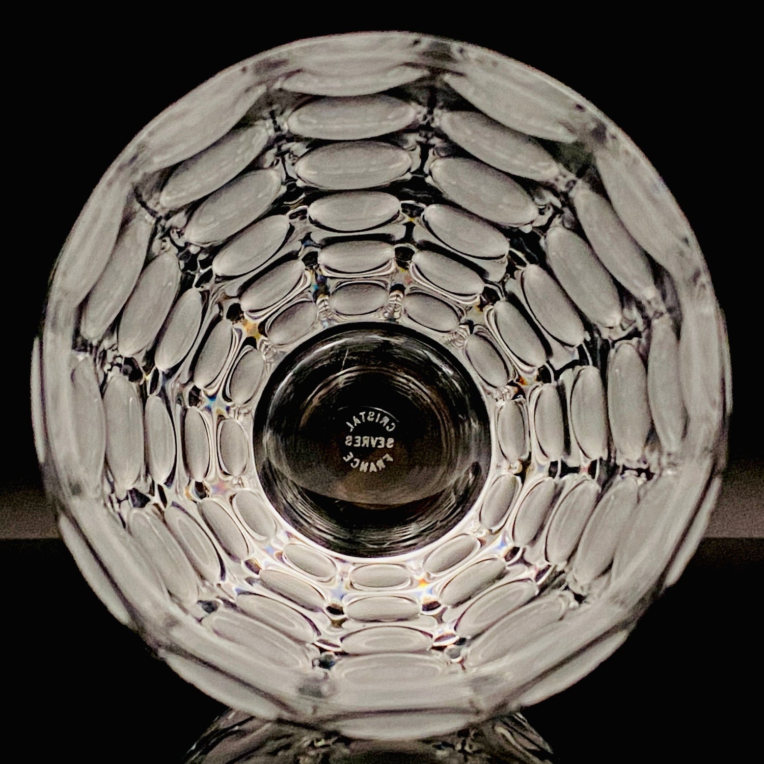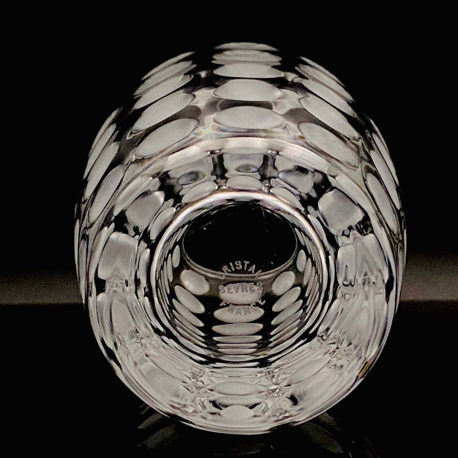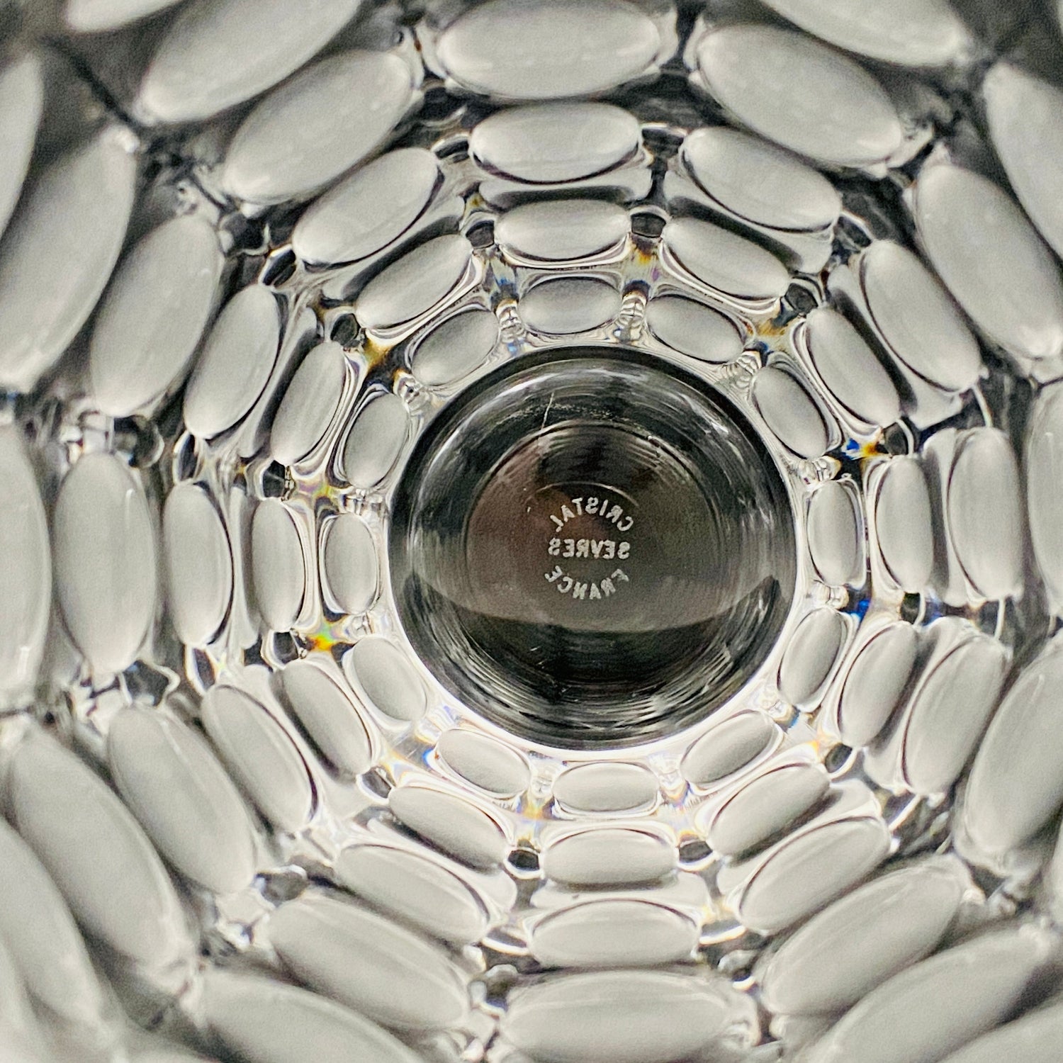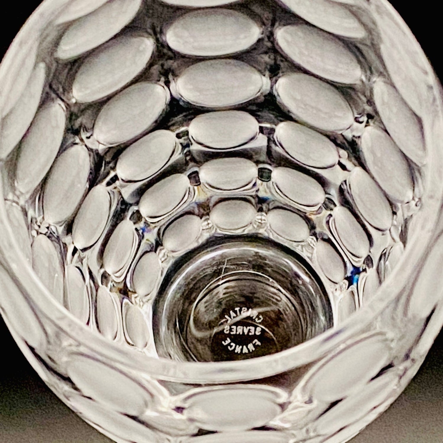 本品のデザインは、表面全体に均等に配された丸い凹凸と、その表面を柔らかなフロスト(すりガラス)加工で仕上げた、モダンな魅力を持つ逸品です。この加工法が、光を優しく拡散し、グラス全体に幻想的で涼しげな質感を与えています。台座には『CRISTAL SÈVRES FRANCE』の刻印が確認でき、その品質と歴史を保証しています。この幾何学的でモダンなデザインと、刻印の形式から、本作品はセーブルが伝統的な技術を踏襲しつつ、モダンデザインを積極的に取り入れていた1960年代後半から1970年代にかけて制作されたと推測されます。